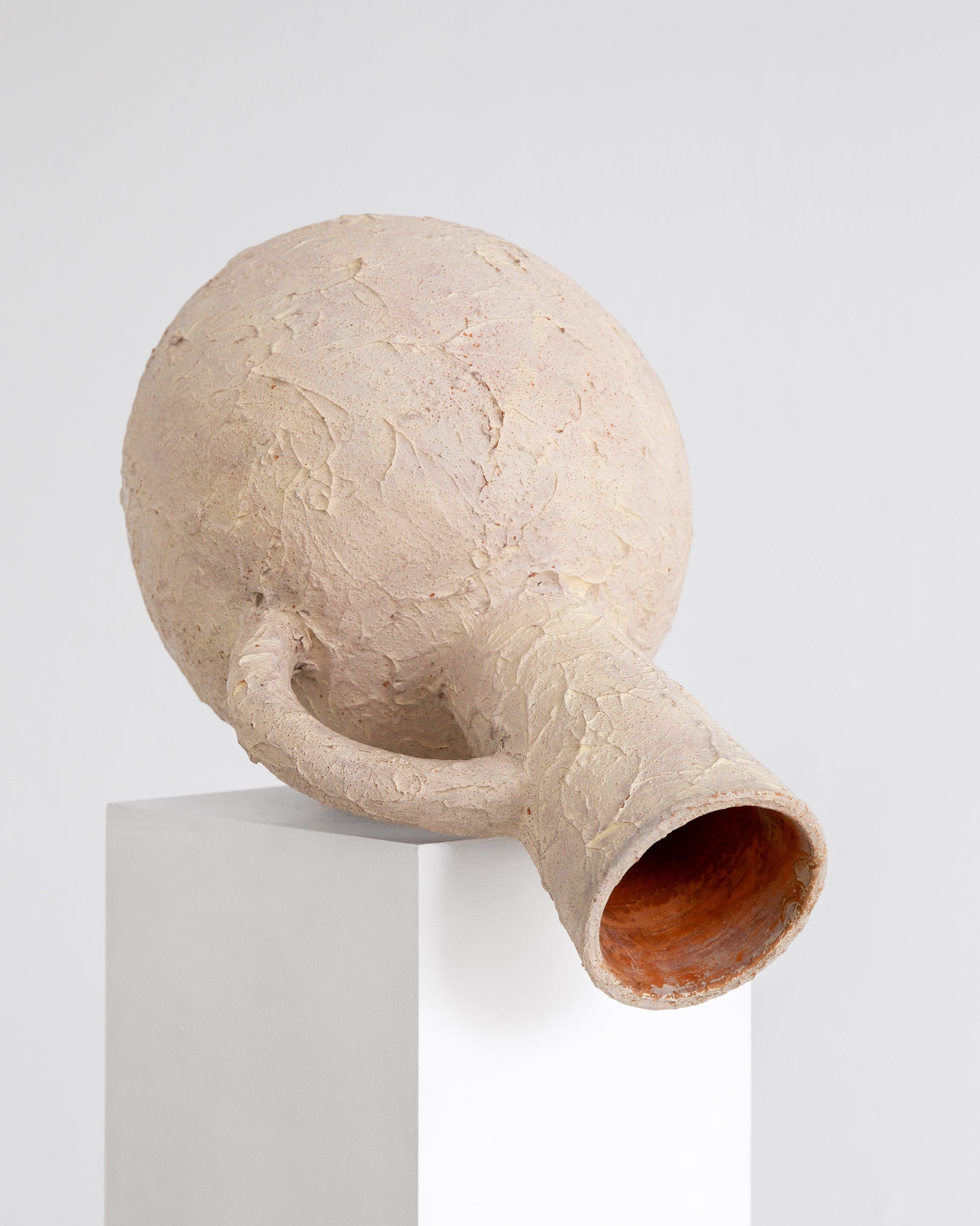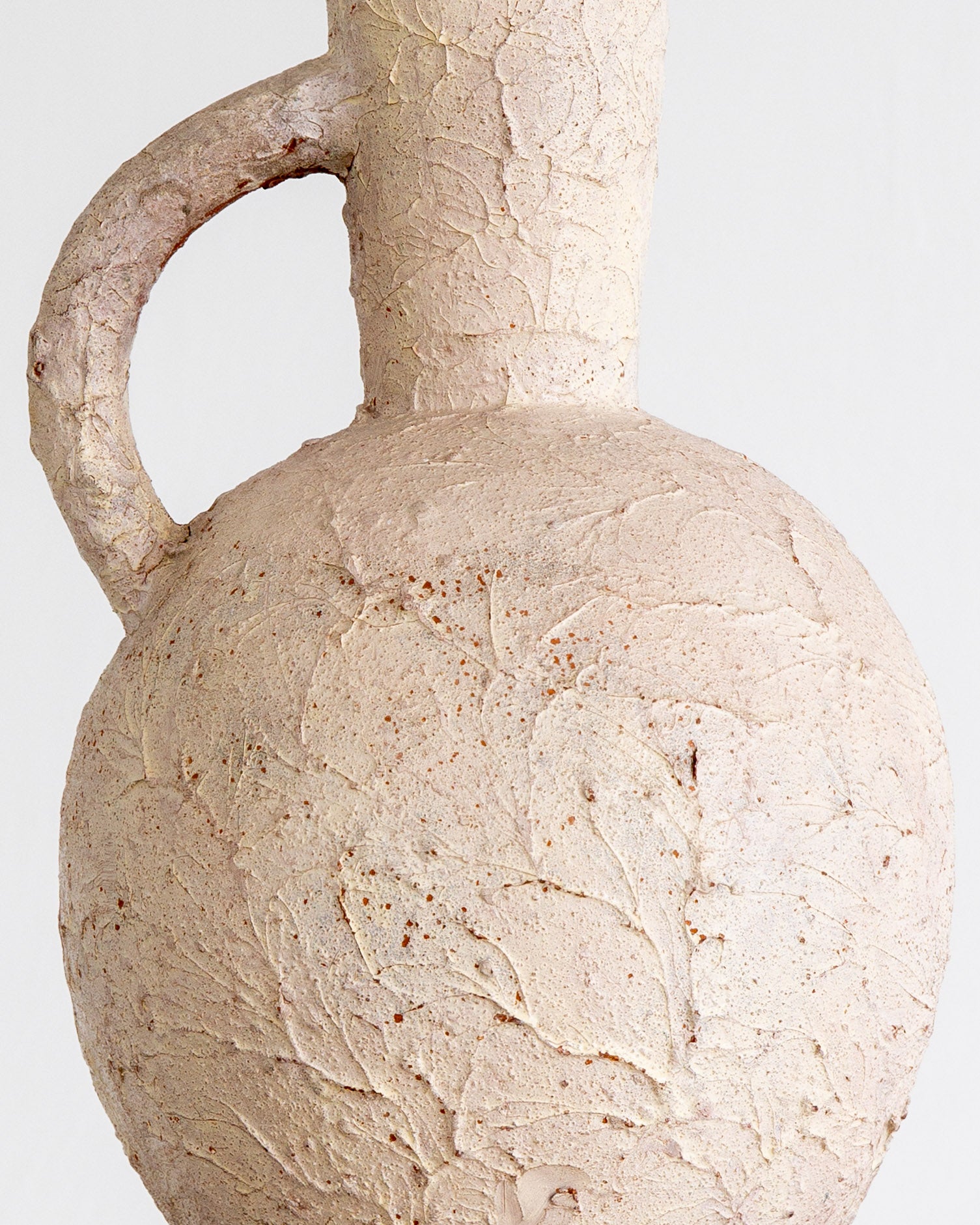 Large handcrafted earthenware floor vase by Andersson & Johansson, Höganäs, Sweden, 1940s–50s. Impressive scale with bulbous body, cylindrical neck, and curved handle. Distinctive textured surface with deep relief decoration beneath a matte cream-beige glaze accented with brown flecking throughout.