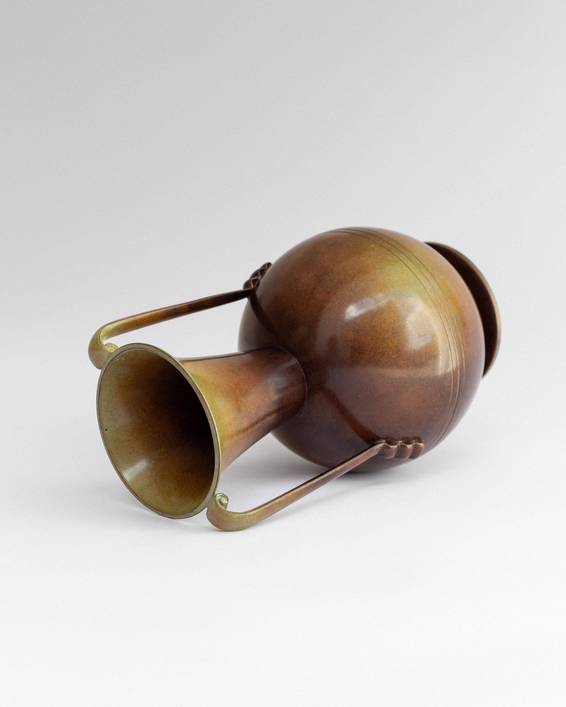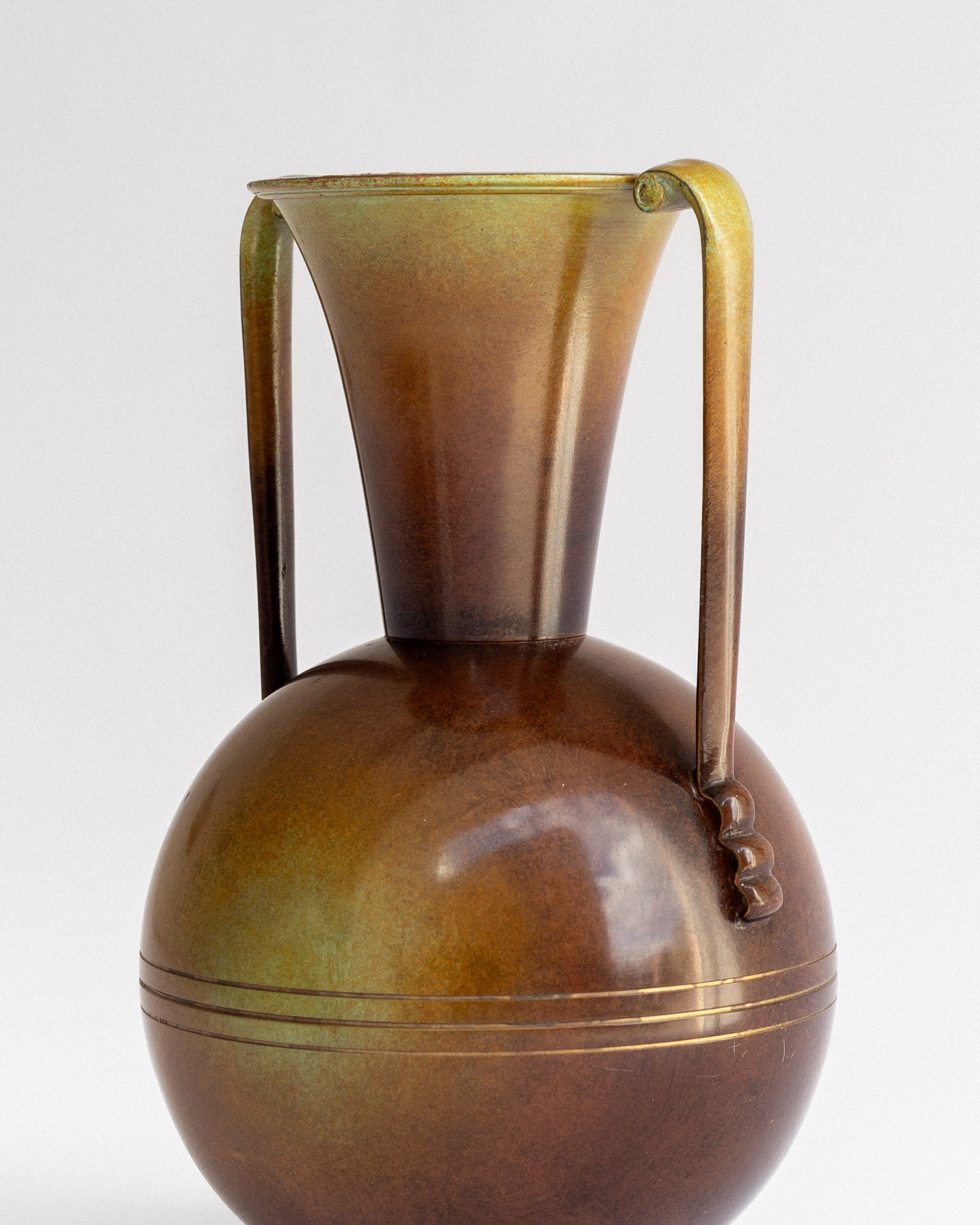 Bronze patinated metal vase by Ystad-Metall from the 1930s–40s, presumed to be designed by Carl-Einar Borgström. Gracefully arched handles, fine ribbed detailing around the body, and a warm finish shifting from deep brown to golden green.