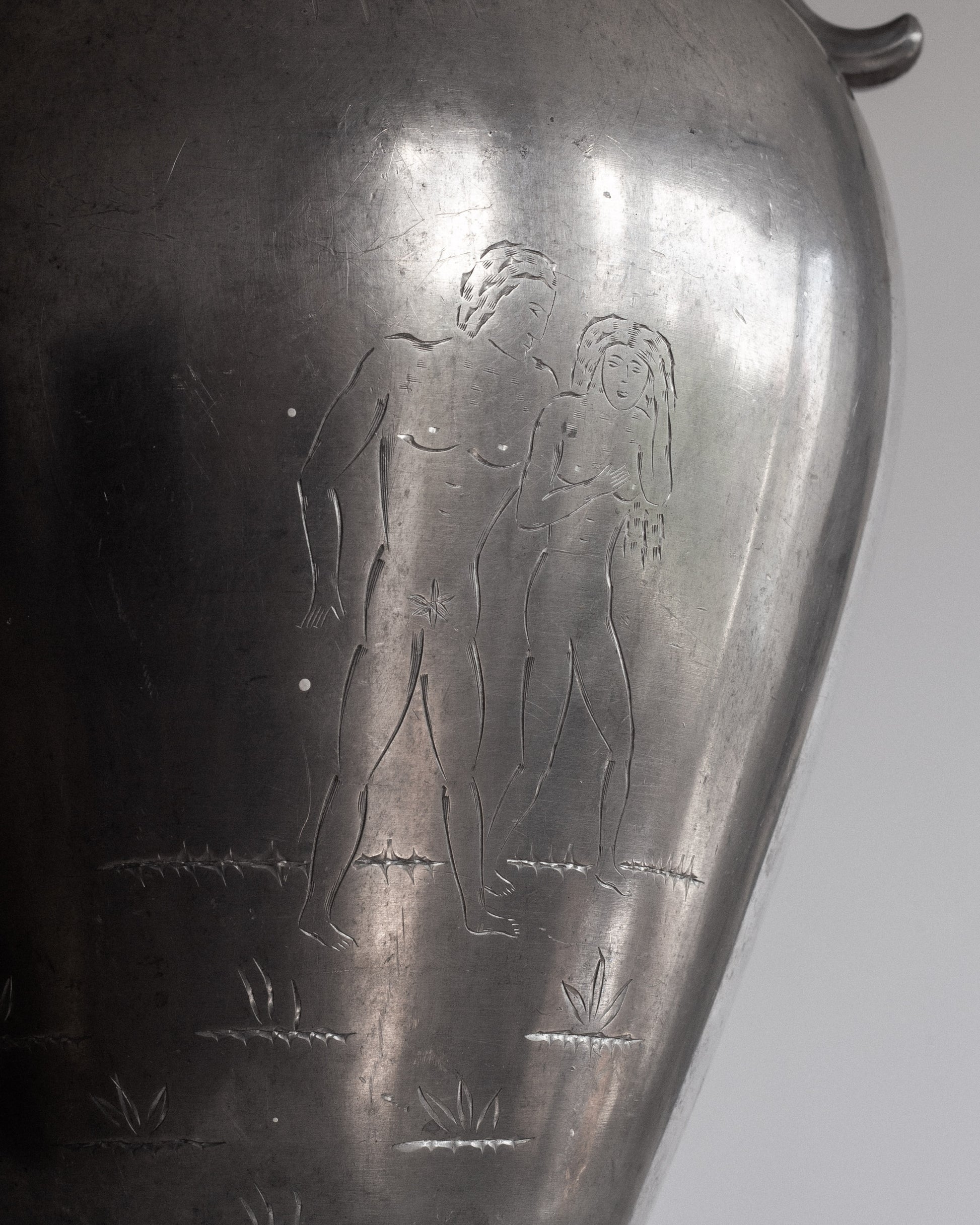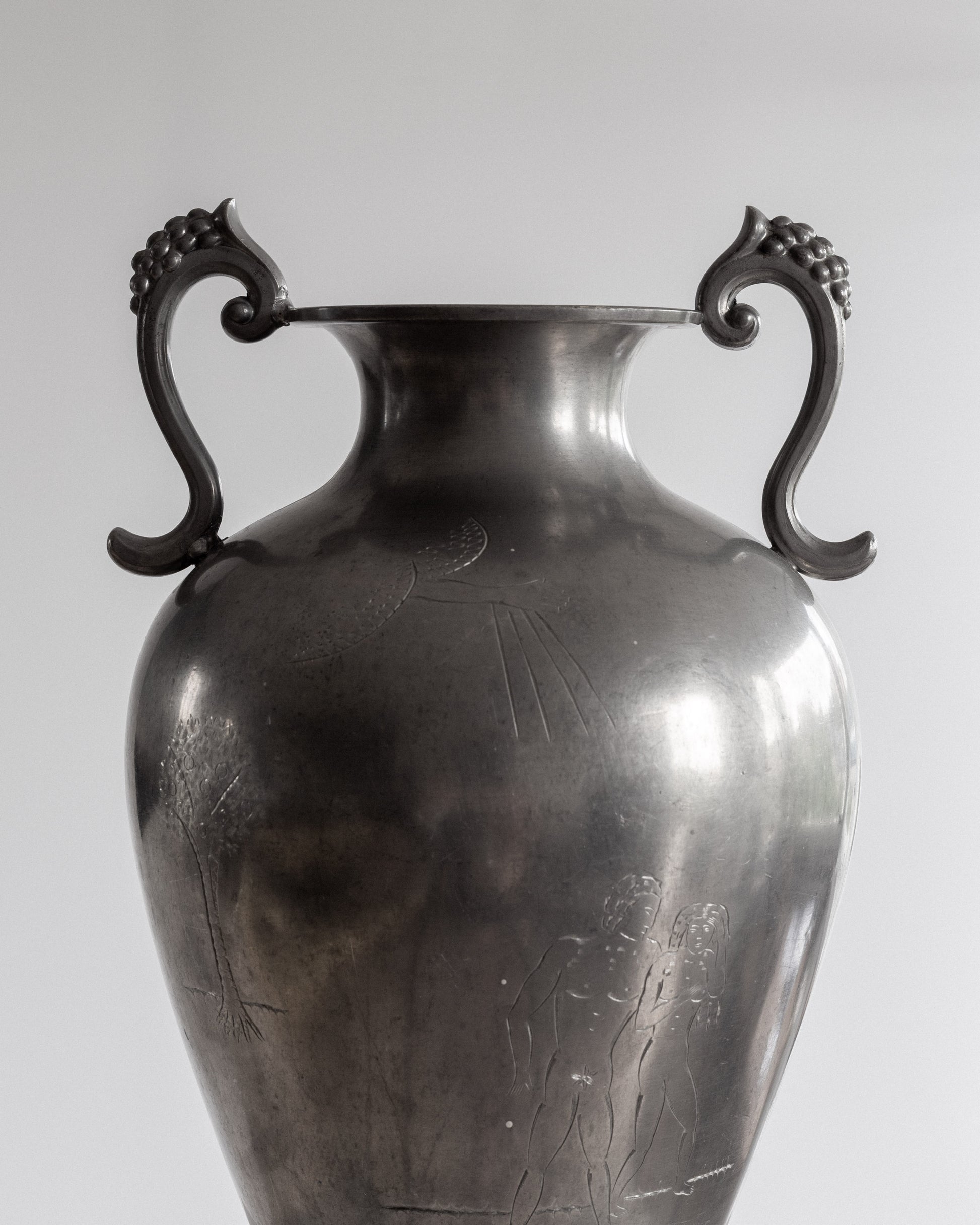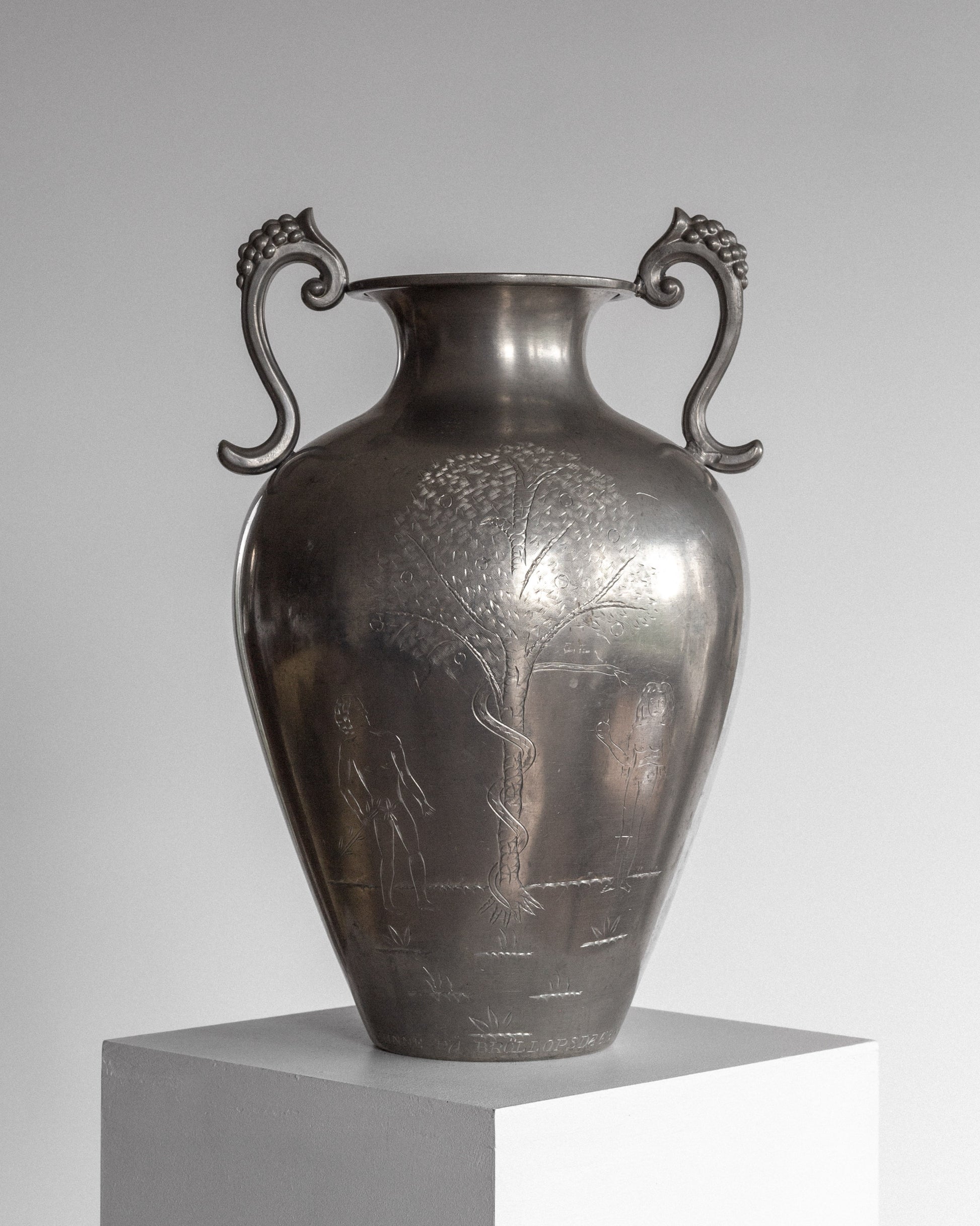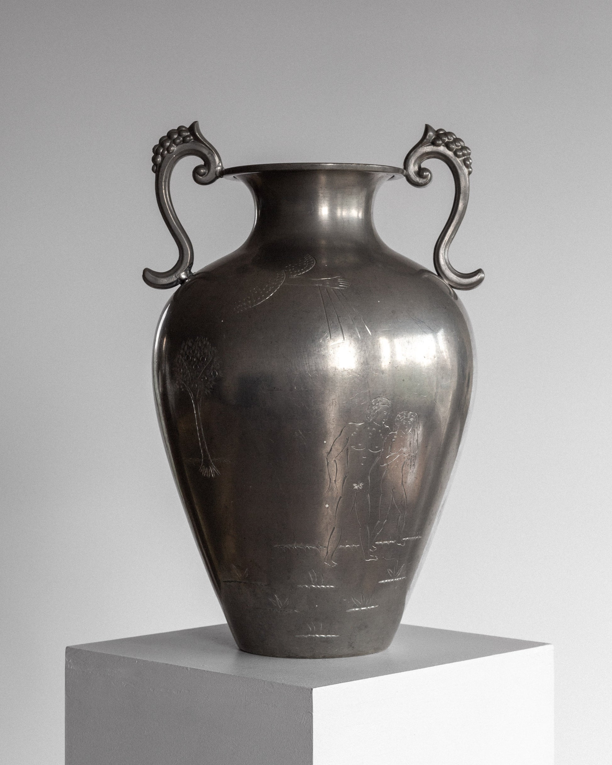 A remarkable Swedish pewter vase featuring beautiful engravings depicting Adam and Eve in the Garden of Eden. This large piece showcases traditional Scandinavian Art Deco design with its elegant amphora form and decorative grape-motif handles.