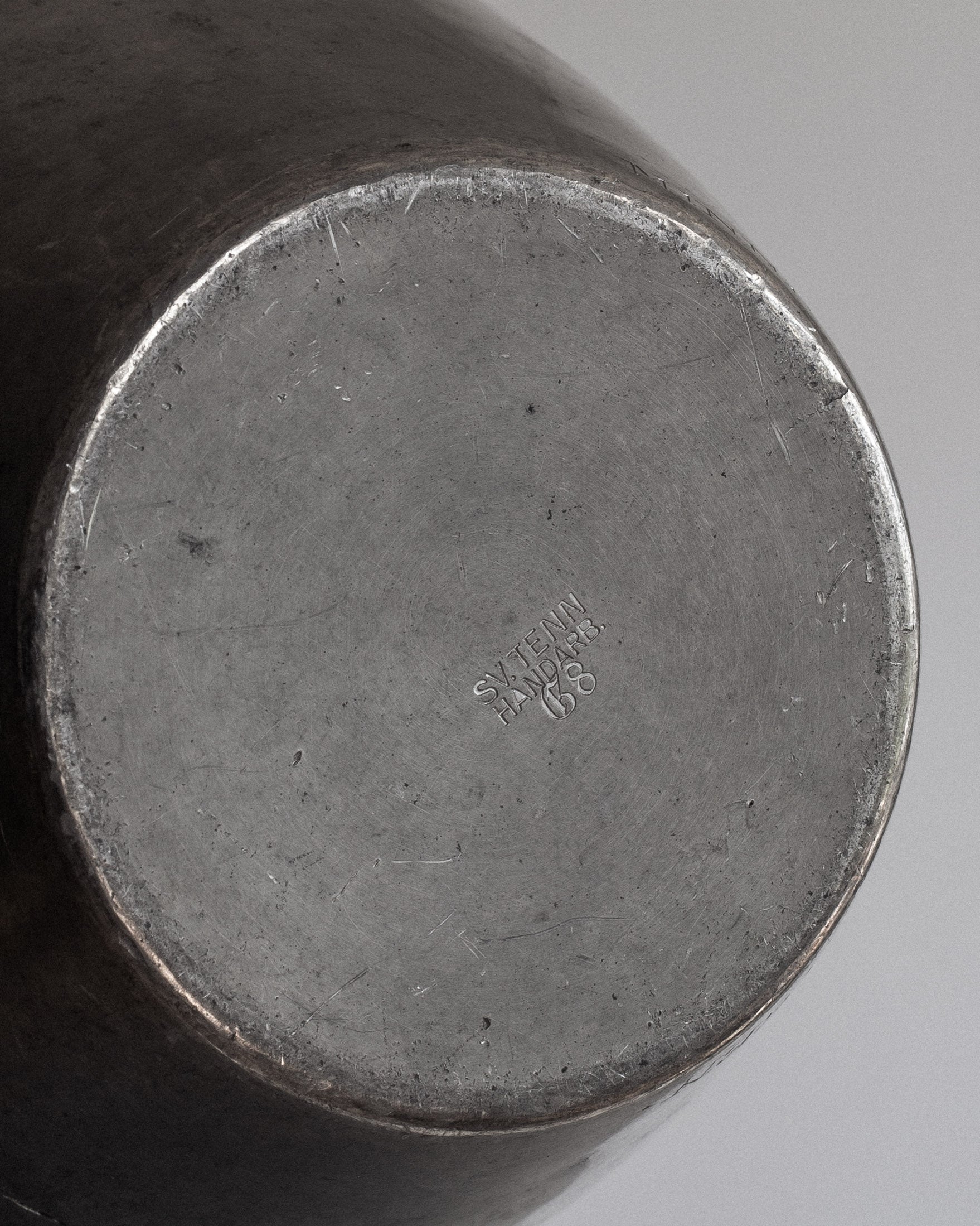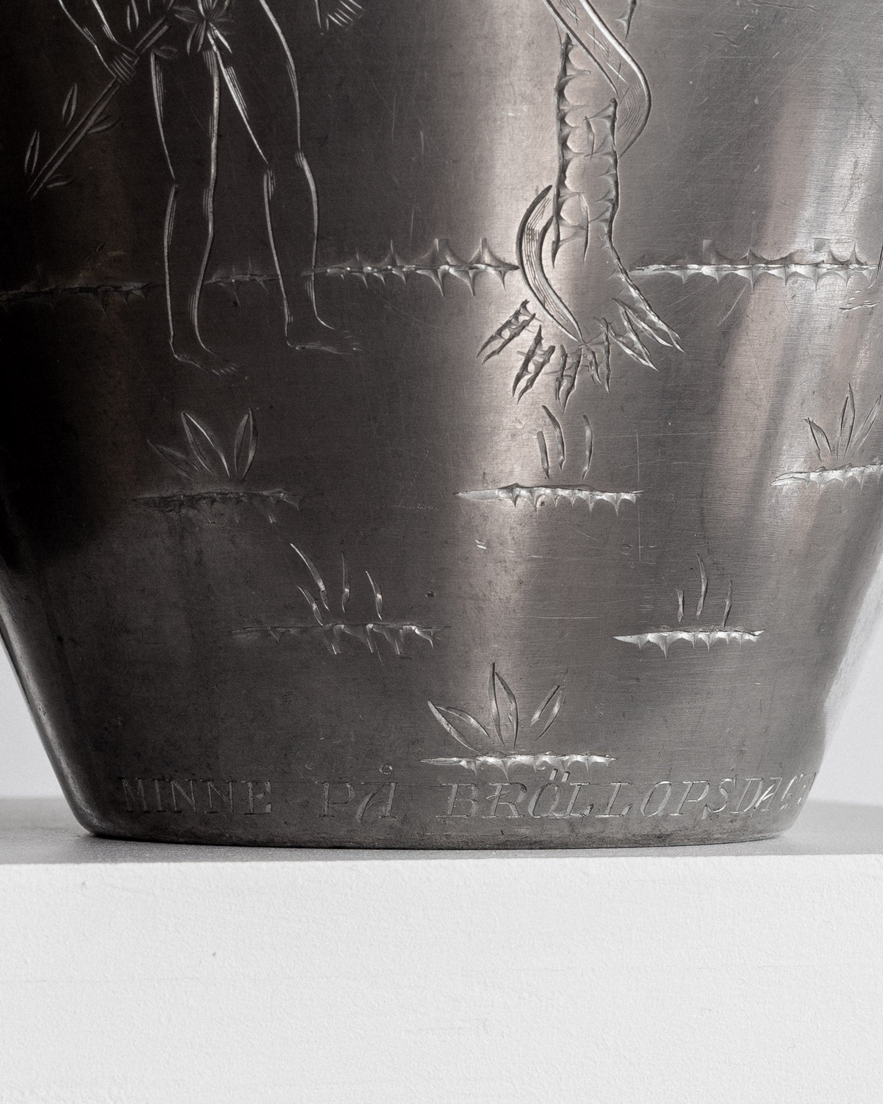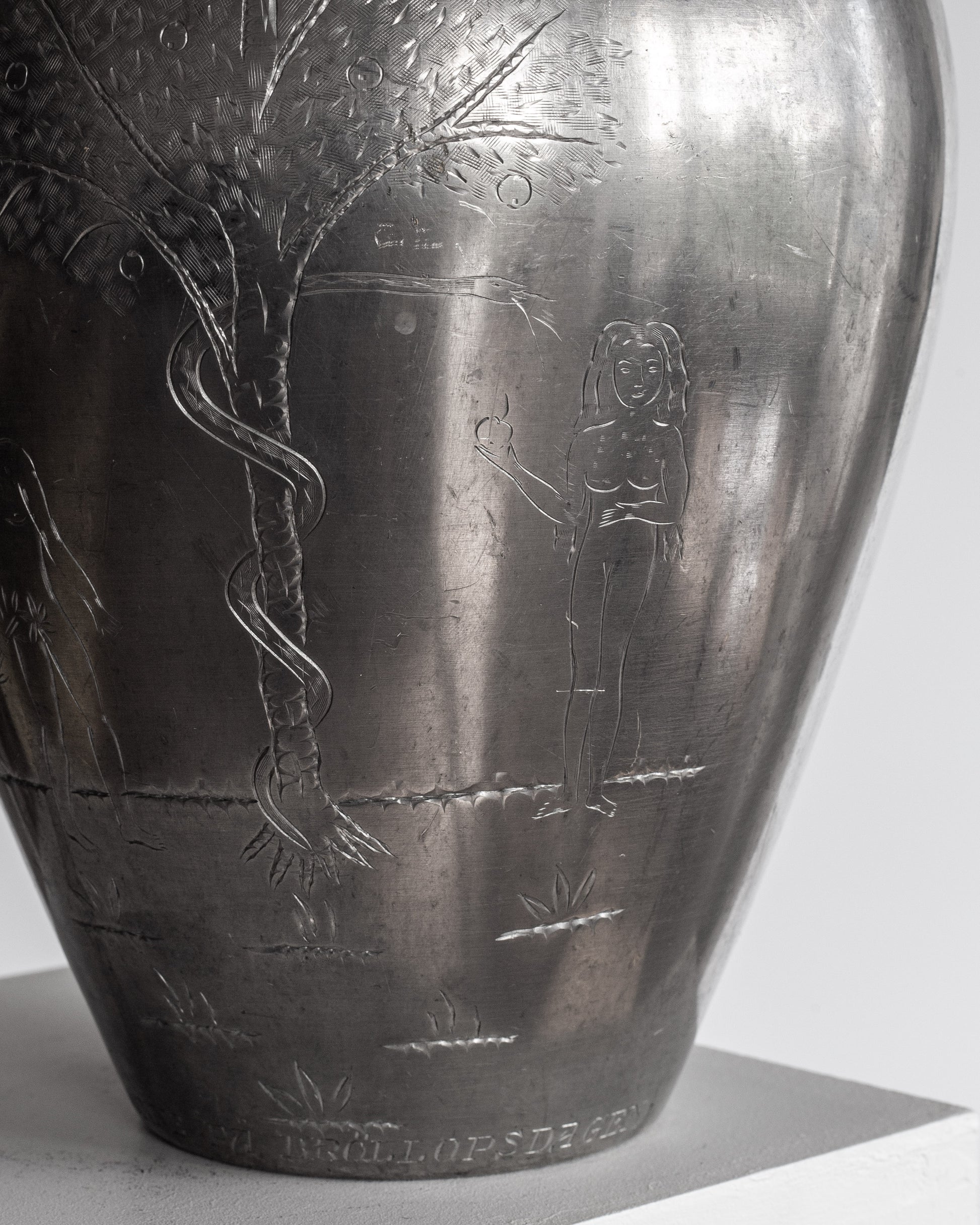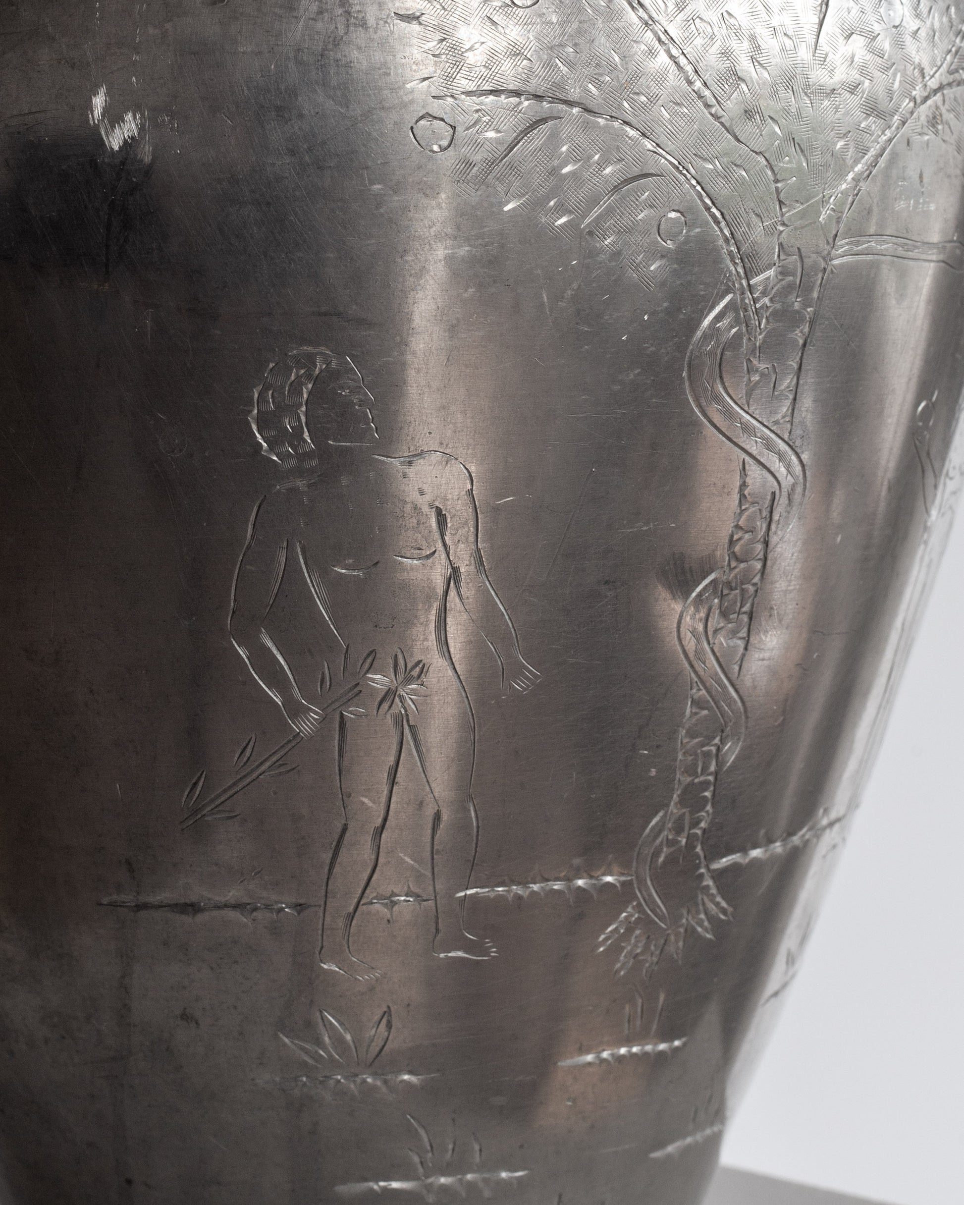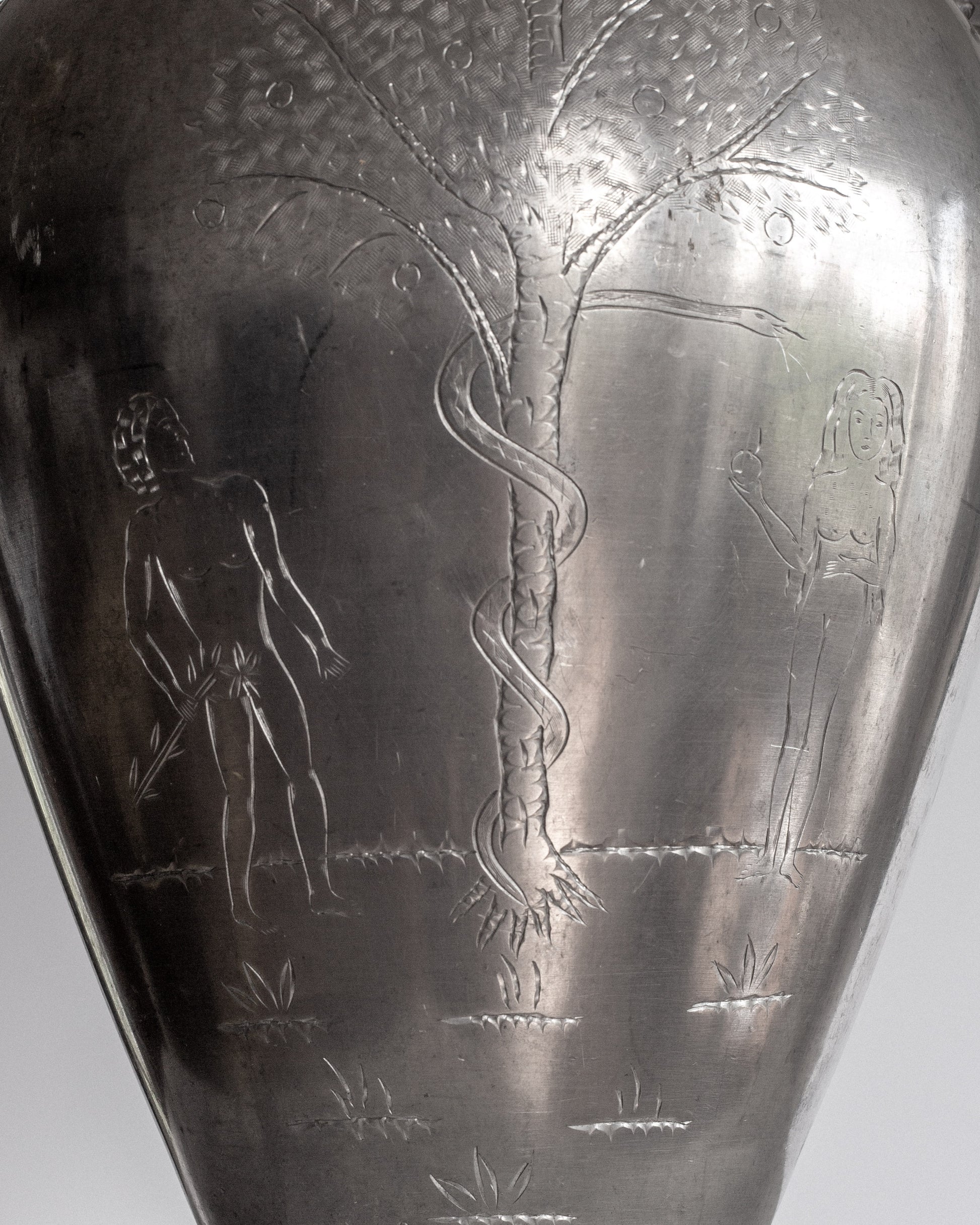 A remarkable Swedish pewter vase featuring beautiful engravings depicting Adam and Eve in the Garden of Eden. This large piece showcases traditional Scandinavian Art Deco design with its elegant amphora form and decorative grape-motif handles.