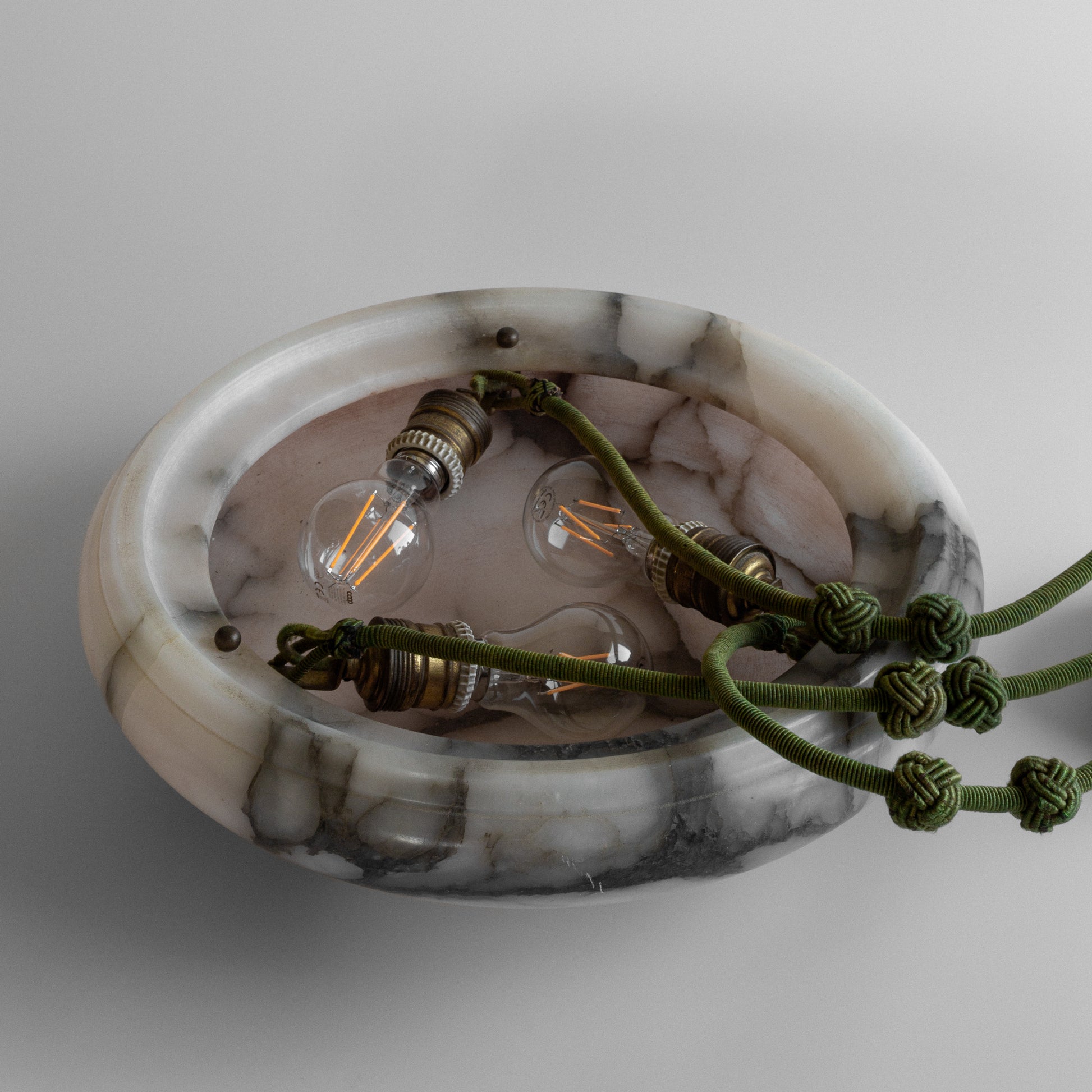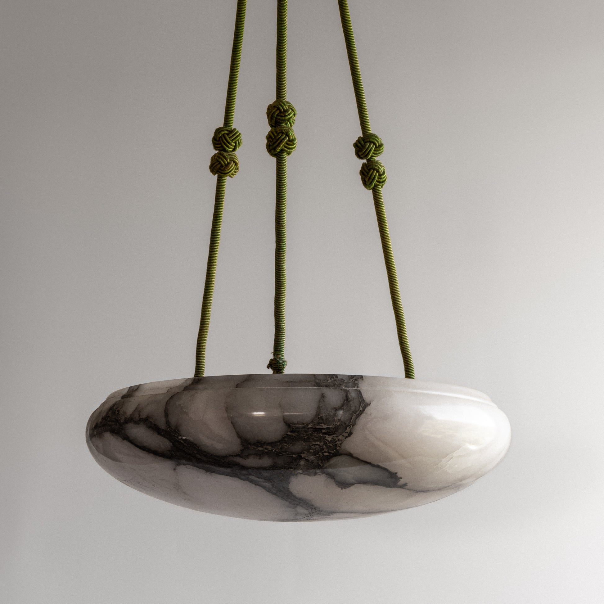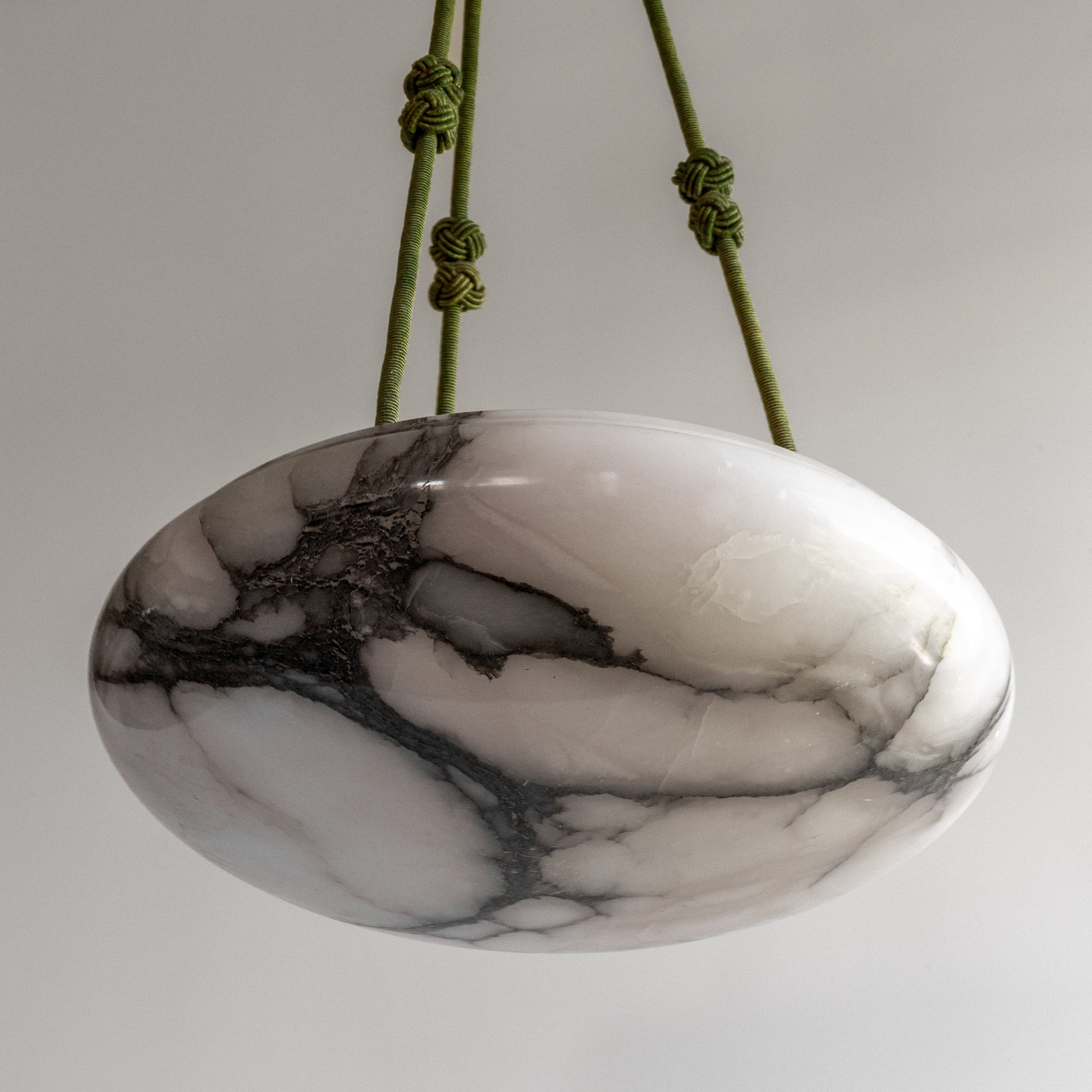 A majestic three light alabaster pendant from the heydays of the Art Deco era. Hand carved white natural stone with large charcoal gray and black natural veining.