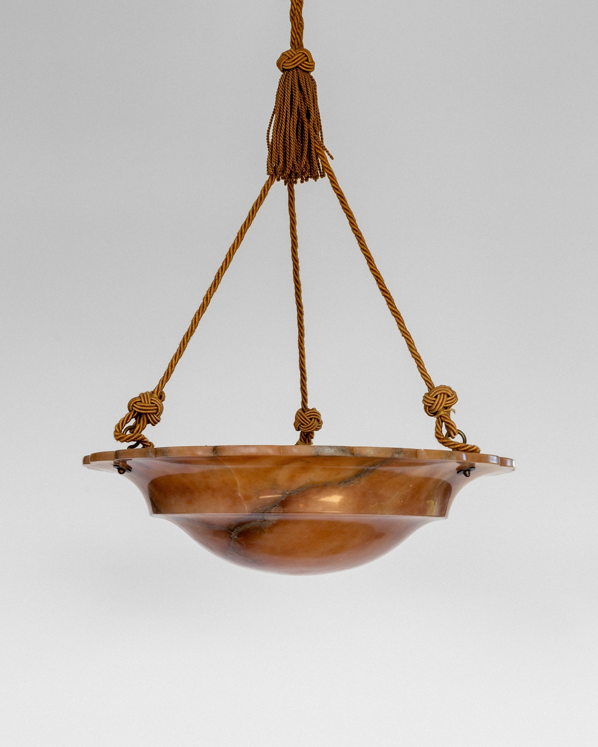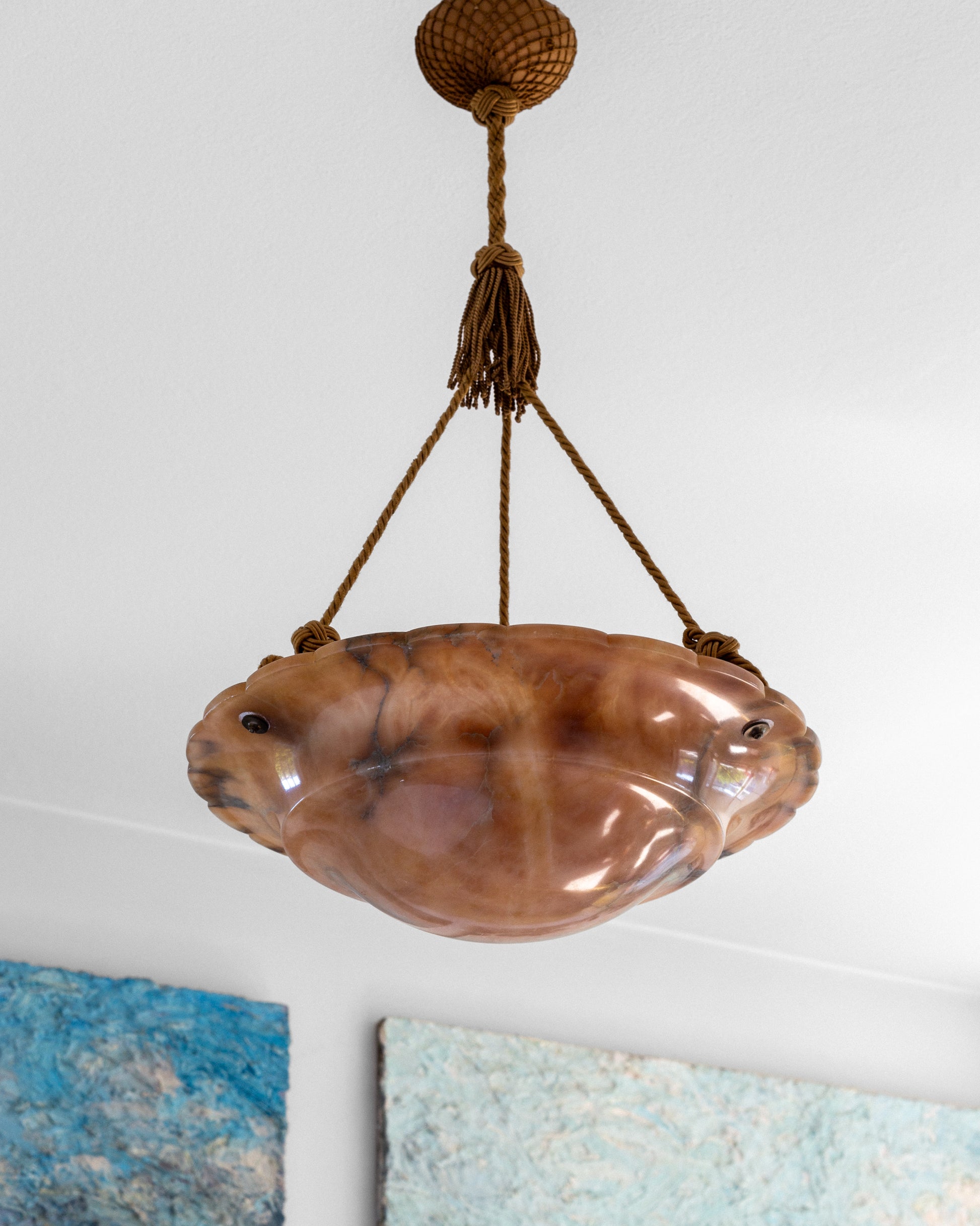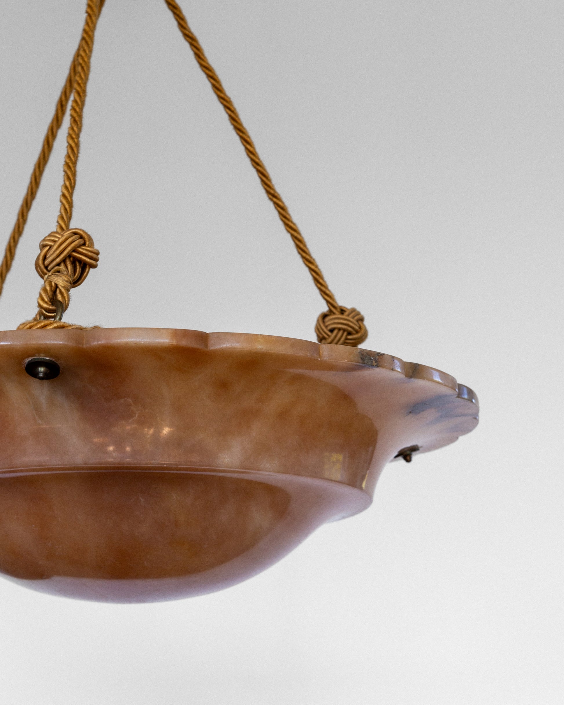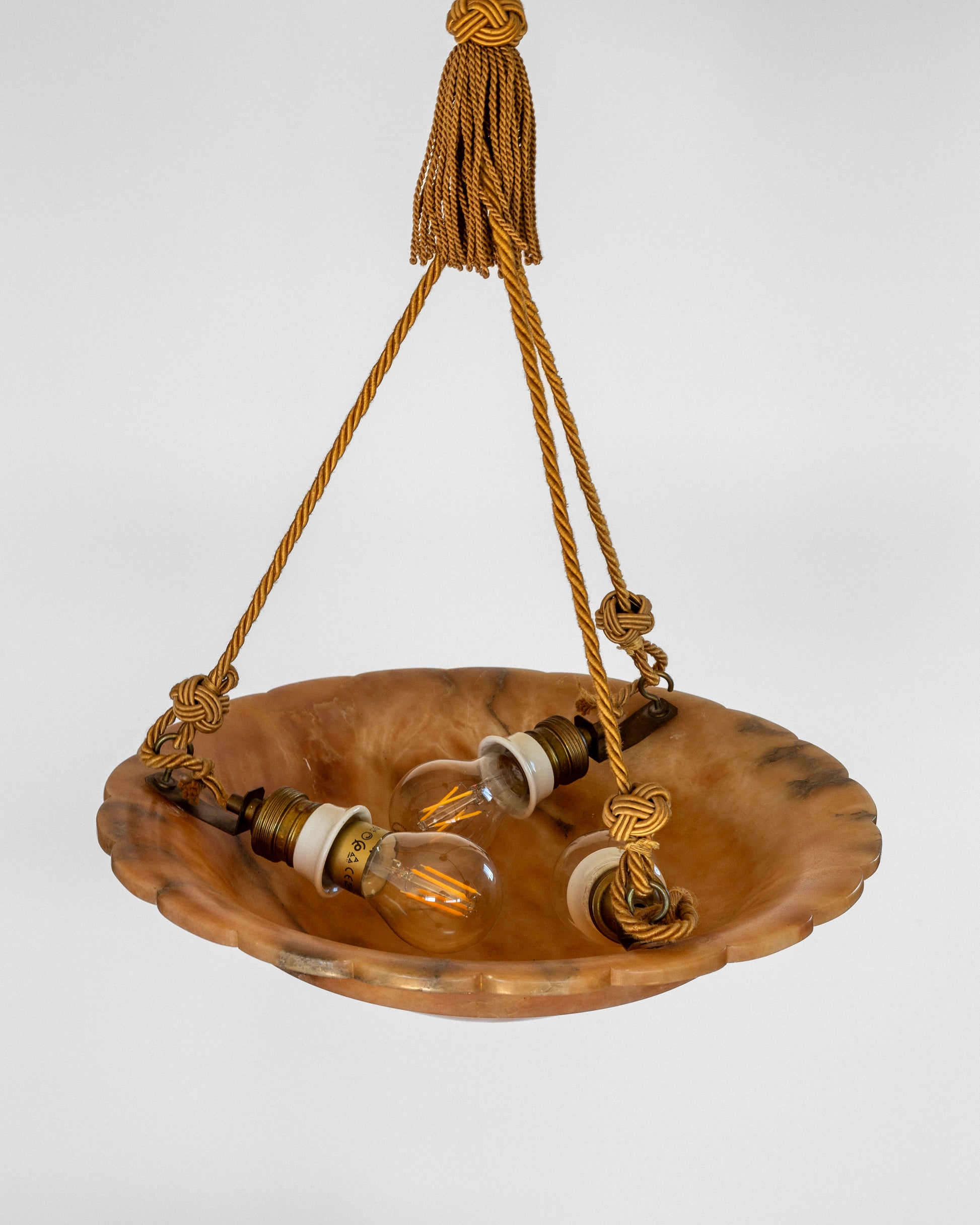 A large, majestic three light alabaster pendant from the heydays of the Art Deco era in Sweden. Hand carved natural stone with hues of orange, beige and brown. Very pleasant Neoclassical design with scalloped brim and original rope and canopy.