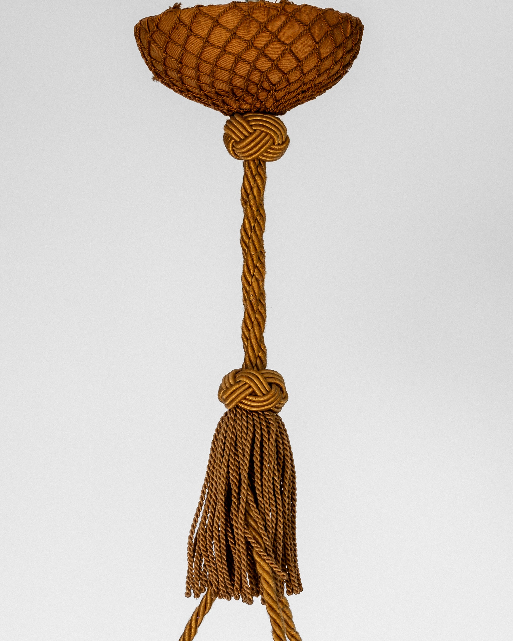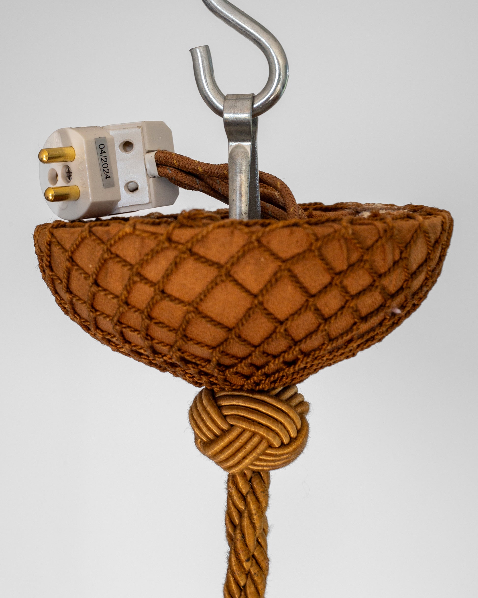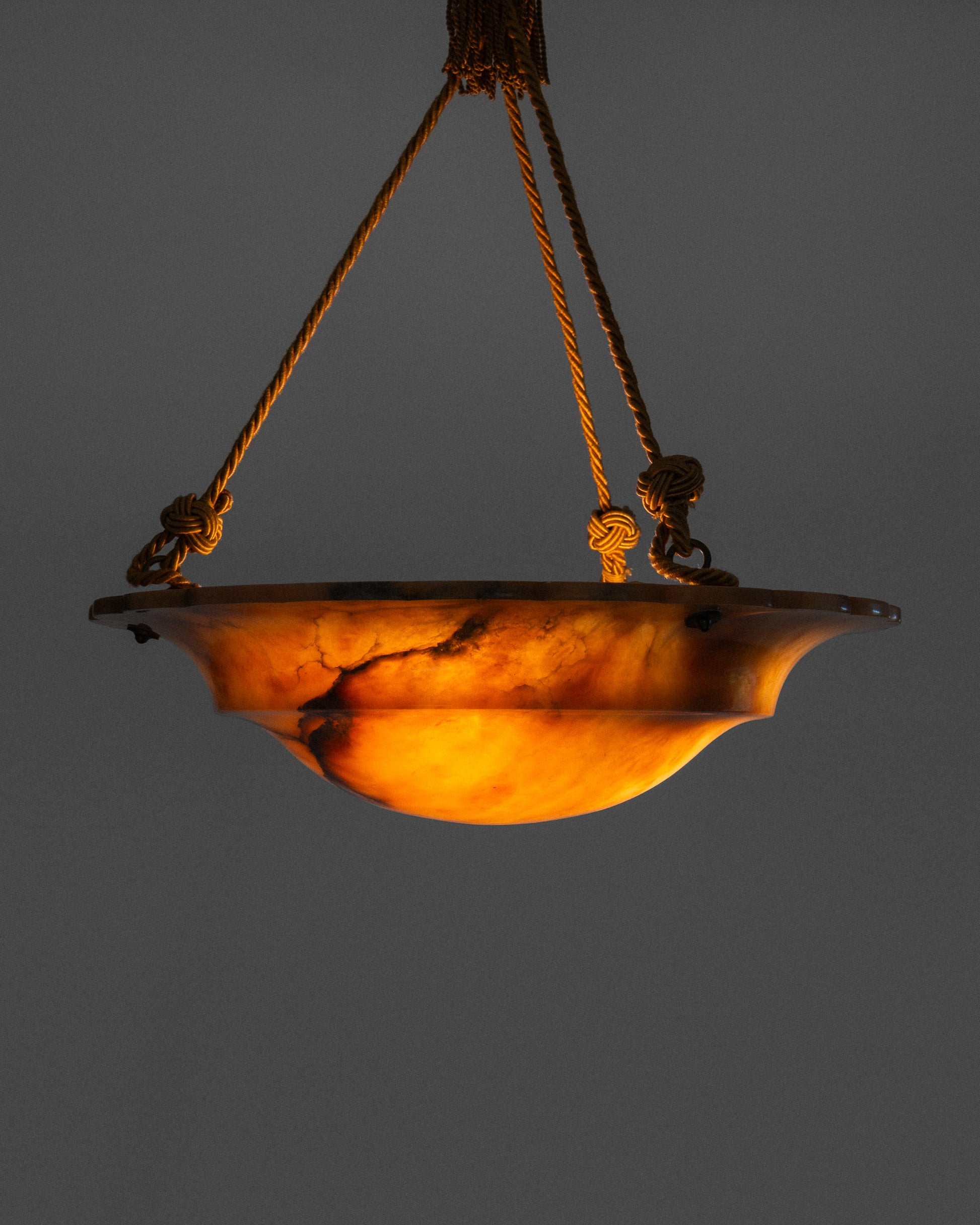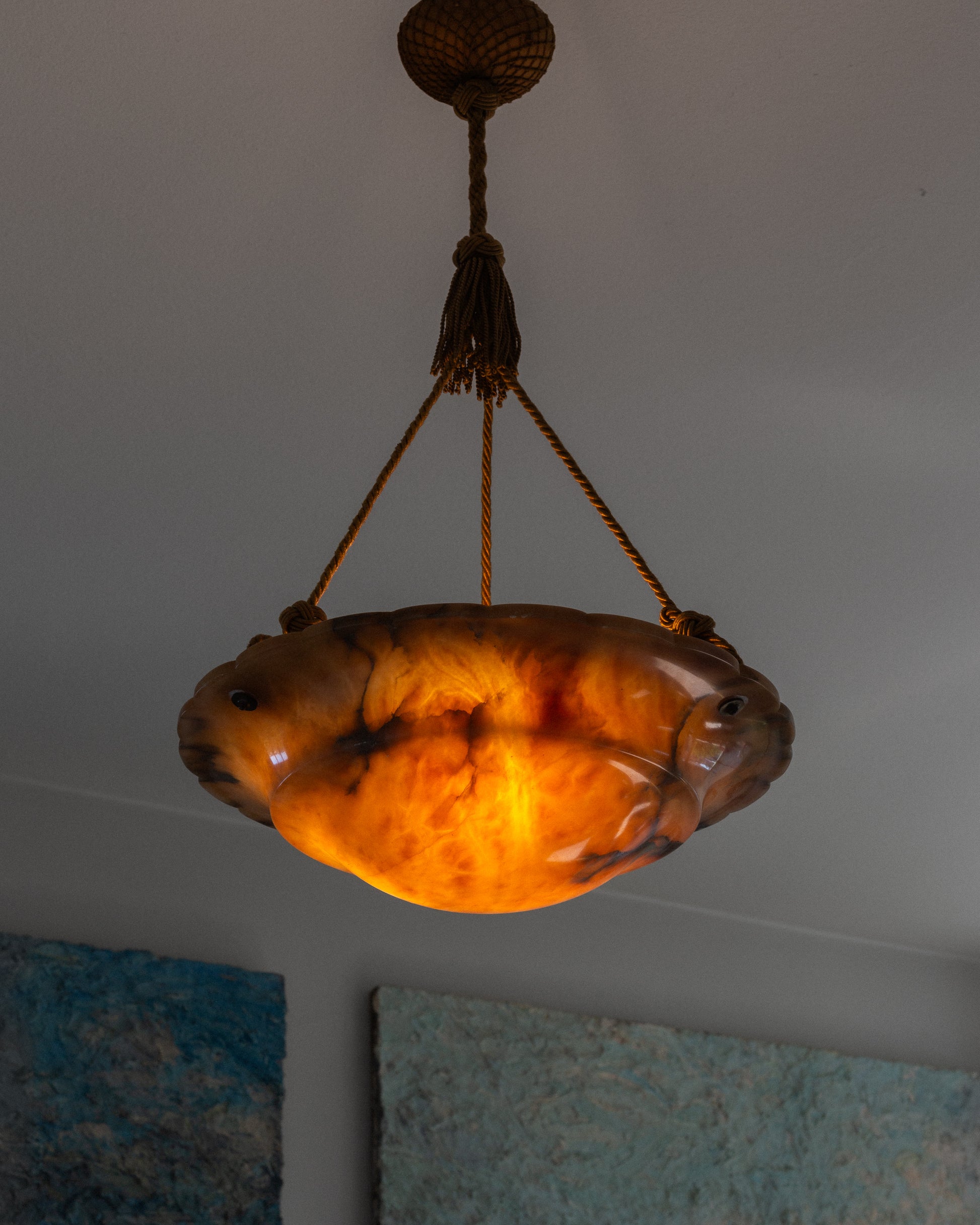 A large, majestic three light alabaster pendant from the heydays of the Art Deco era in Sweden. Hand carved natural stone with hues of orange, beige and brown. Very pleasant Neoclassical design with scalloped brim and original rope and canopy.
