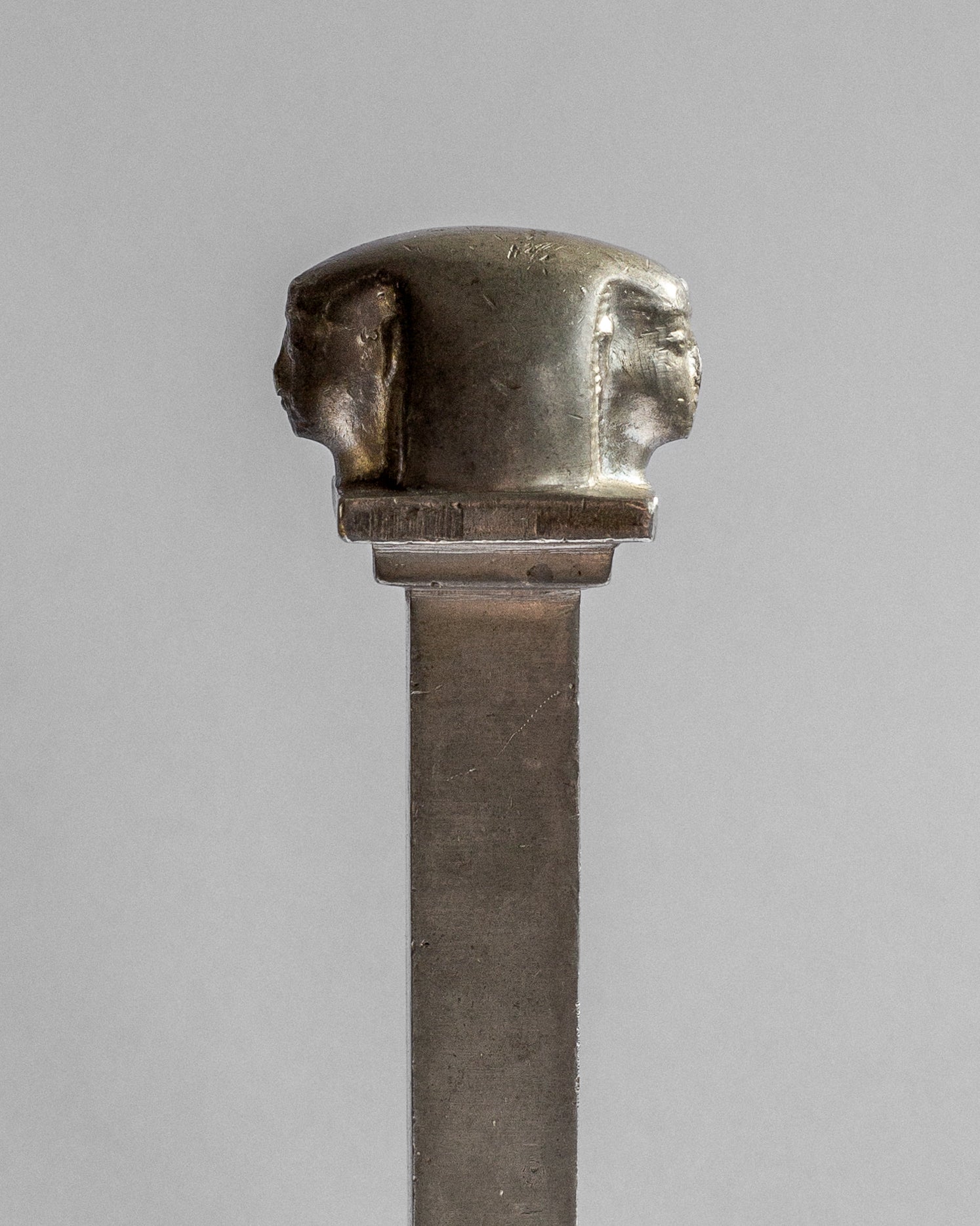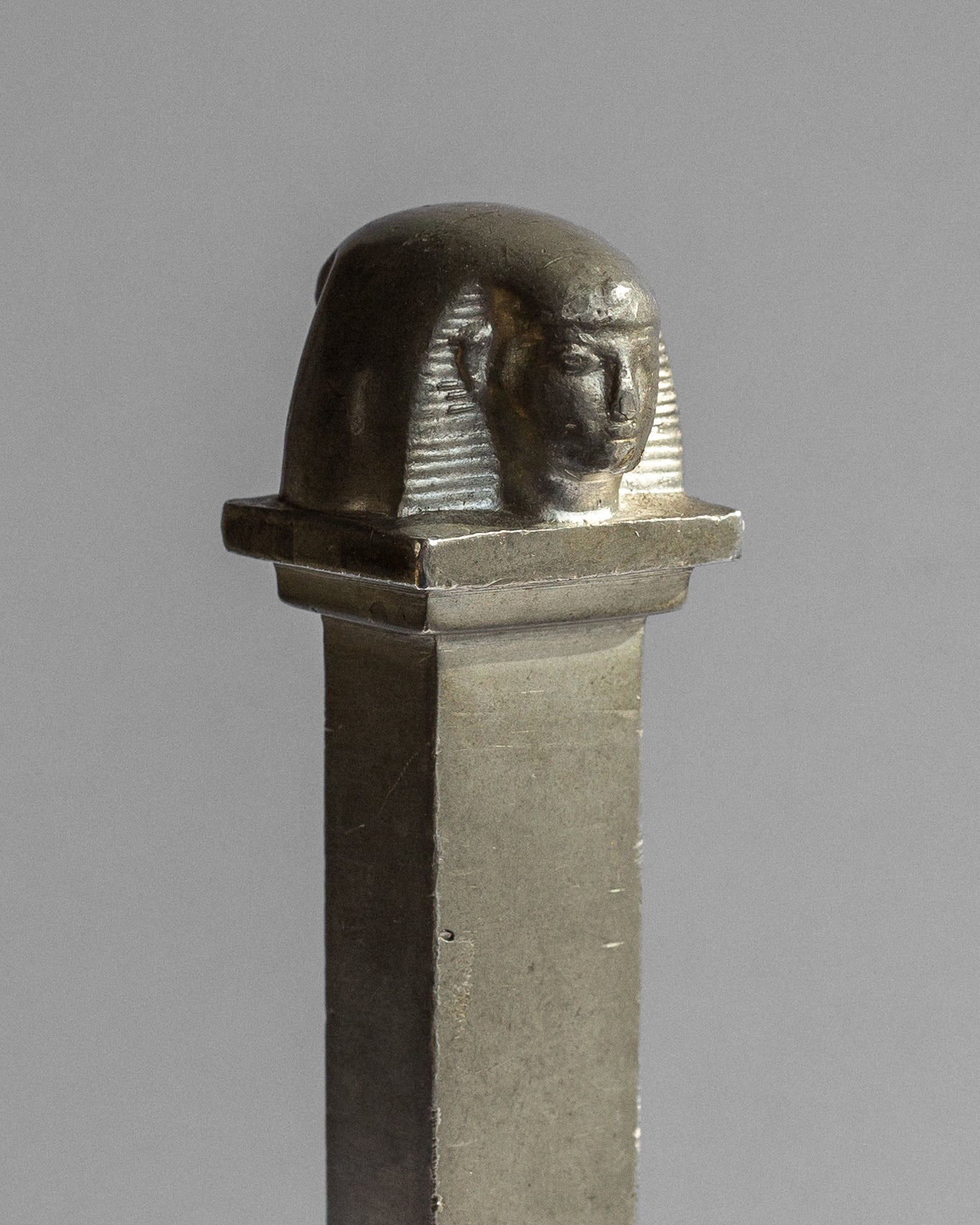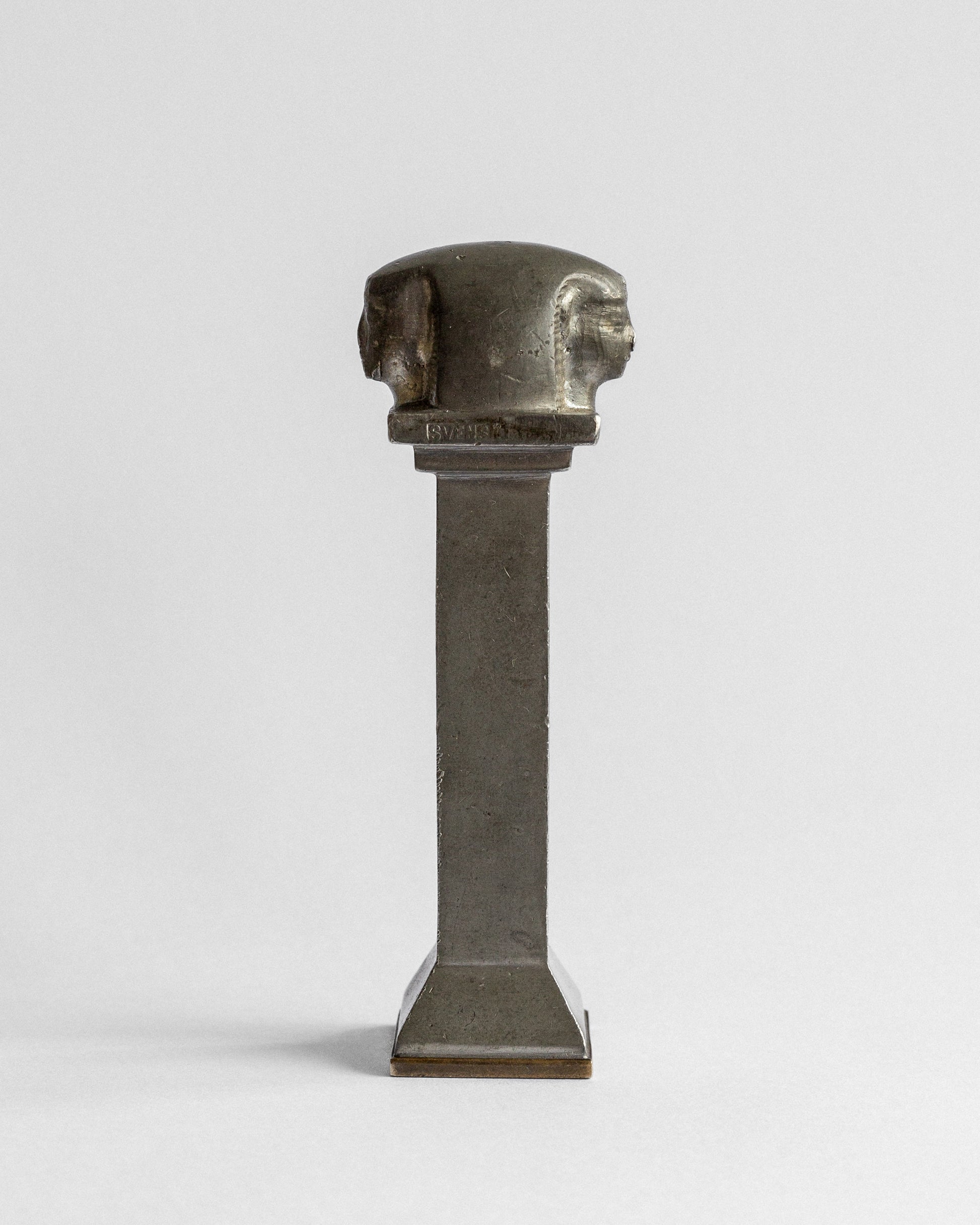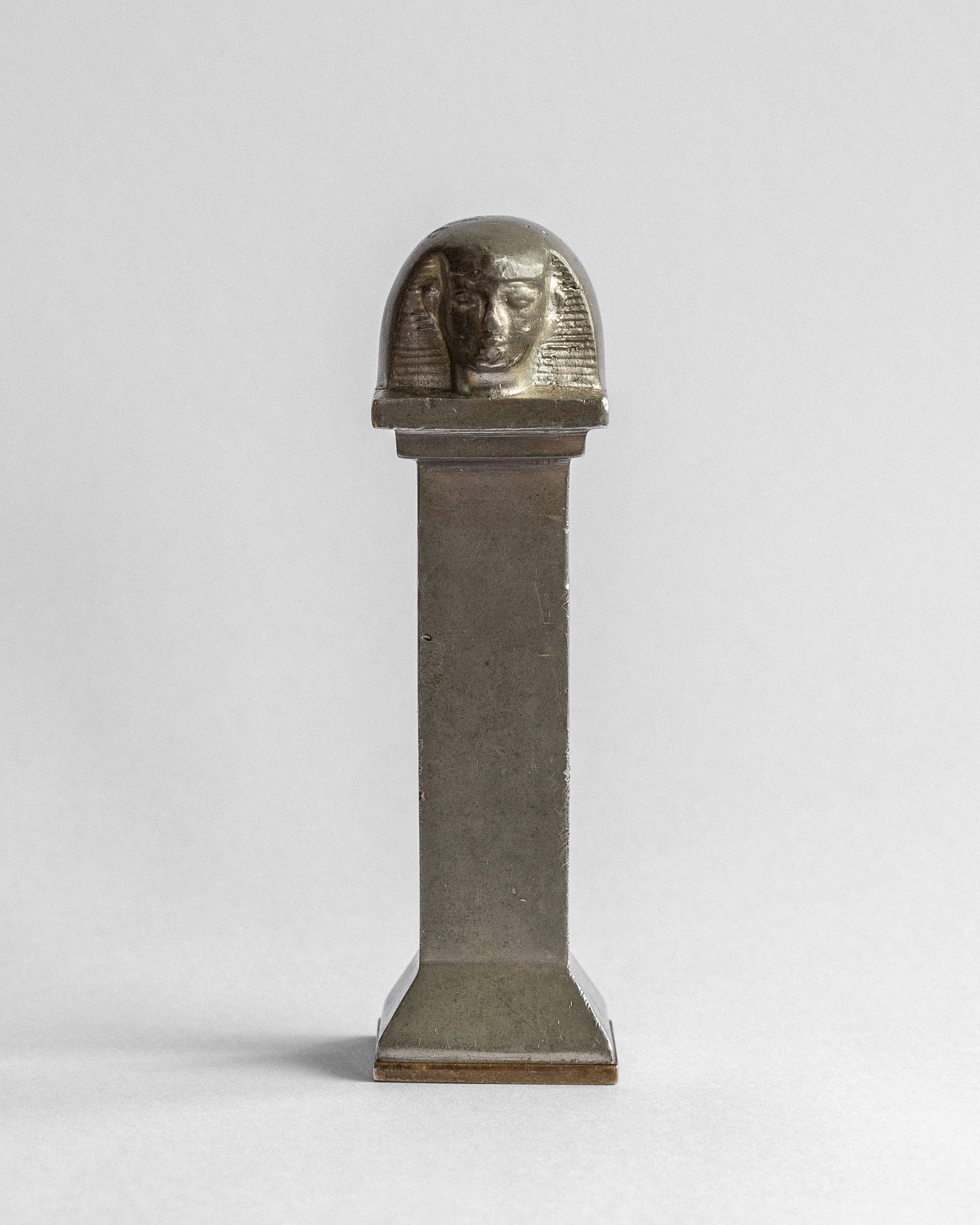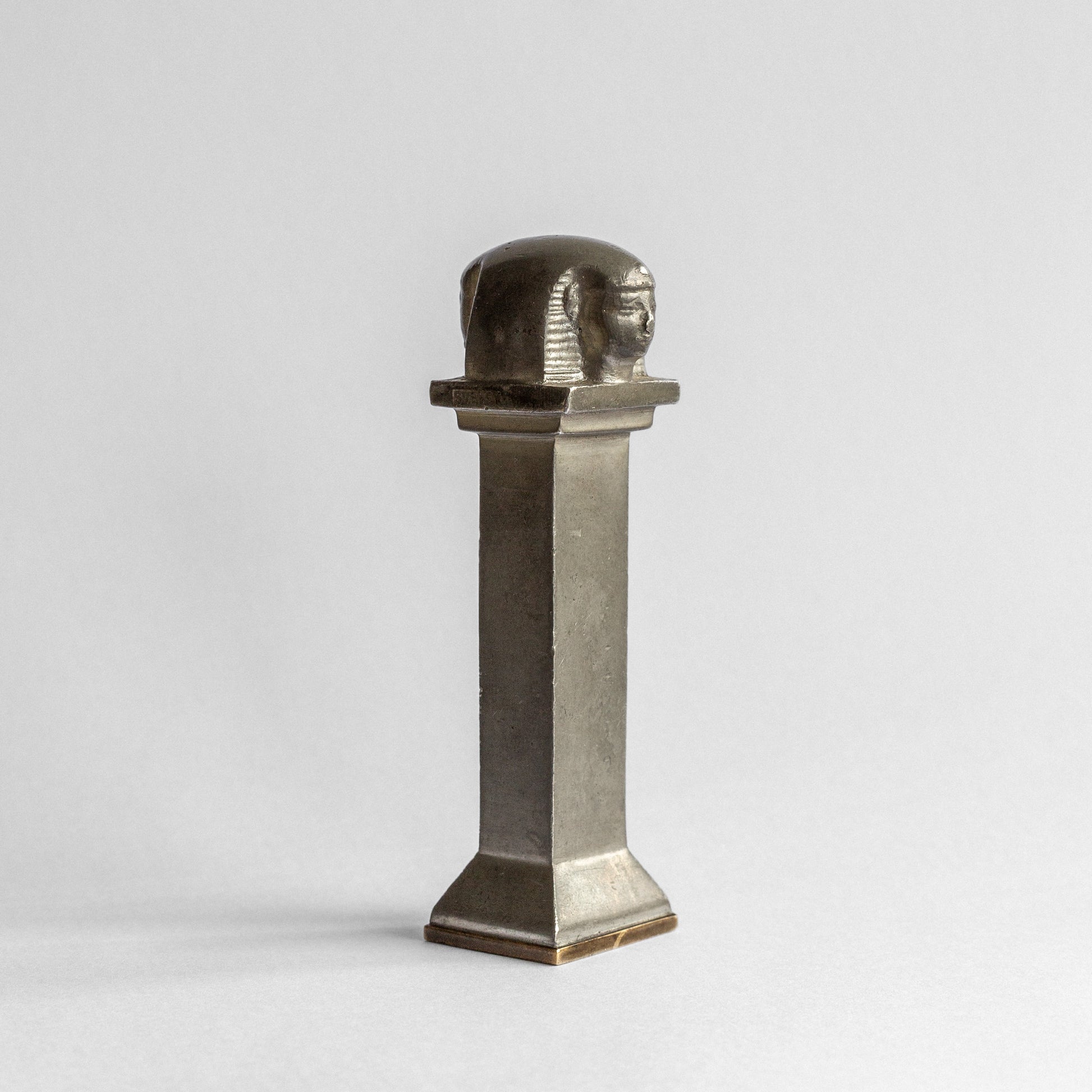 This elegantly designed sculptural stamp features a solid pewter column on a brass base, crowned with a double-headed sphinx.