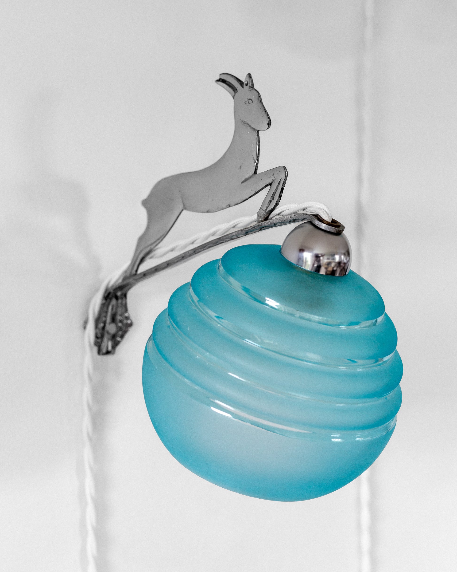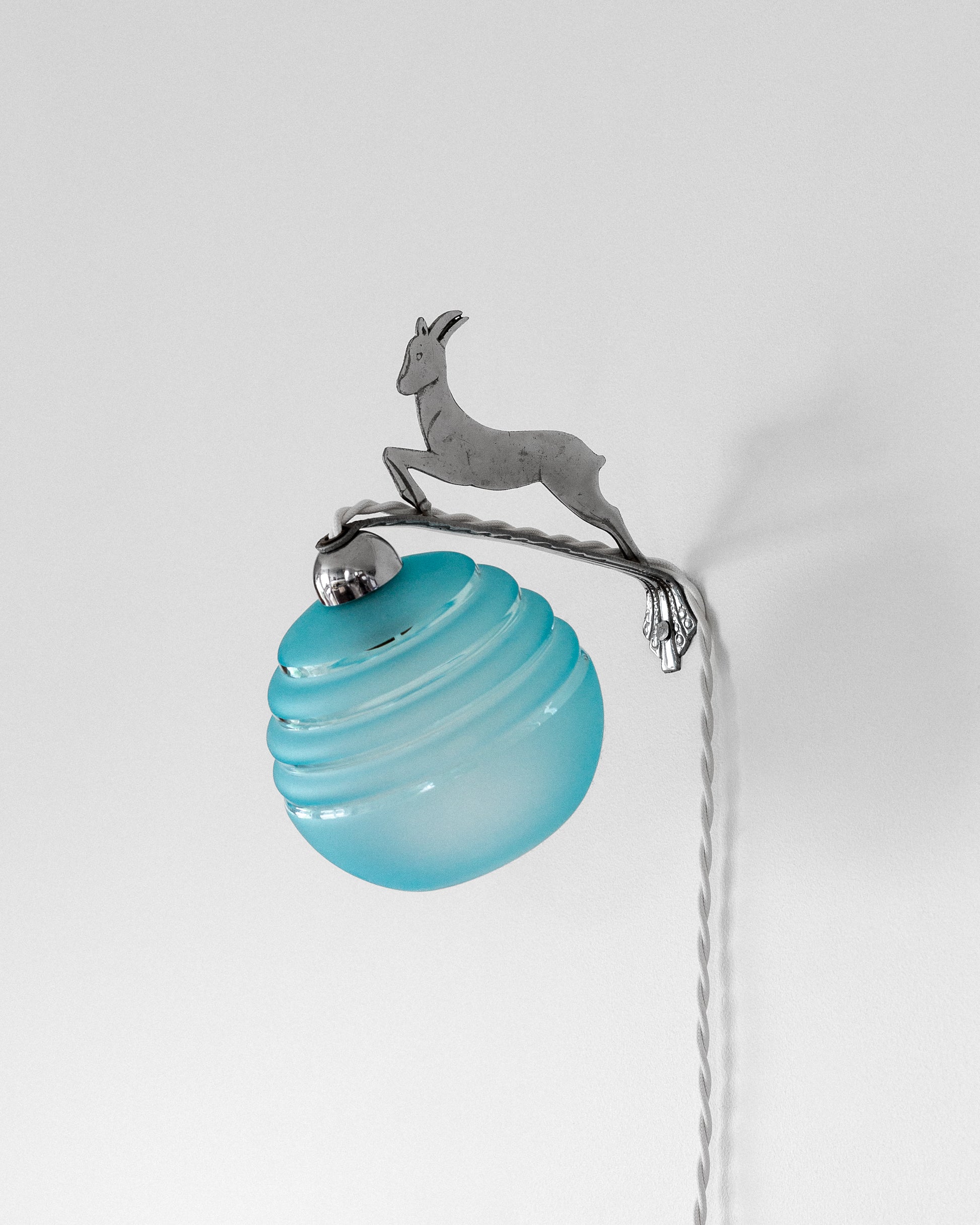 Pair of Art Deco wall lights from France, featuring chrome bases with jumping deer designs, each holding a ribbed blue glass globe. Crafted in the 1930s and in great condition.