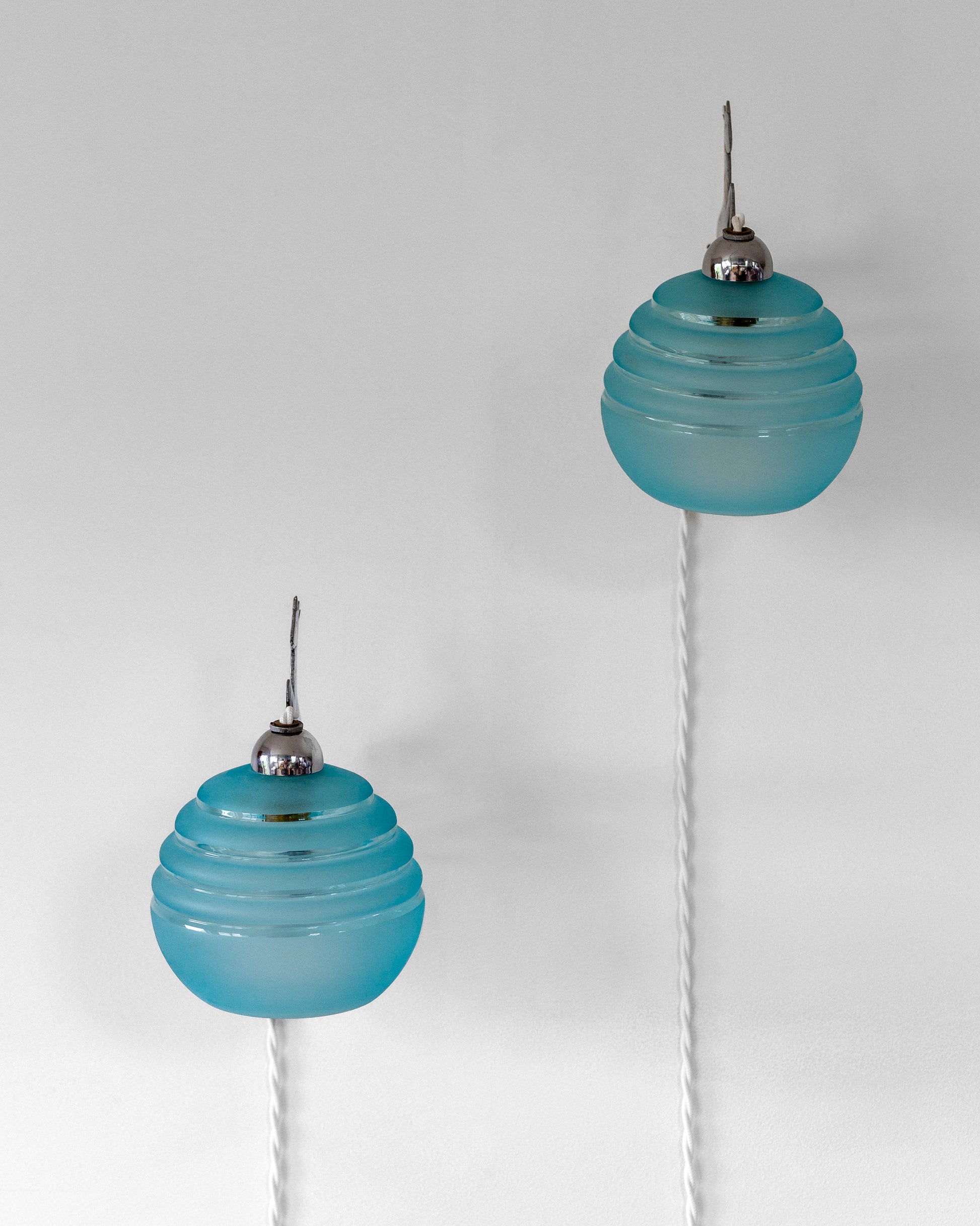 • Rewired with white twisted textile cords, switches, and EU plugs. They come with B22 bayonet bulb holders.