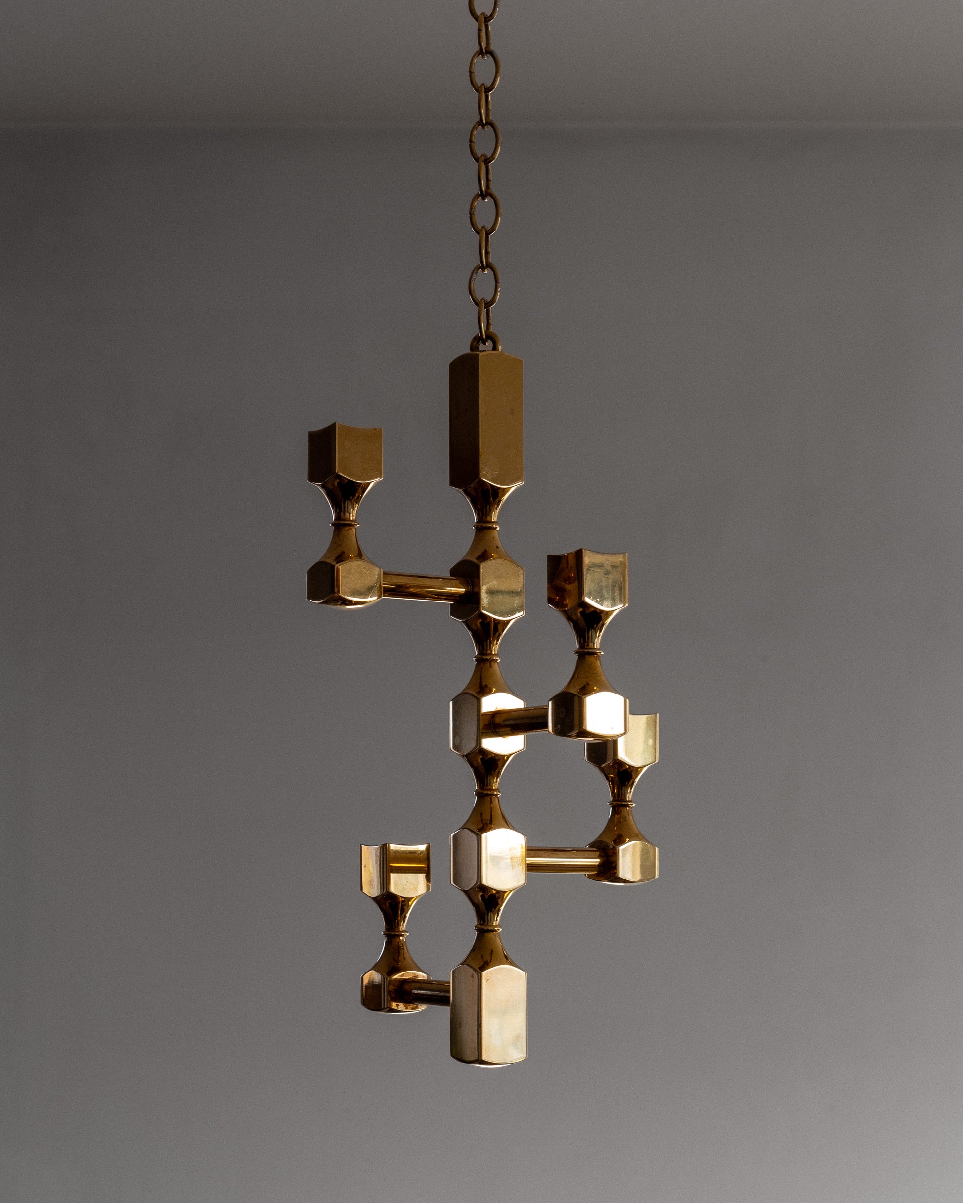 A chandelier crafted from solid brass in the 1980s by Bernt Karlsson for Gusum. Designed to hold four candles, it creates a warm, inviting ambiance, whether illuminated or admired as a sculptural piece.