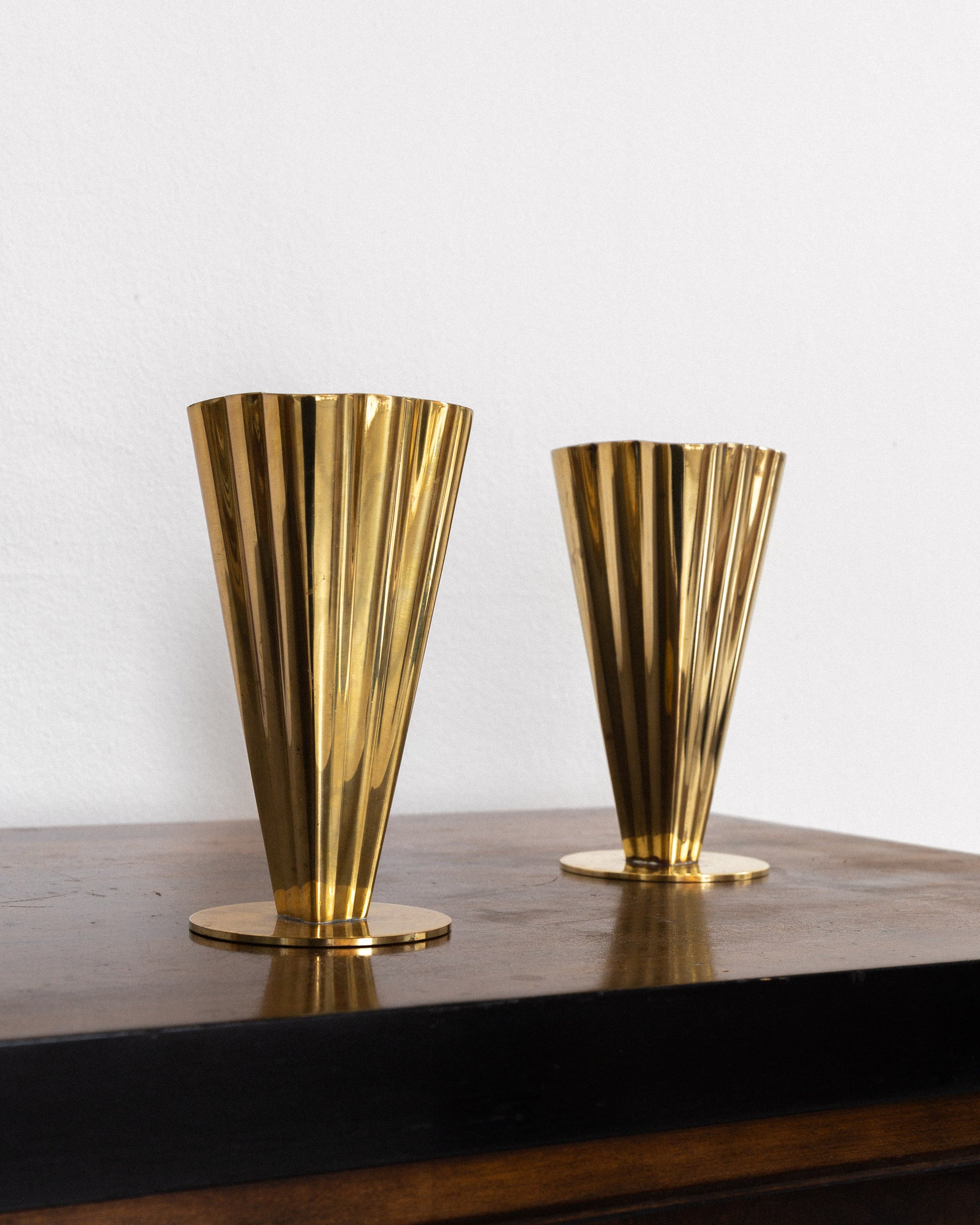 A pair of solid brass vases designed by Gunnar Ander for Ystad Metall in the 1950s. The fluted, vertically ribbed bodies rise from circular bases, creating sculptural forms that are both decorative and well-suited for displaying single stems or small arrangements. These pieces exemplify mid-century Scandinavian design's distinctive interpretation of Art Deco aesthetics.