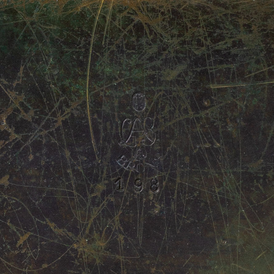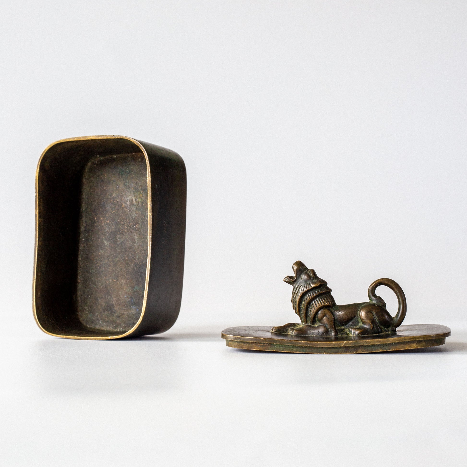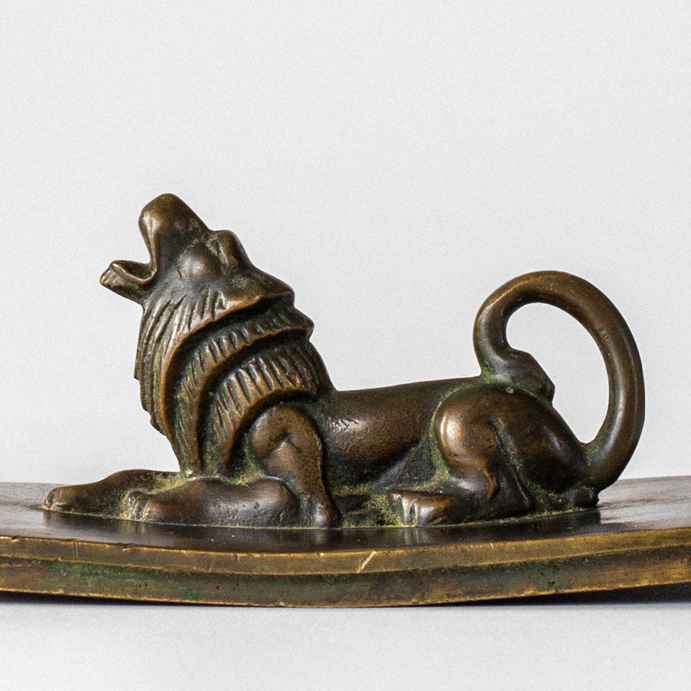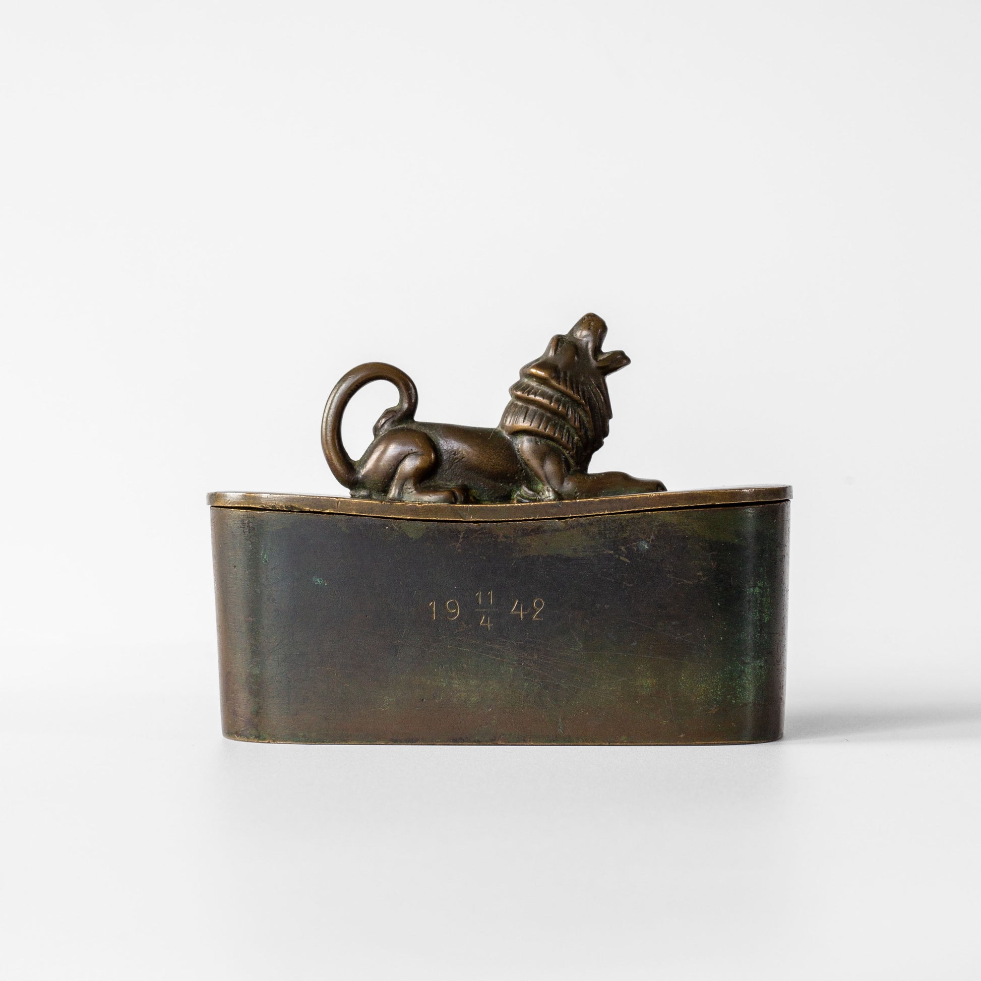 Beautifully patinated with different shades of green and warm, metallic brown that has developed over nearly nine decades. The sculptural lion finial demonstrates Ängman's skill in creating functional objects that transcend mere utility.