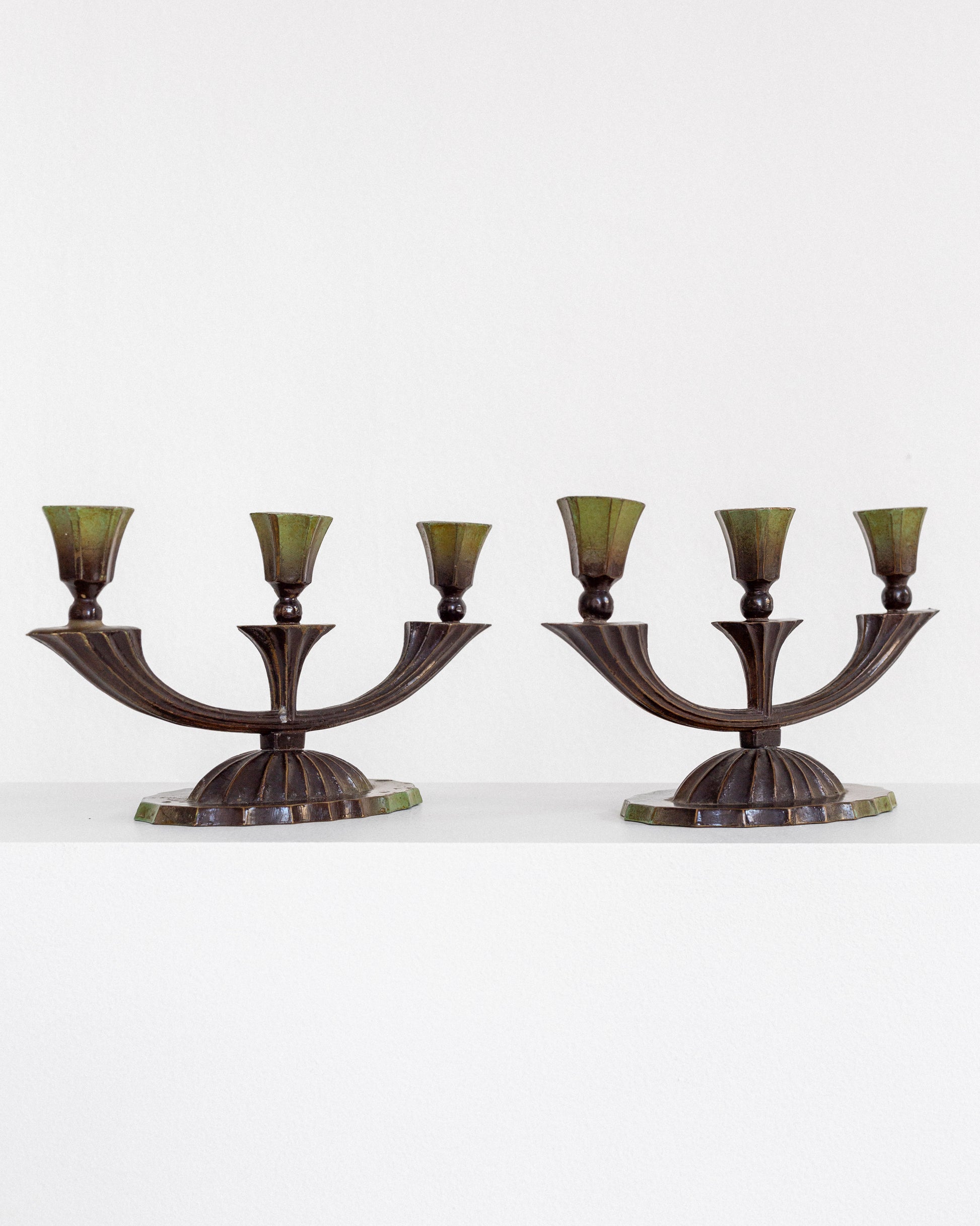 Pair of Art Deco candelabra, crafted in 1930s Sweden. Cast in bronze with a rich patina blending dark brown and green tones. The elegant, streamlined design exemplifies Scandinavian Art Deco craftsmanship, where functionality meets sculptural form. Perfect for creating atmospheric candlelit ambiance on a dining table or sideboard.