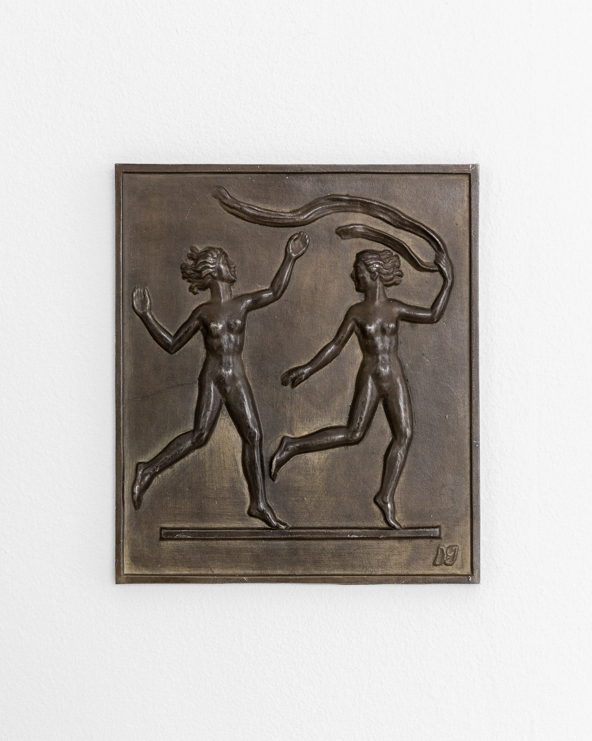 Bronze wall plaque by Swedish artist David Jahrl (1878-1953). Crafted in the 1930s during the late Swedish Grace period, this elegant relief depicts two figures in flowing motion.