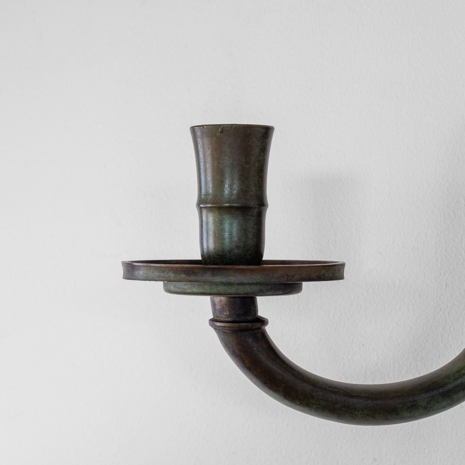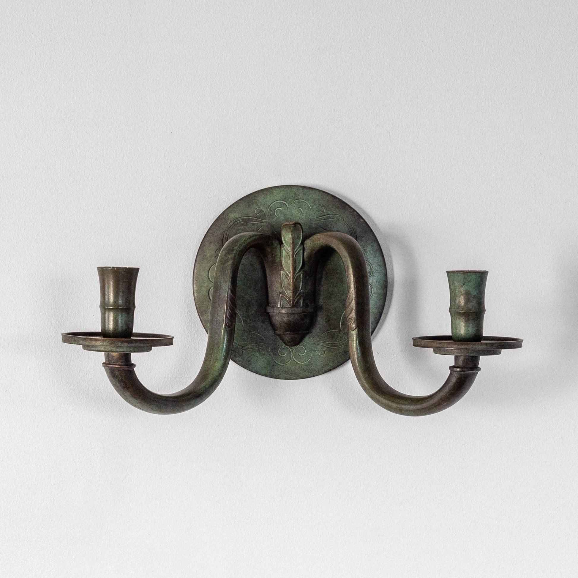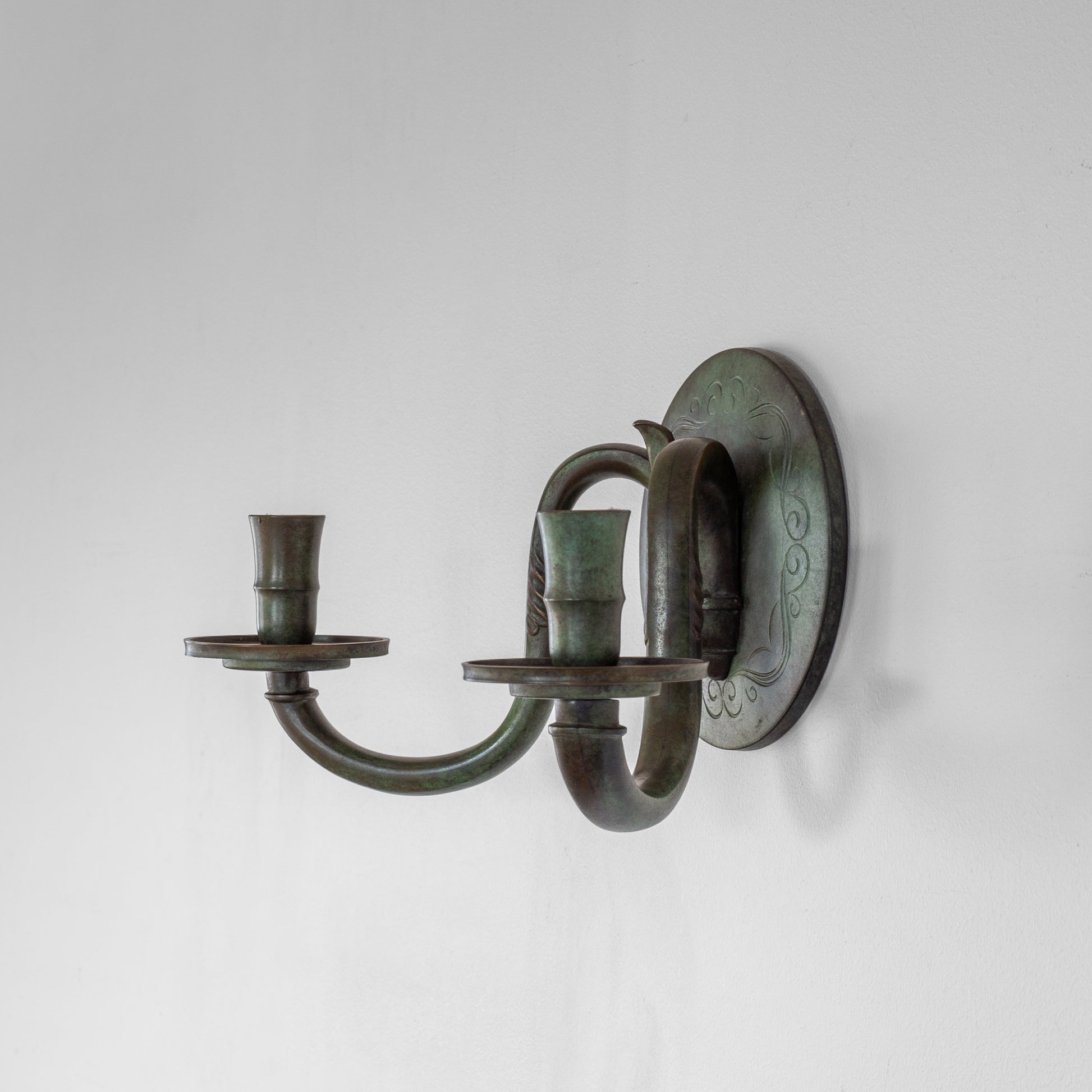 Candle sconce from the 1920s–1930s, Sweden. Made from solid bronze, it showcases a beautifully patinated finish with greenish tones, characteristic of bronze works from the Swedish Art Deco era. The circular wall mount features subtle yet elegant decorative engravings, adding intricate detail to its minimalist design. Seamlessly balancing functionality and neoclassical elegance, this piece serves as both a practical lighting fixture and a striking decorative accent.