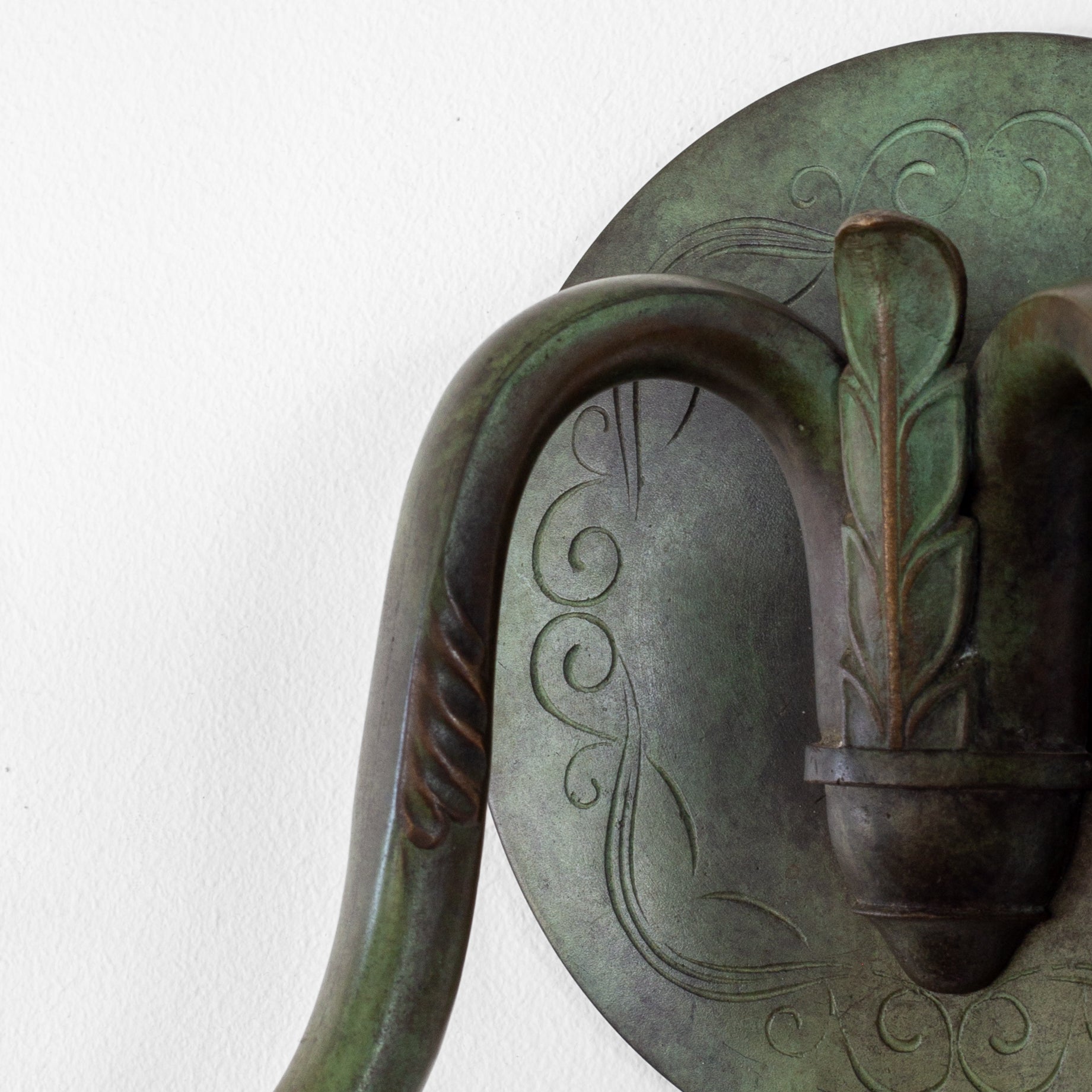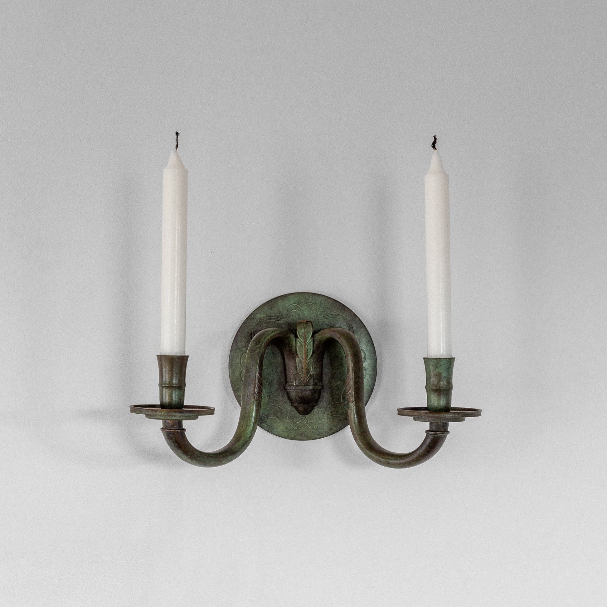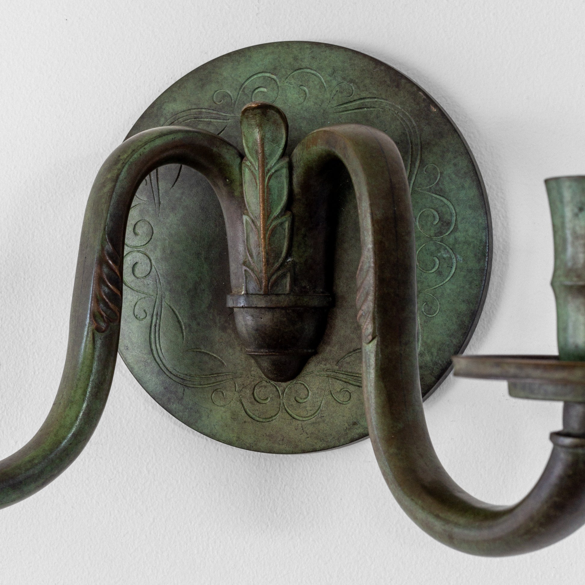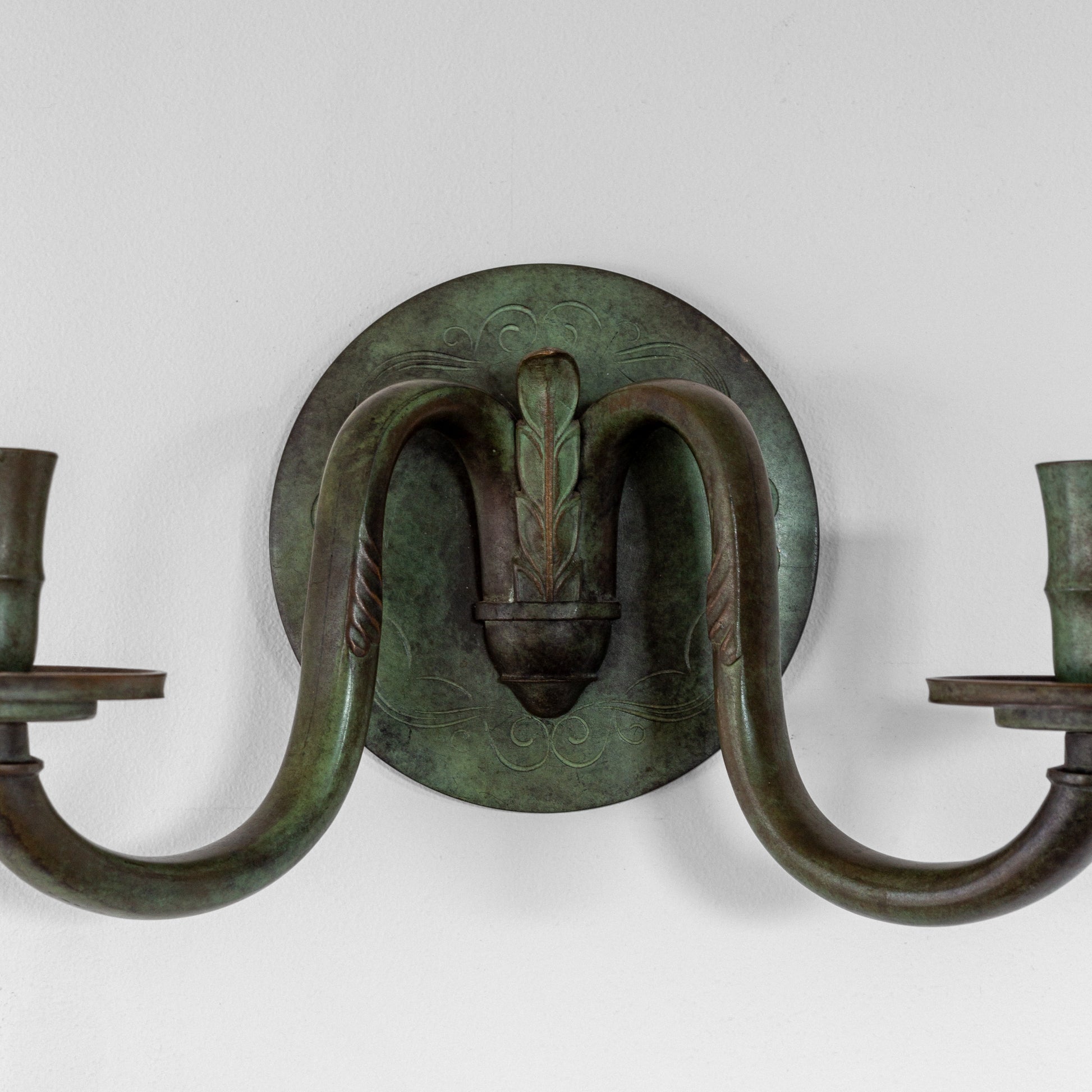 Candle sconce from the 1920s–1930s, Sweden. Made from solid bronze, it showcases a beautifully patinated finish with greenish tones, characteristic of bronze works from the Swedish Art Deco era. The circular wall mount features subtle yet elegant decorative engravings, adding intricate detail to its minimalist design. Seamlessly balancing functionality and neoclassical elegance, this piece serves as both a practical lighting fixture and a striking decorative accent.