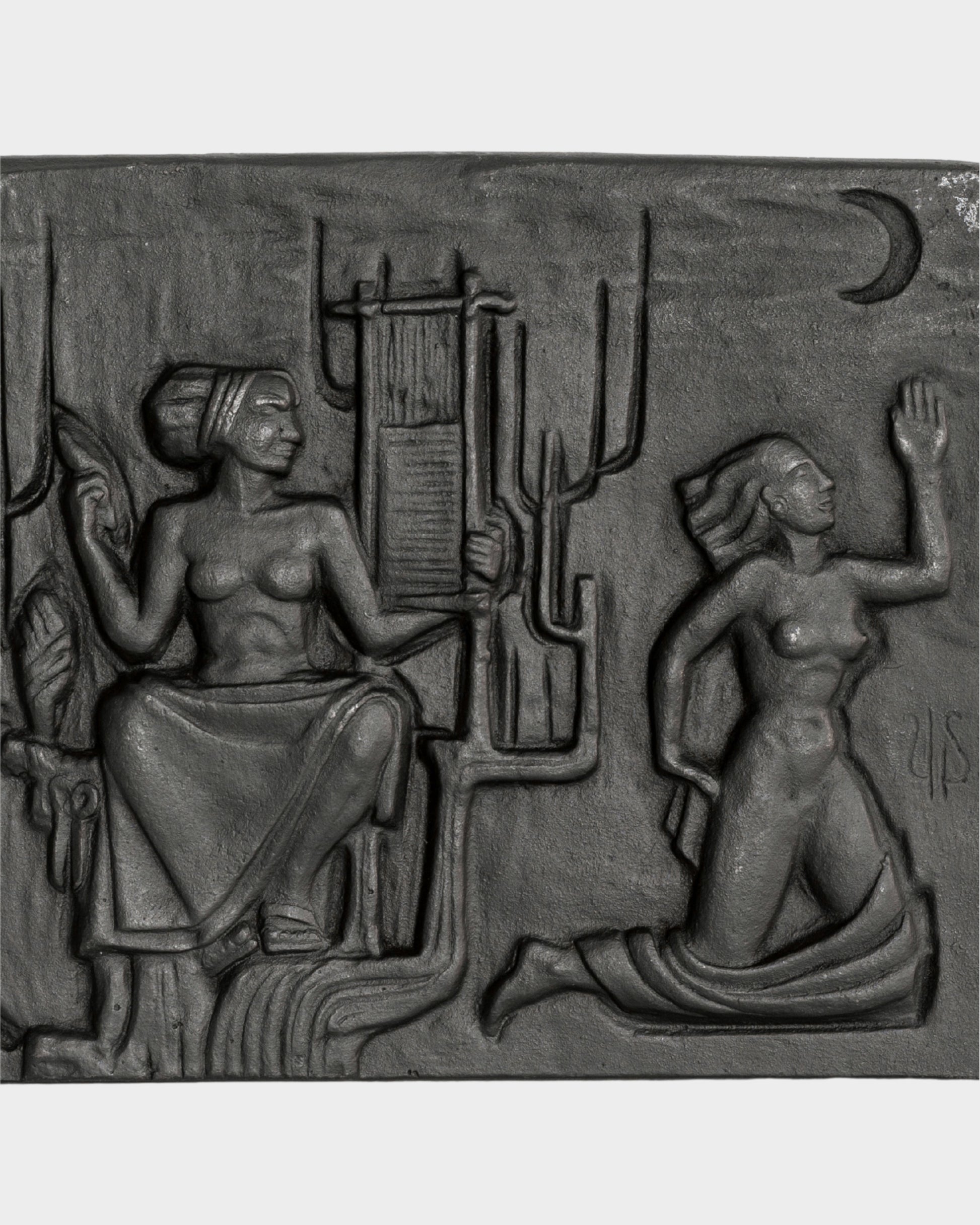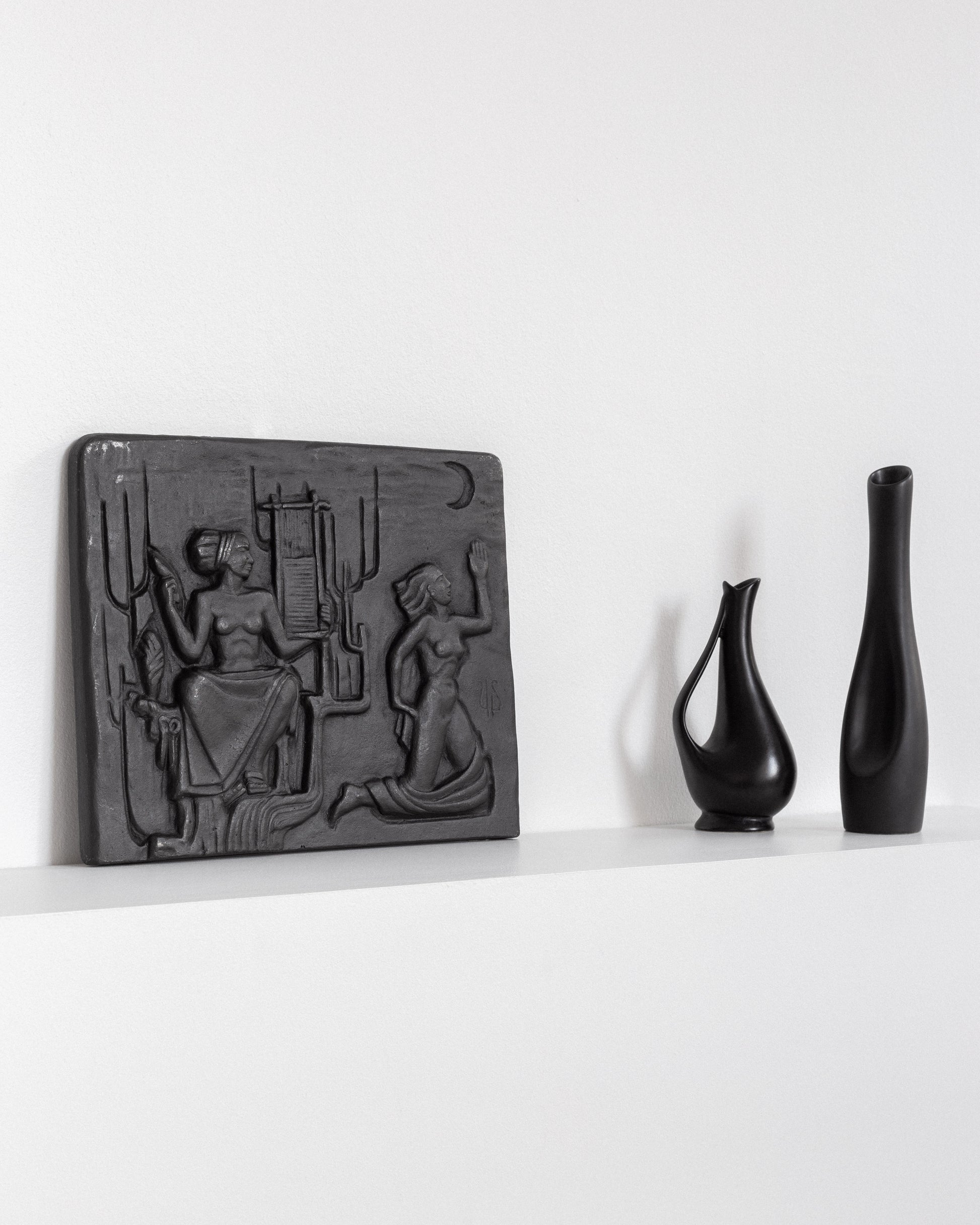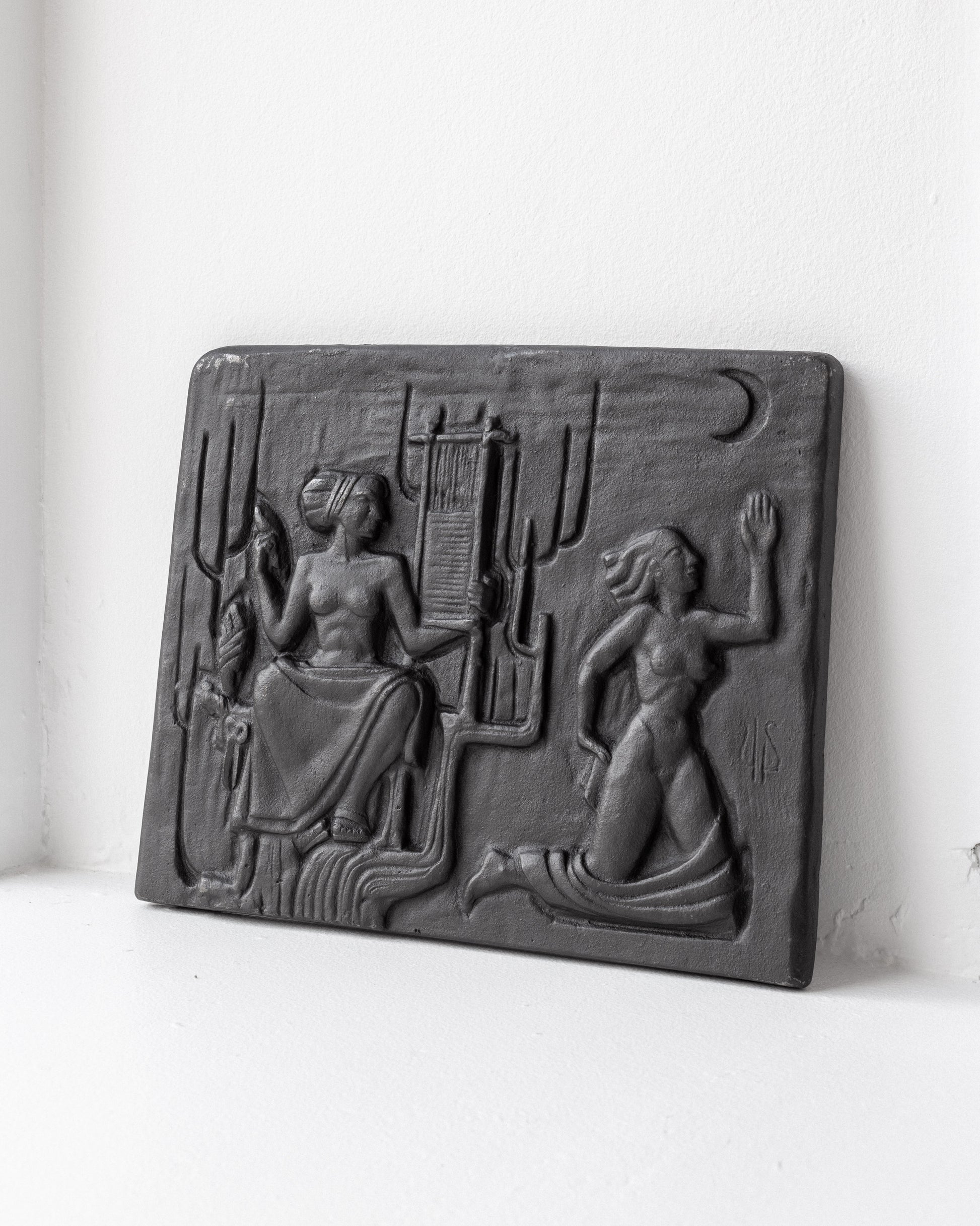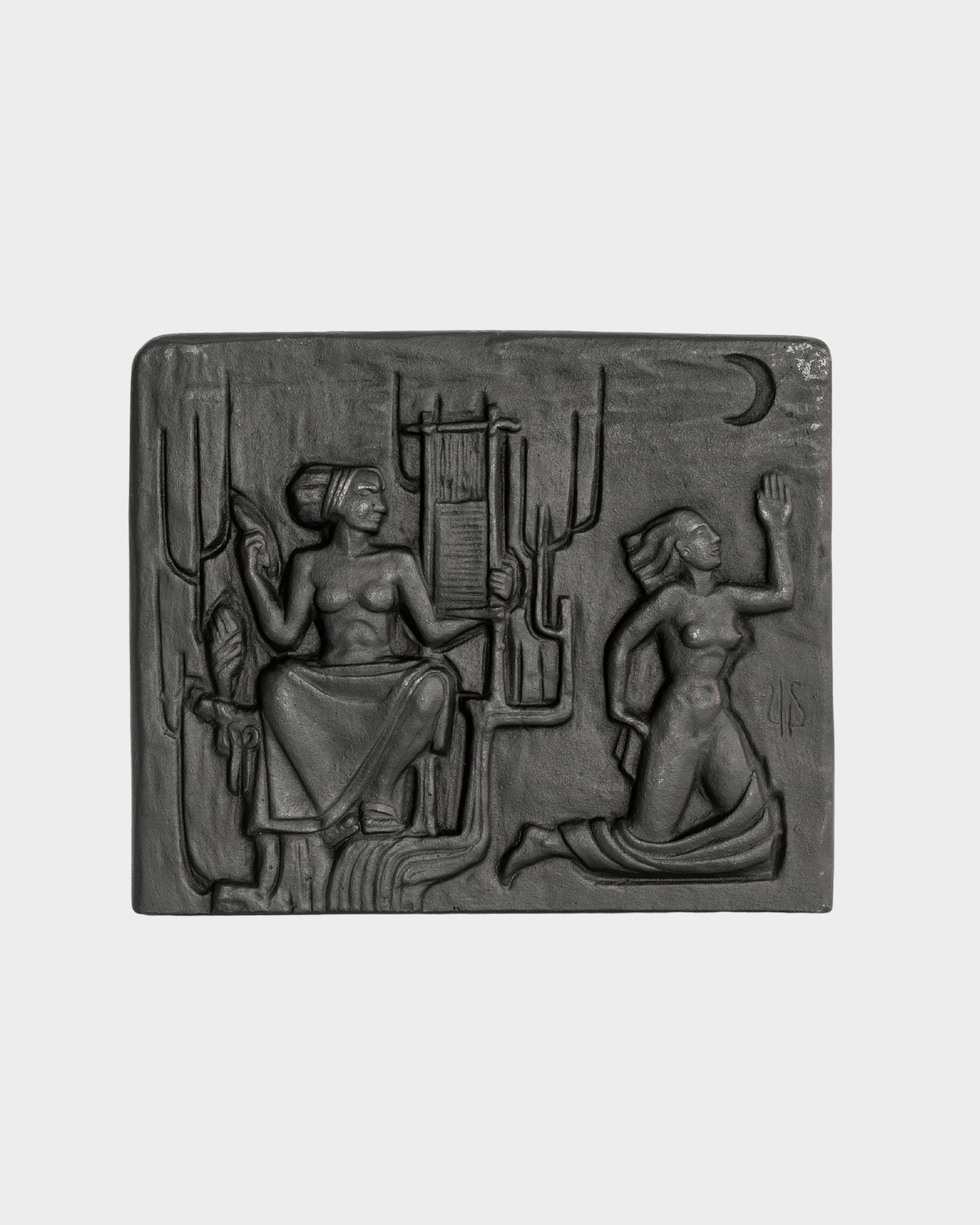 Cast iron wall plaque by renowned Swedish silversmith, designer, and sculptor Ulla Fogelklou-Skogh (1913–1986). Crafted in the 1960s for the company Ystad Metall, this striking relief features intricate, almost mystical artistry. The piece bears her monogram signing.