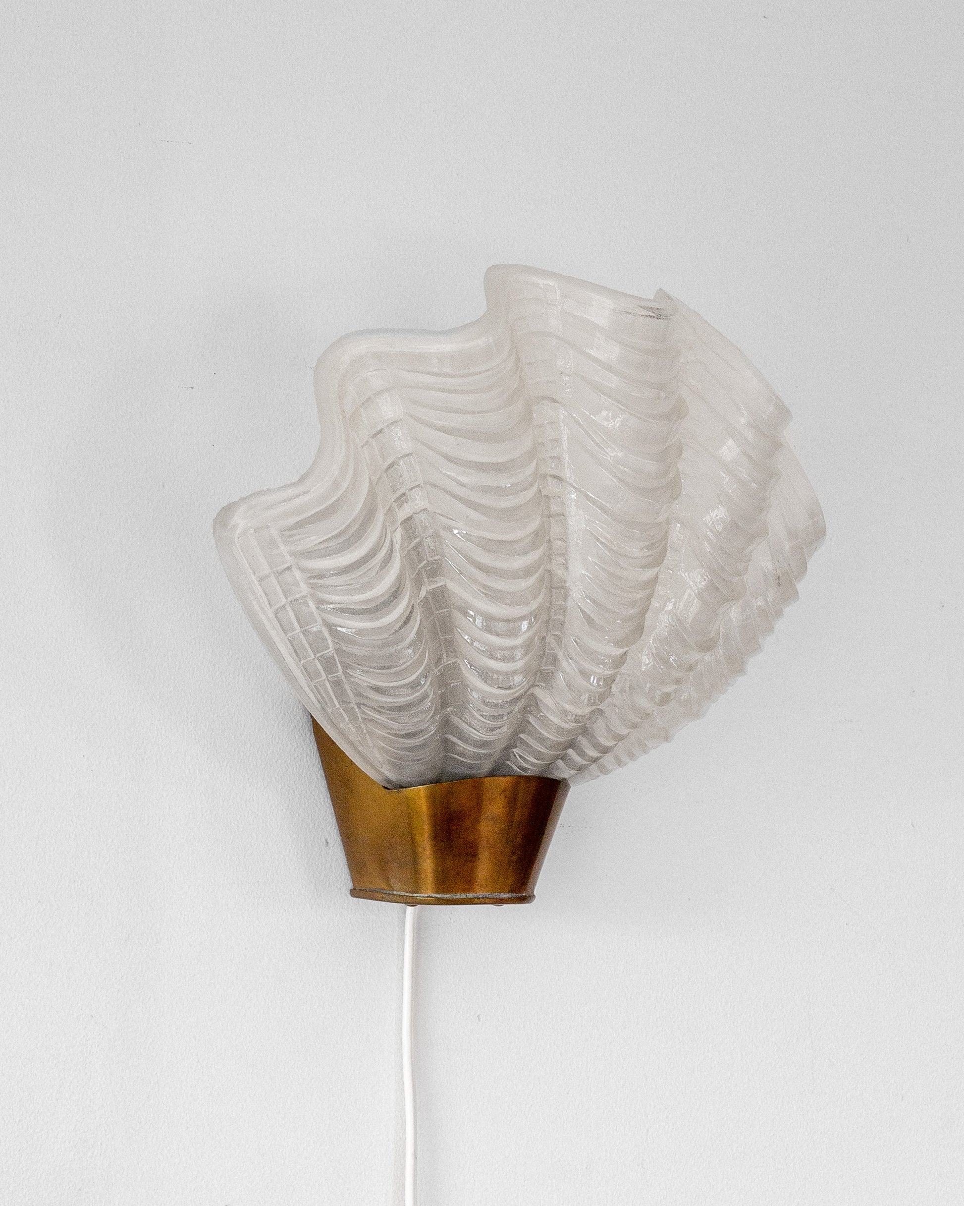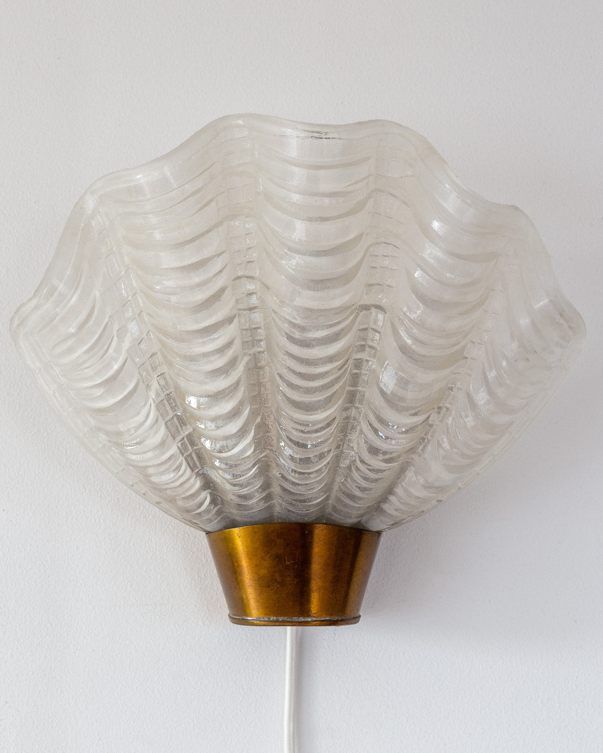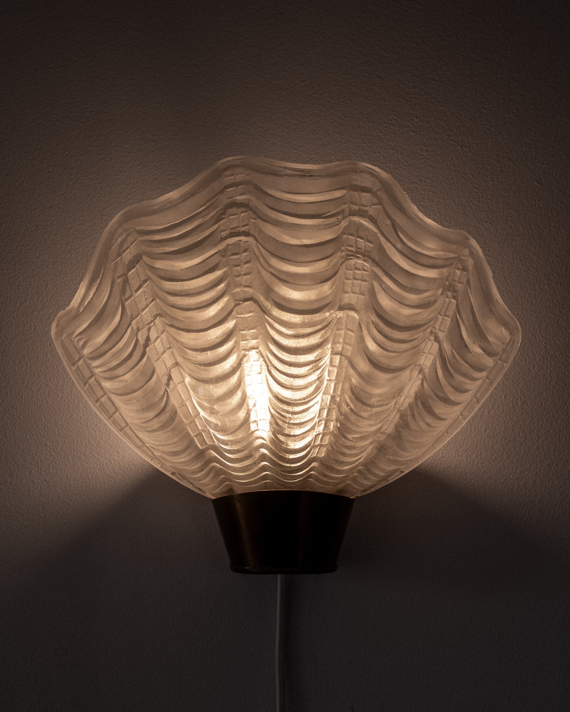 A wall light crafted in 1940 by the Swedish company ASEA. Known as the "Coquille" model, it features a shell-shaped shade in clear pressed glass with distinctive rippled texture. The scalloped pattern creates beautiful light diffusion when illuminated. Mounted in an aged brass cup holder and fitted with a white cord and inline switch. The design perfectly captures the meeting point between decorative Art Deco influences and streamlined Scandinavian aesthetics.