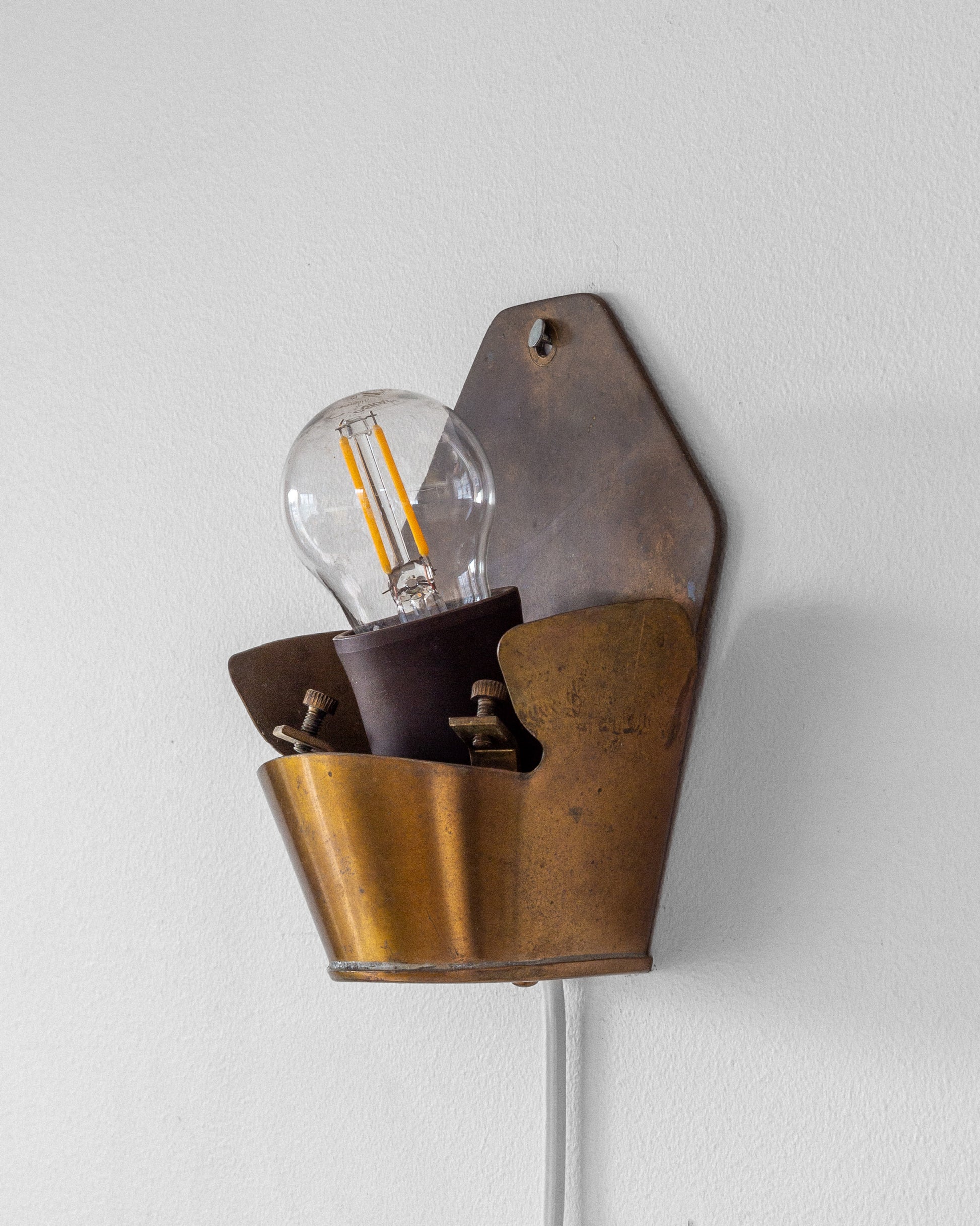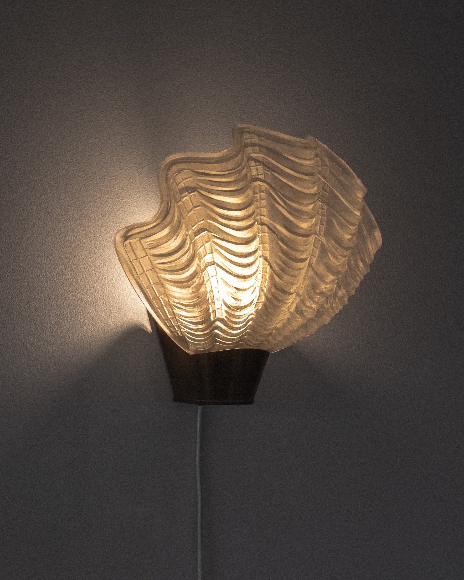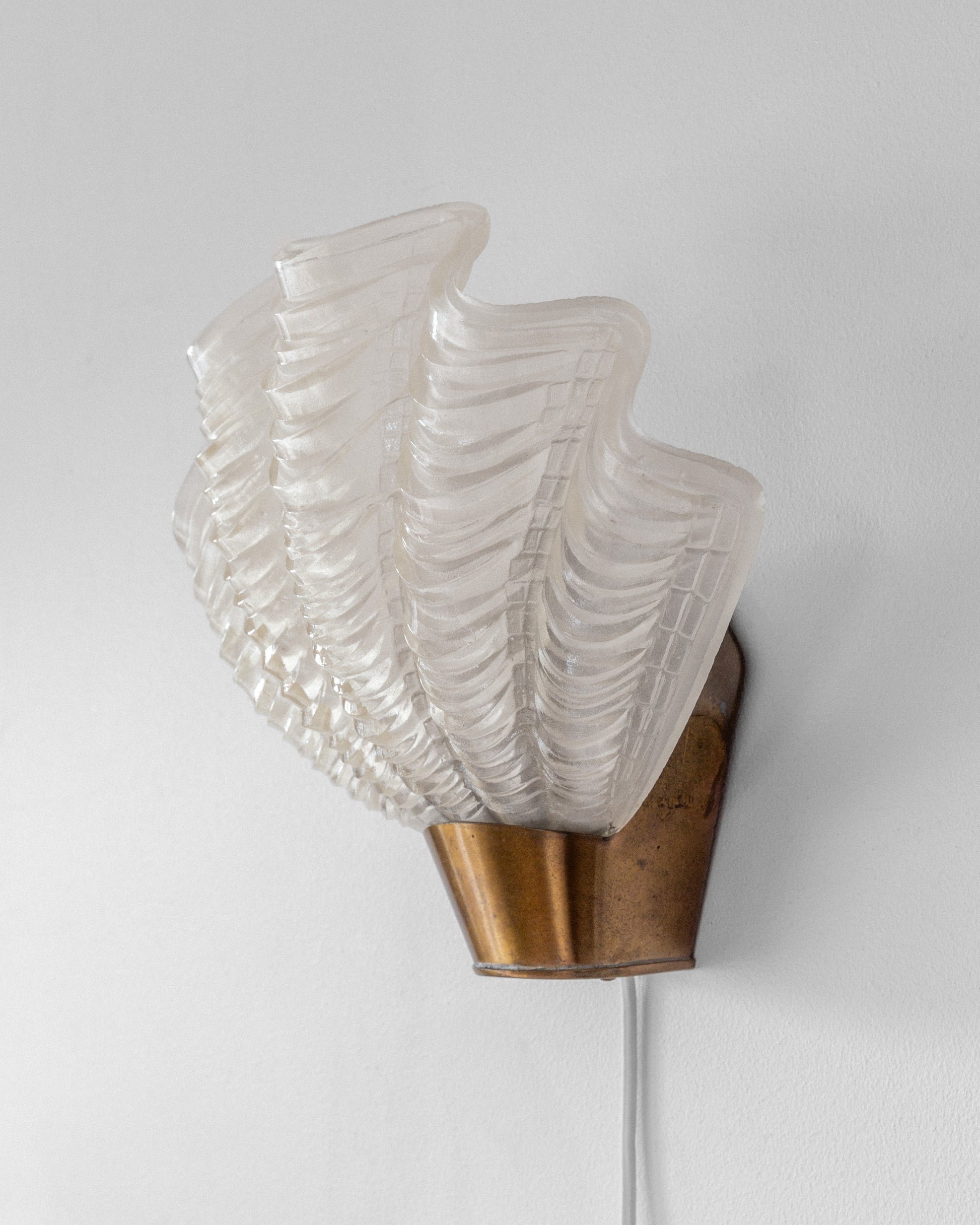 A wall light crafted in 1940 by the Swedish company ASEA. Known as the "Coquille" model, it features a shell-shaped shade in clear pressed glass with distinctive rippled texture. The scalloped pattern creates beautiful light diffusion when illuminated. Mounted in an aged brass cup holder and fitted with a white cord and inline switch. The design perfectly captures the meeting point between decorative Art Deco influences and streamlined Scandinavian aesthetics.