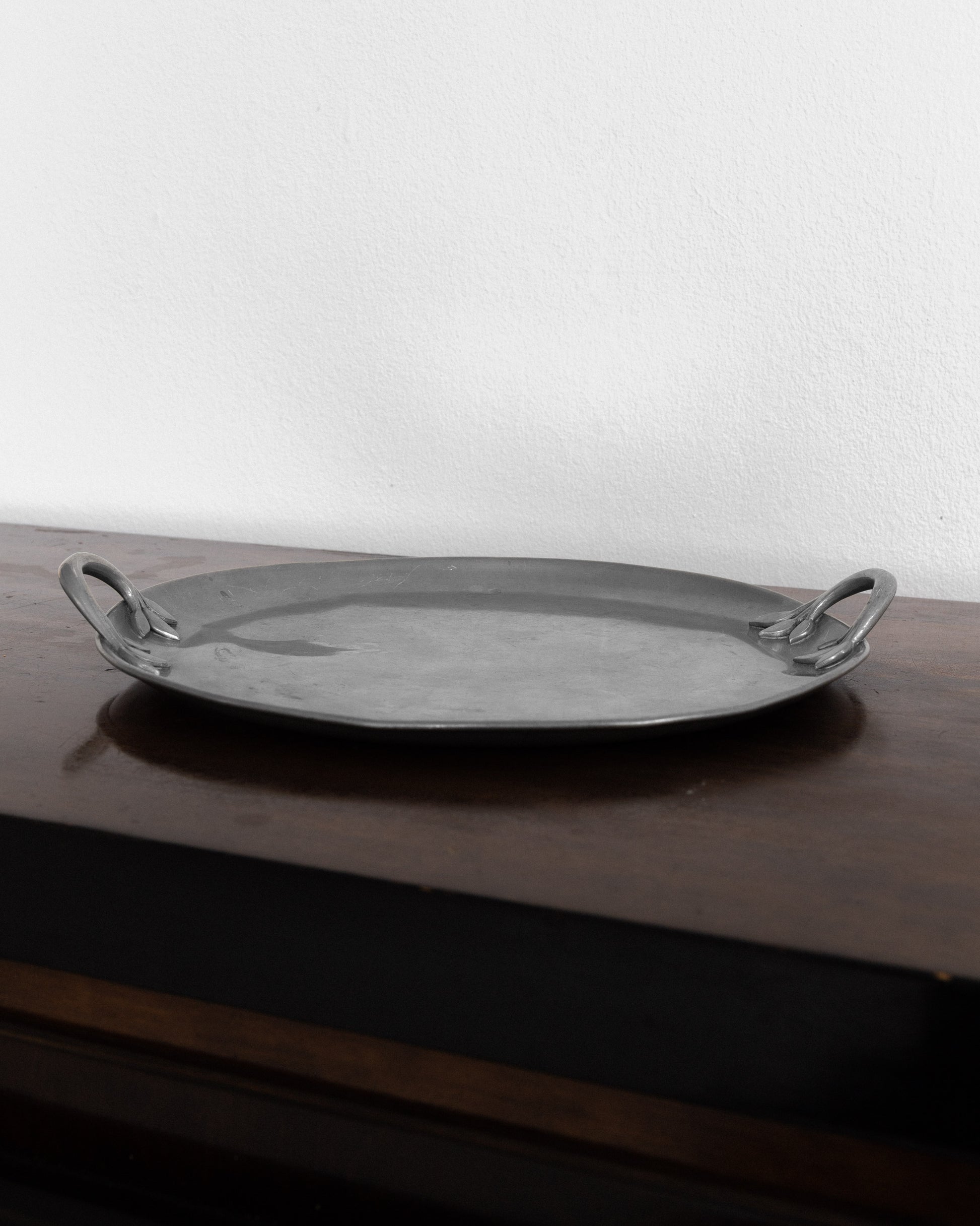 An elegant pewter tray by Firma Svenskt Tenn. Produced in 1931, this piece features a circular form with applied handles decorated with leaf motifs. A scarce example from Svenskt Tenn's formative period.