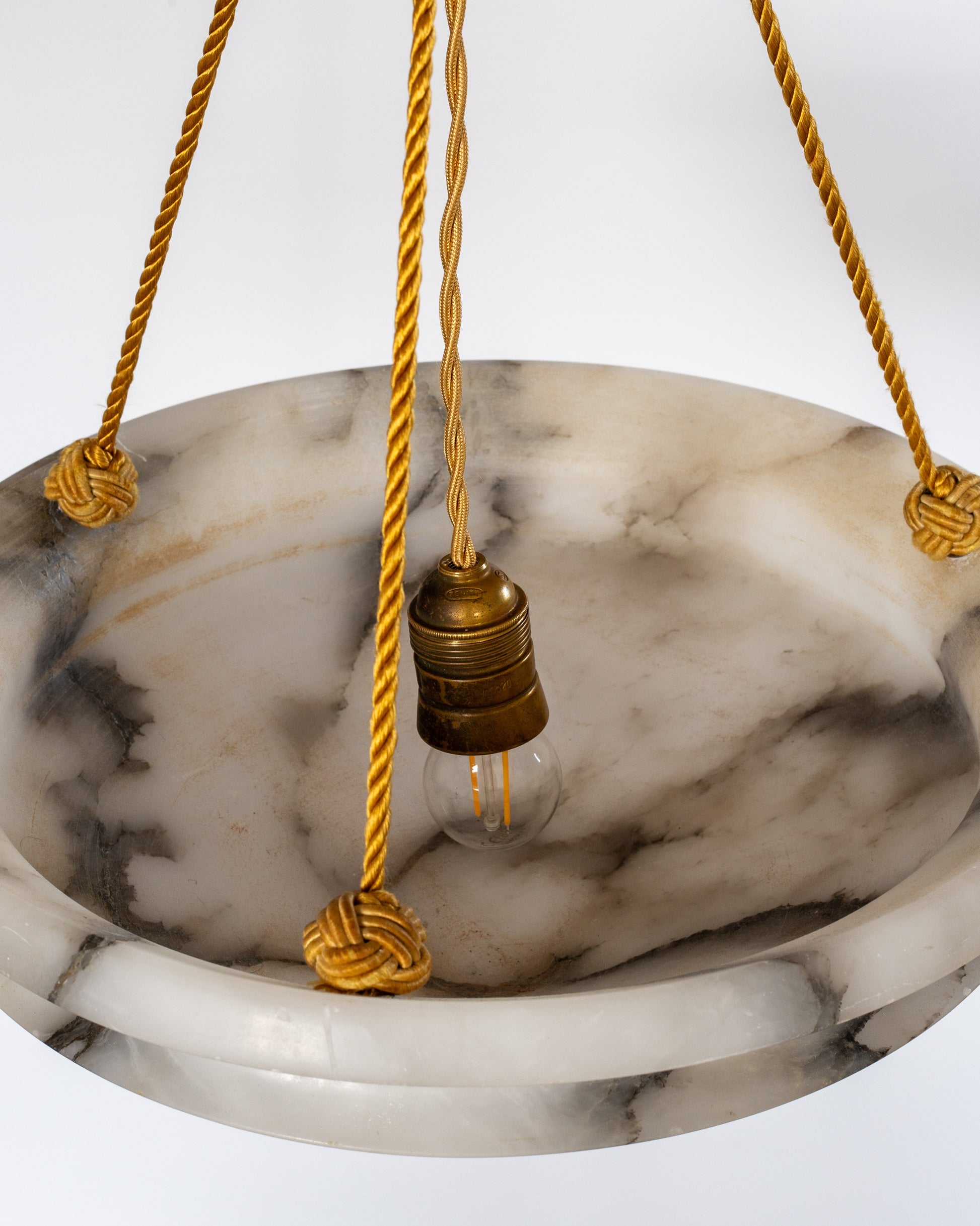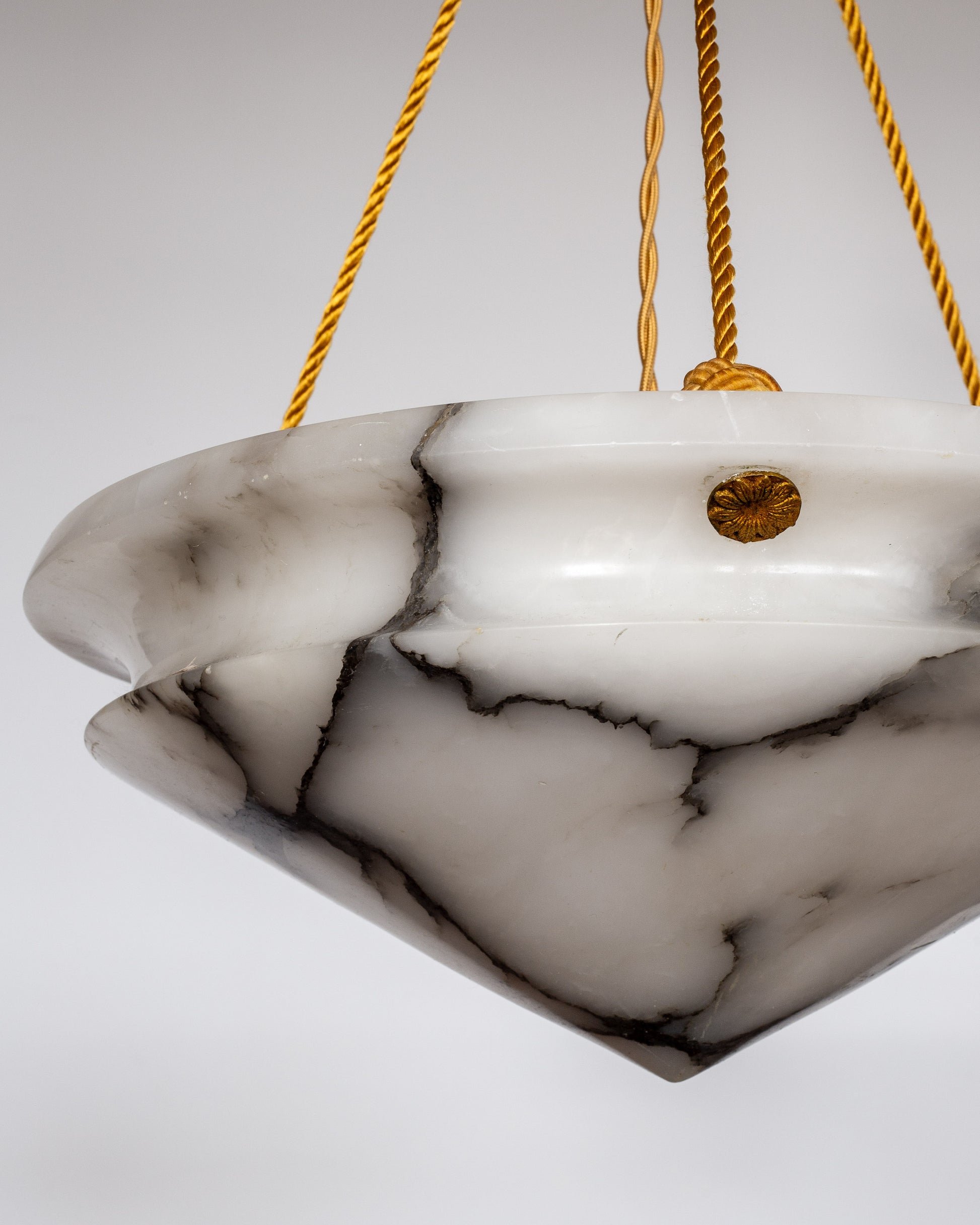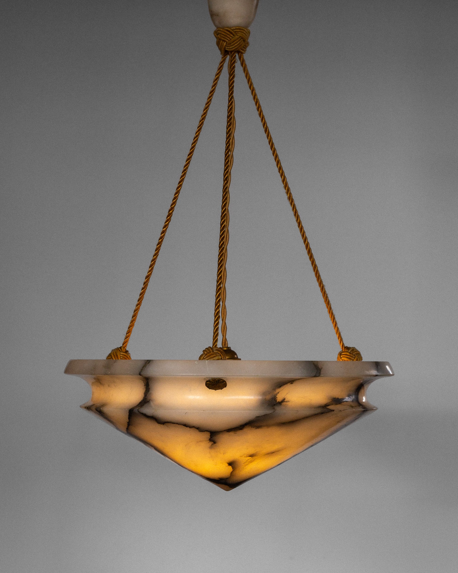 This extraordinary Art Deco pendant showcases a diamond-shaped alabaster bowl with dramatic black veining against pristine white stone.