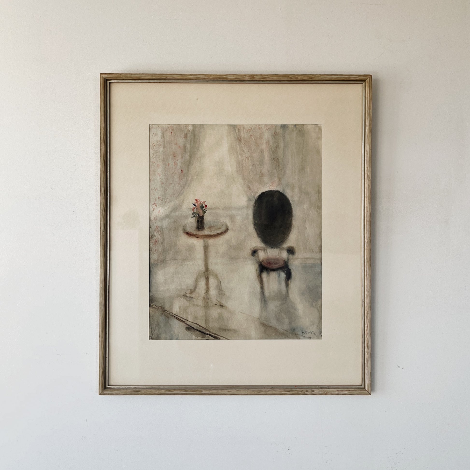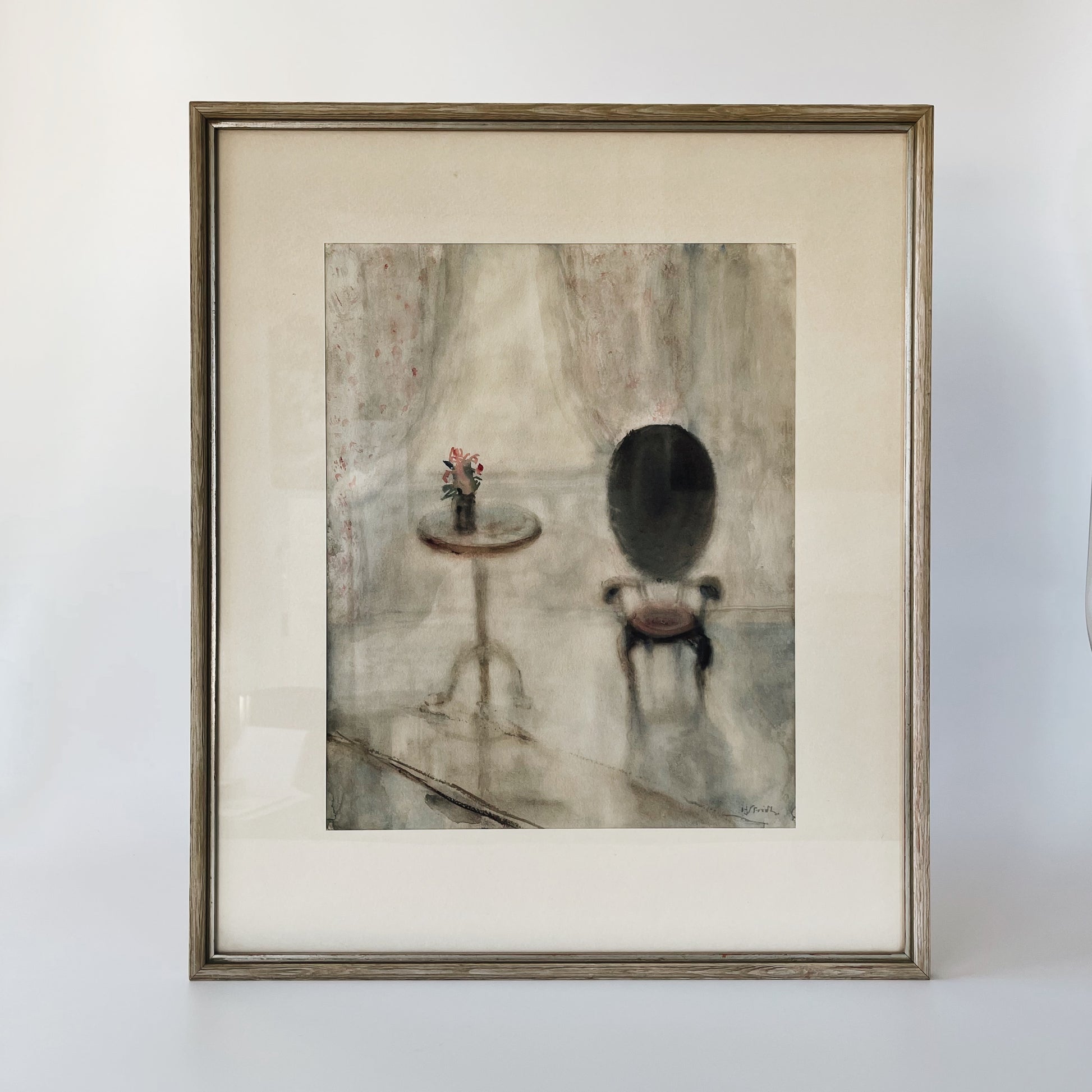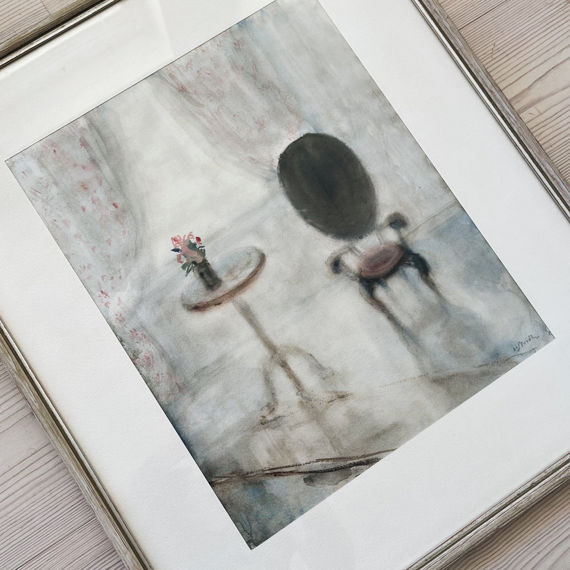 Charming aquarelle painting by an unkown artist, depicting a dreamlike interior scene where time seems to be standing still.
