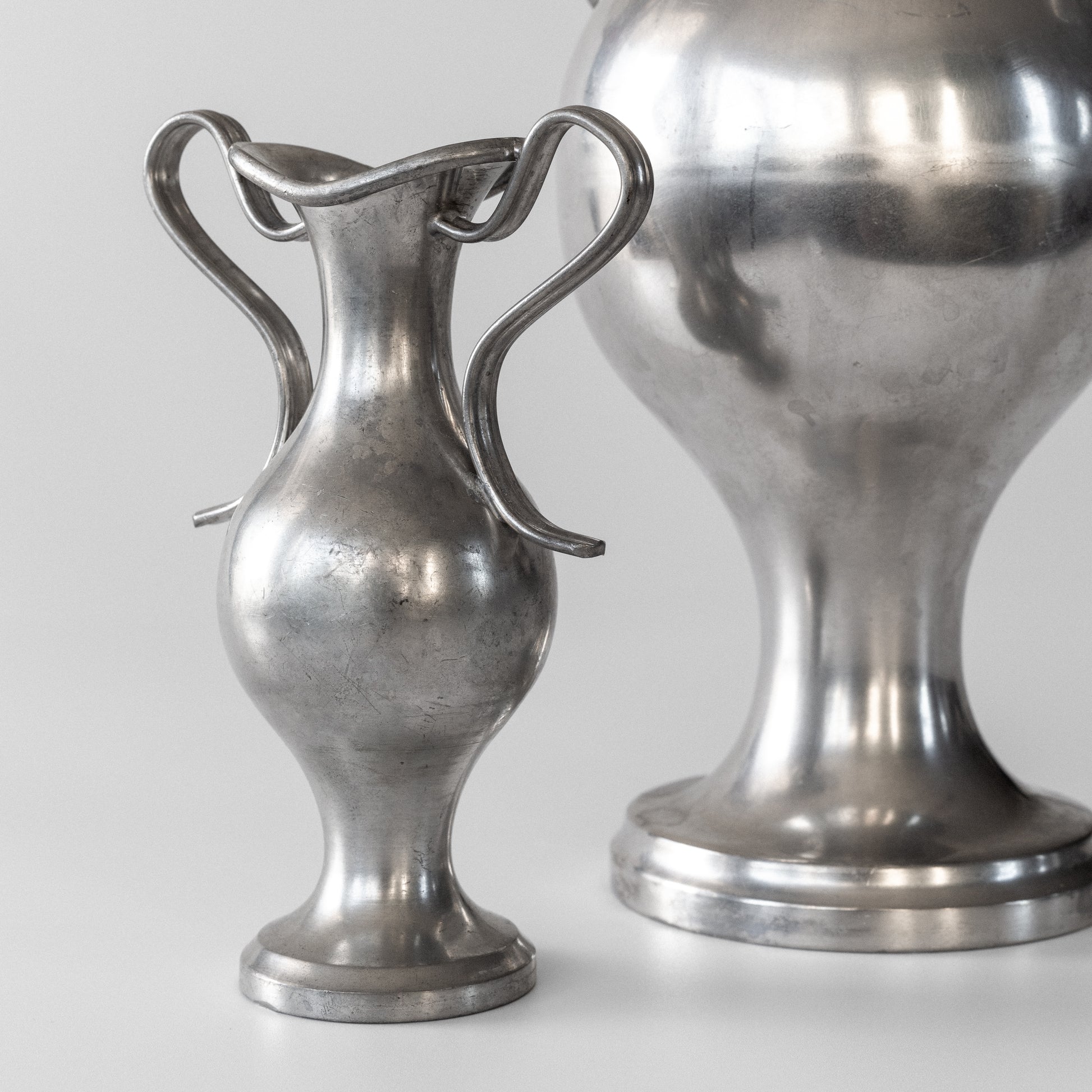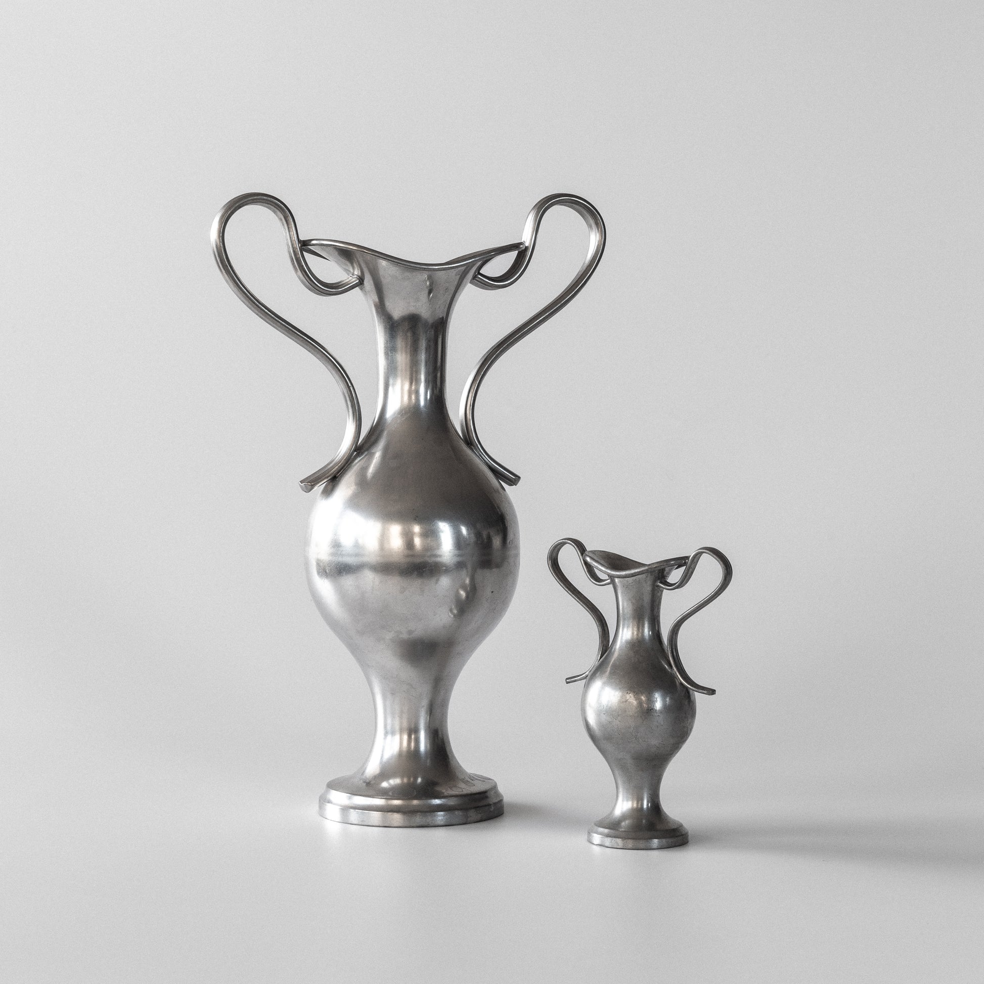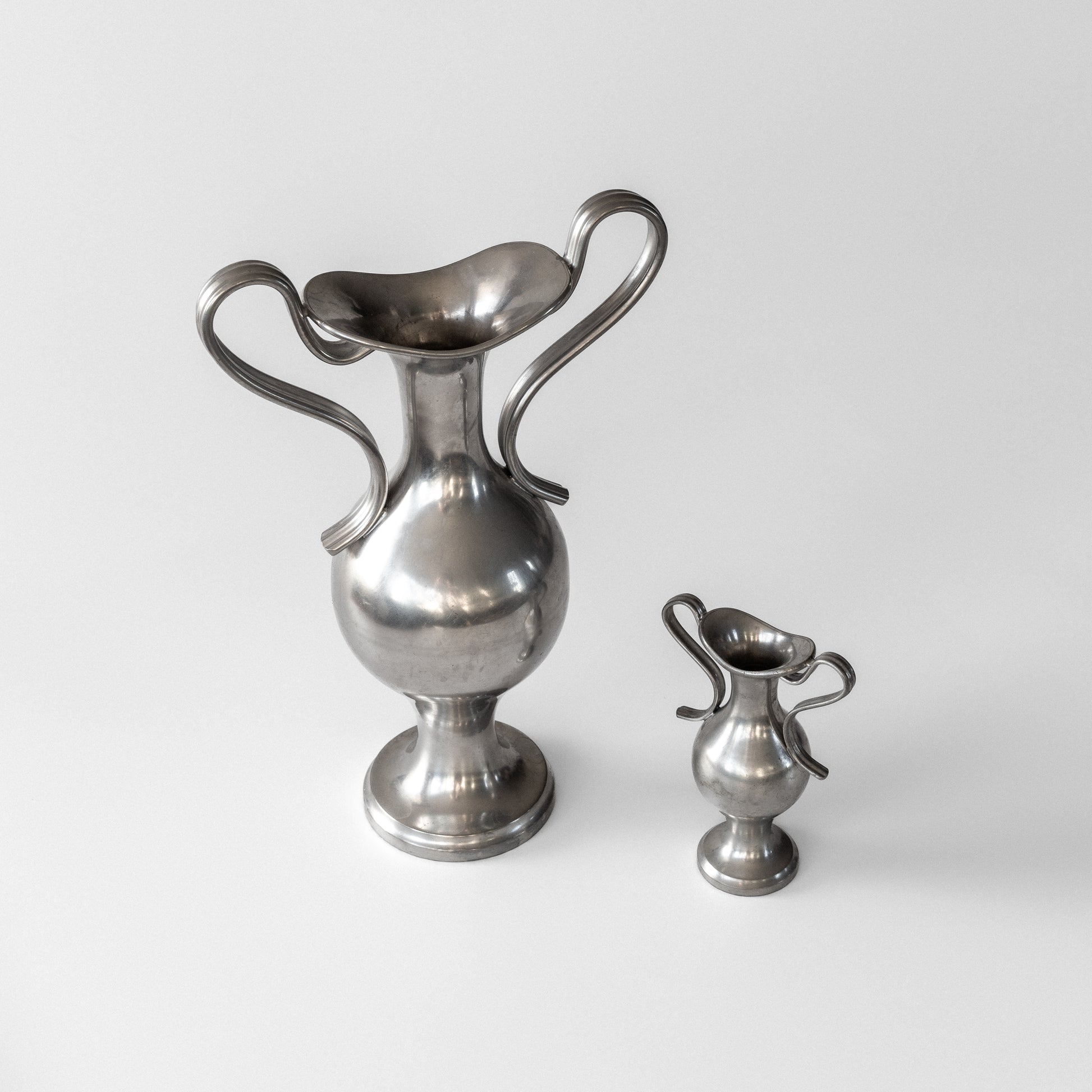A pair of pewter vases, crafted in 1953 by royal purveyor to the court Ernst Svedbom. These vases feature a neoclassical design, with a bulbous base and oversized, gracefully curved handles that add a sense of fluid motion. The larger vase commands attention as a centerpiece, while the smaller one mirrors its design in a more compact form, creating a balanced and cohesive pair.