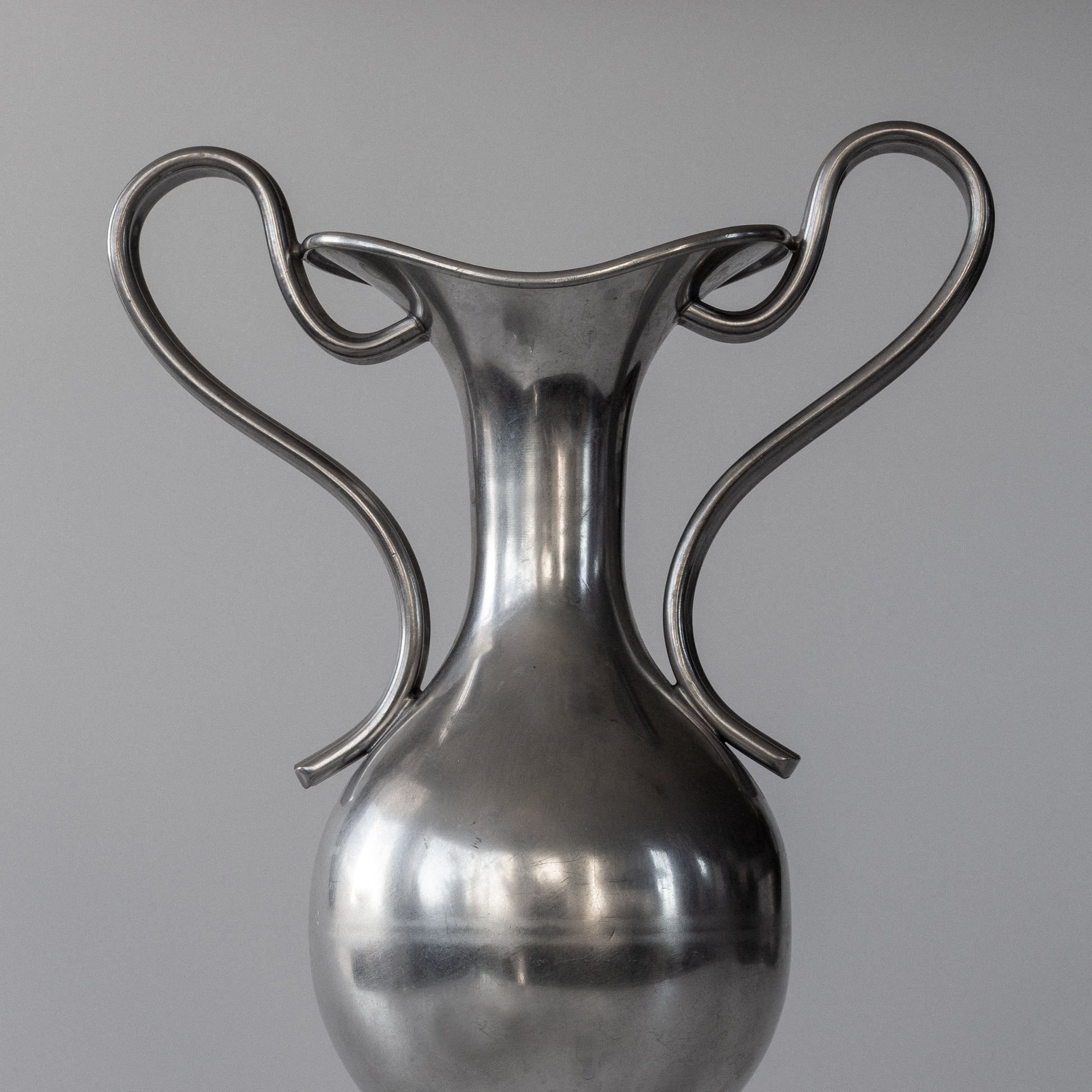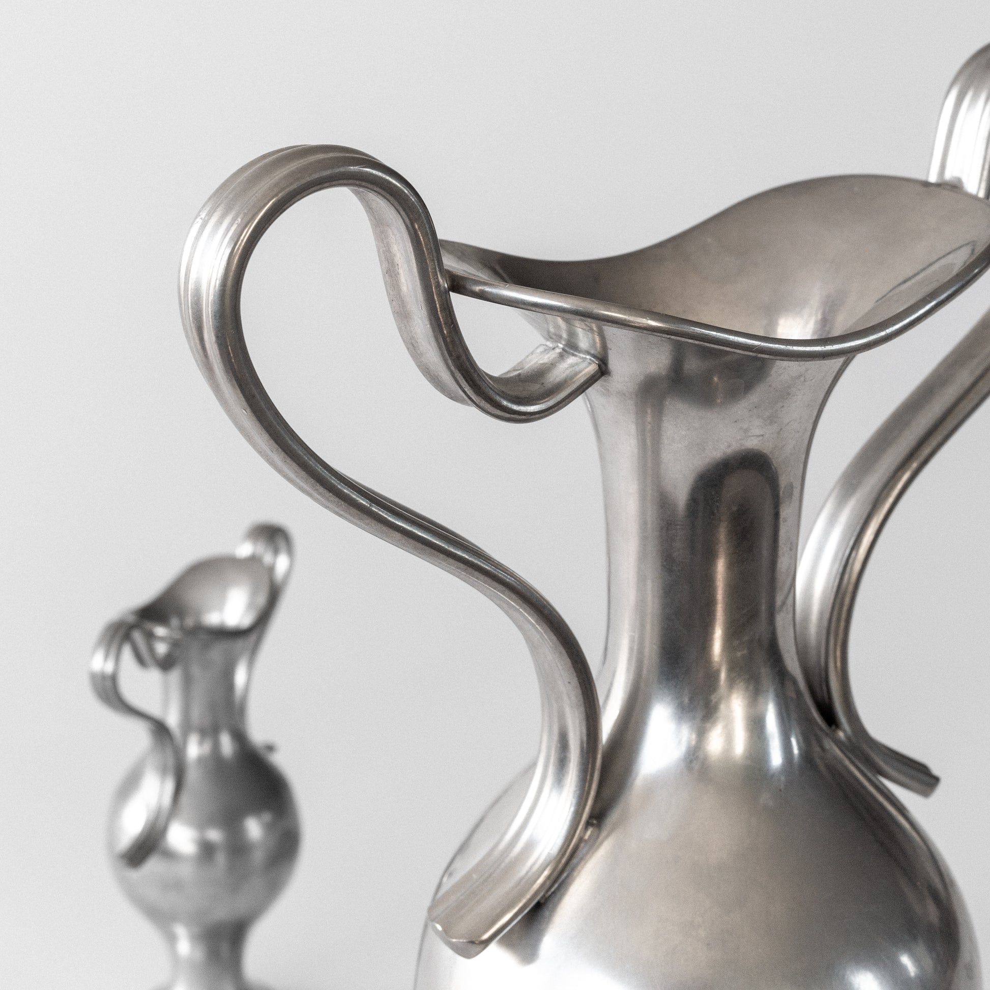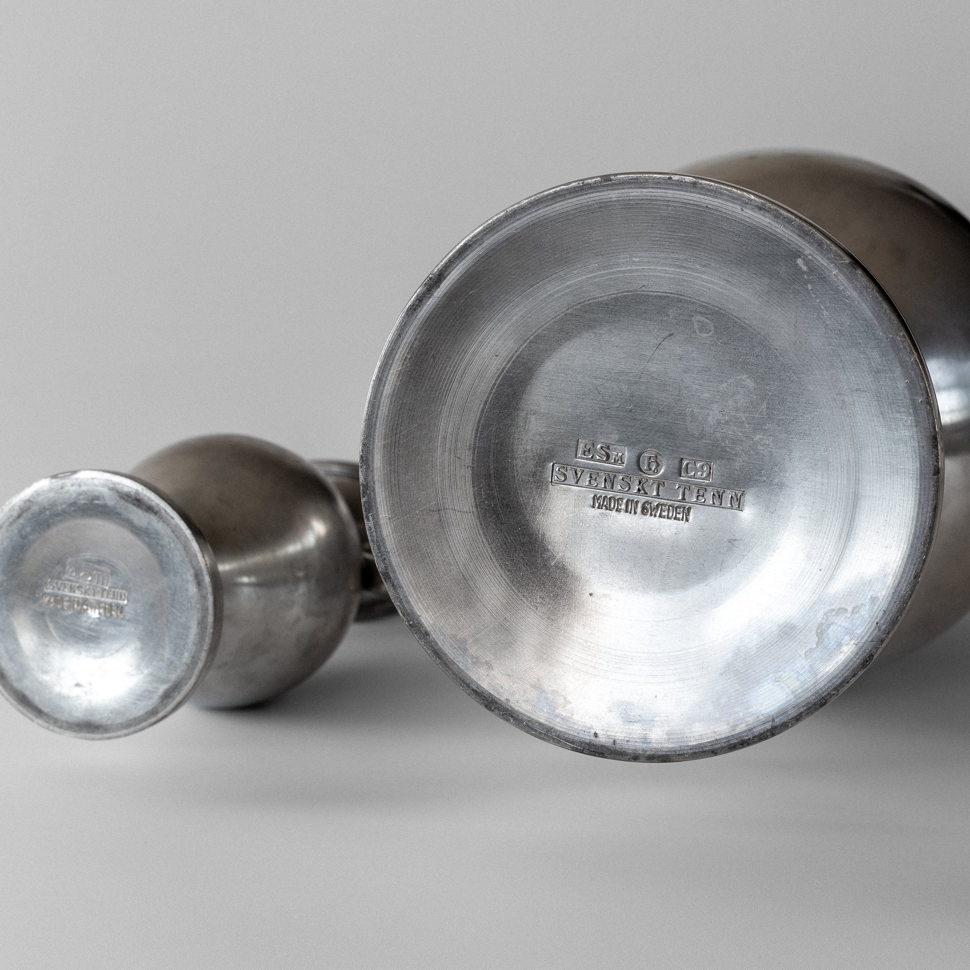 A pair of pewter vases, crafted in 1953 by royal purveyor to the court Ernst Svedbom. These vases feature a neoclassical design, with a bulbous base and oversized, gracefully curved handles that add a sense of fluid motion. The larger vase commands attention as a centerpiece, while the smaller one mirrors its design in a more compact form, creating a balanced and cohesive pair.