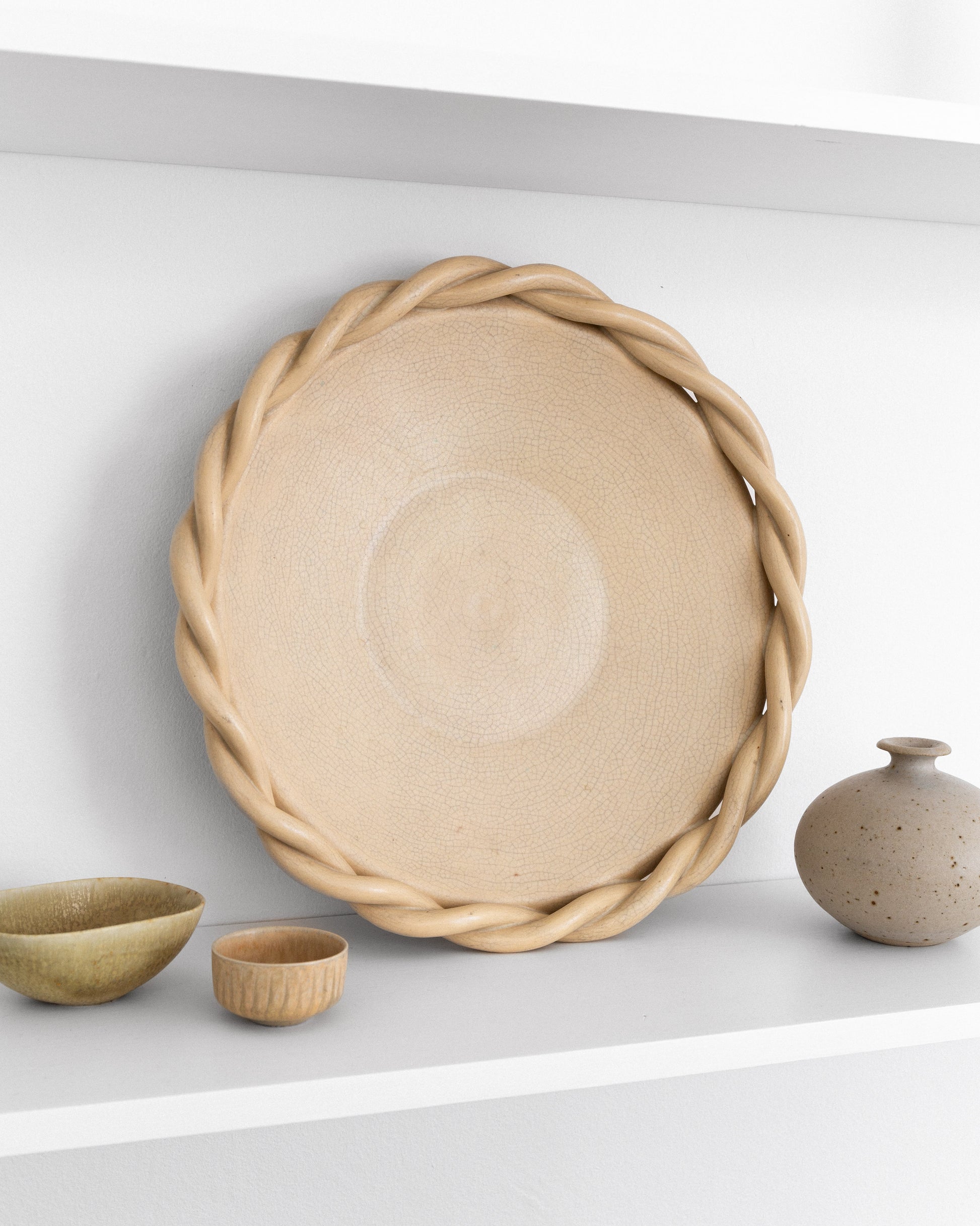Large faience bowl/plate with a beautiful braided rim and beige crackle glaze, attributed to Eva Jancke-Björk for Bo Fajans, 1940s. Perfect as a fruit bowl or simply as a sculptural decorative piece.