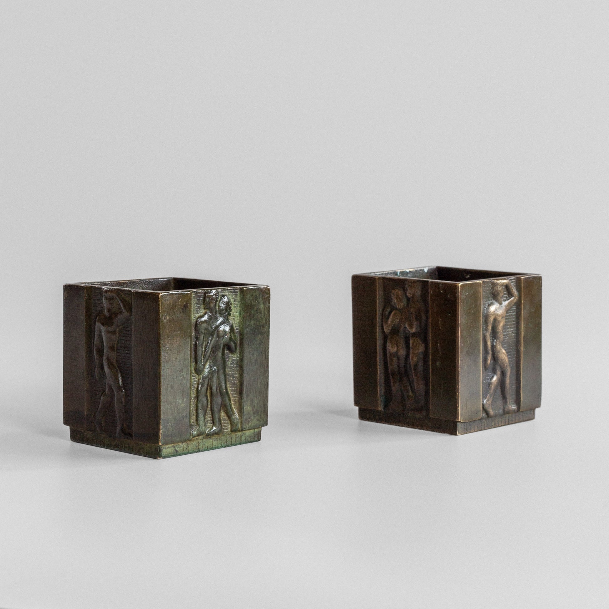 A pair of small, square bronze vases, originally intended as cigarette boxes, designed by Jacob Ängman for GAB (Guldsmedsaktiebolaget) in the 1930s. Each of the vase's four sides is adorned with relief sculptures of human figures in various poses, reflecting the classical and mythological themes characteristic of the period.