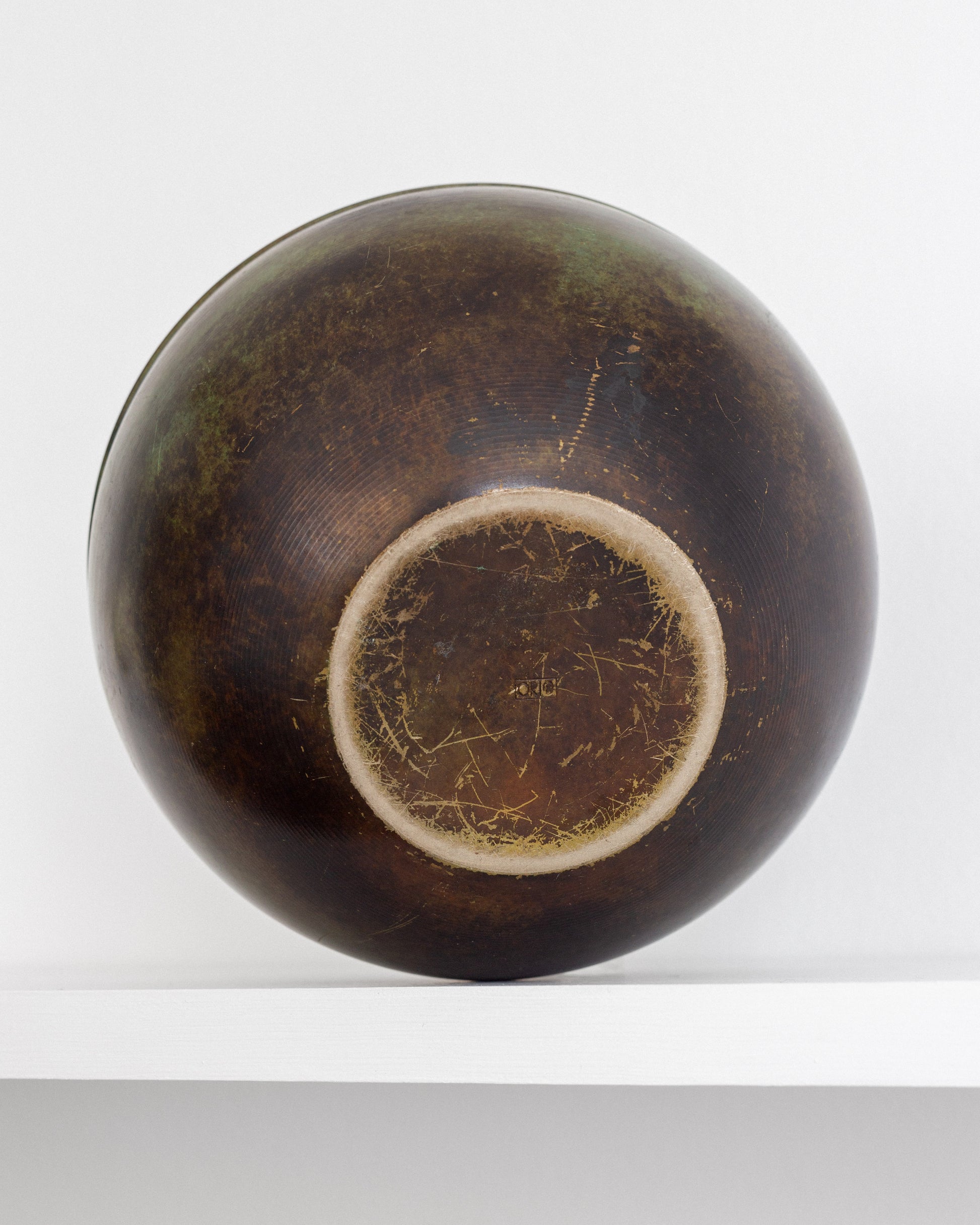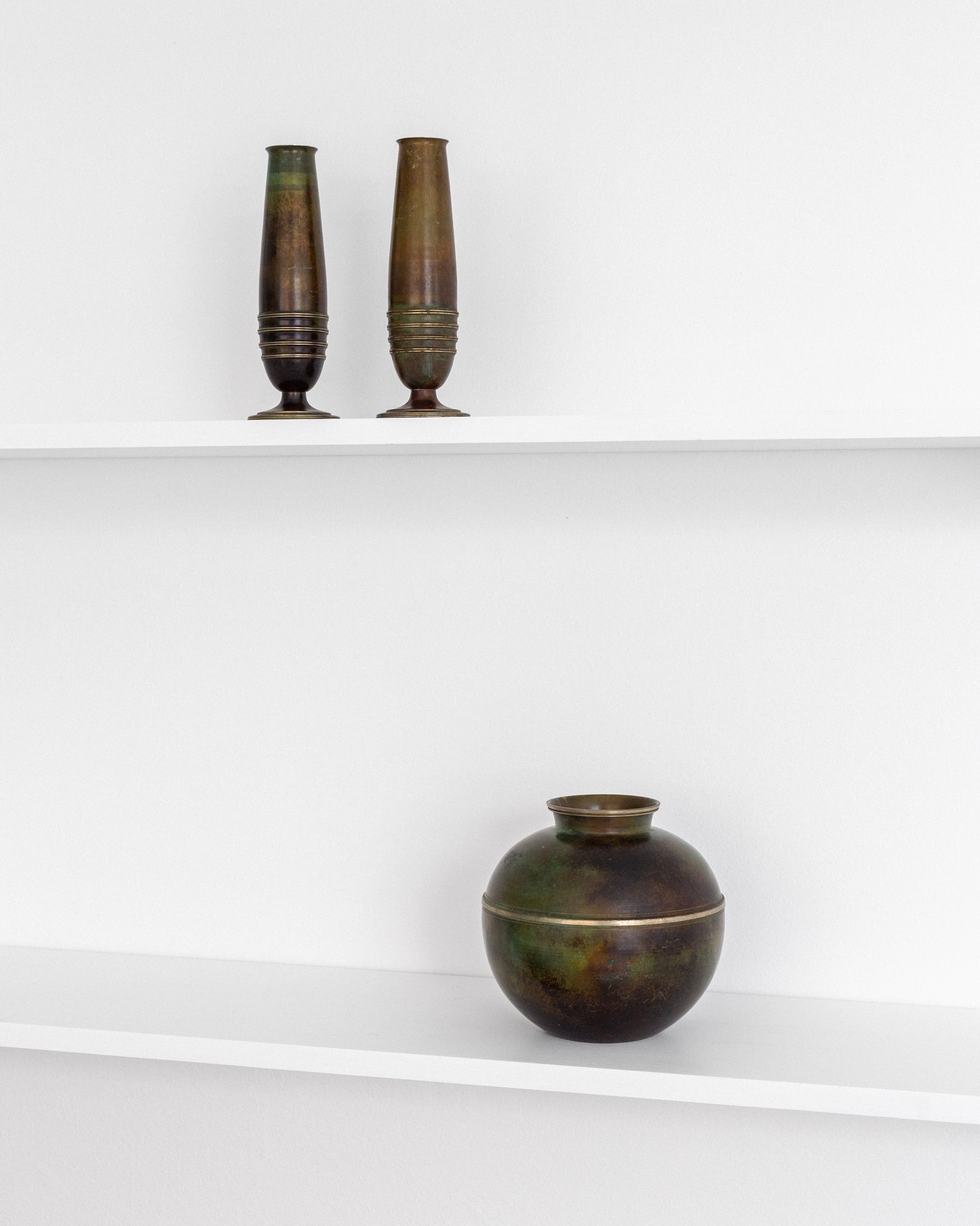 A rare 1940s Modernist vase by GAB (Guldsmedsaktiebolaget), Sweden. This vase displays a stunning patina with rich hues of green, brown, and bronze, complemented by elegant silver-toned metal accents. Crafted in 'Ori' metal—a patented bronzed babbitt technique developed by GAB in the 1920s.