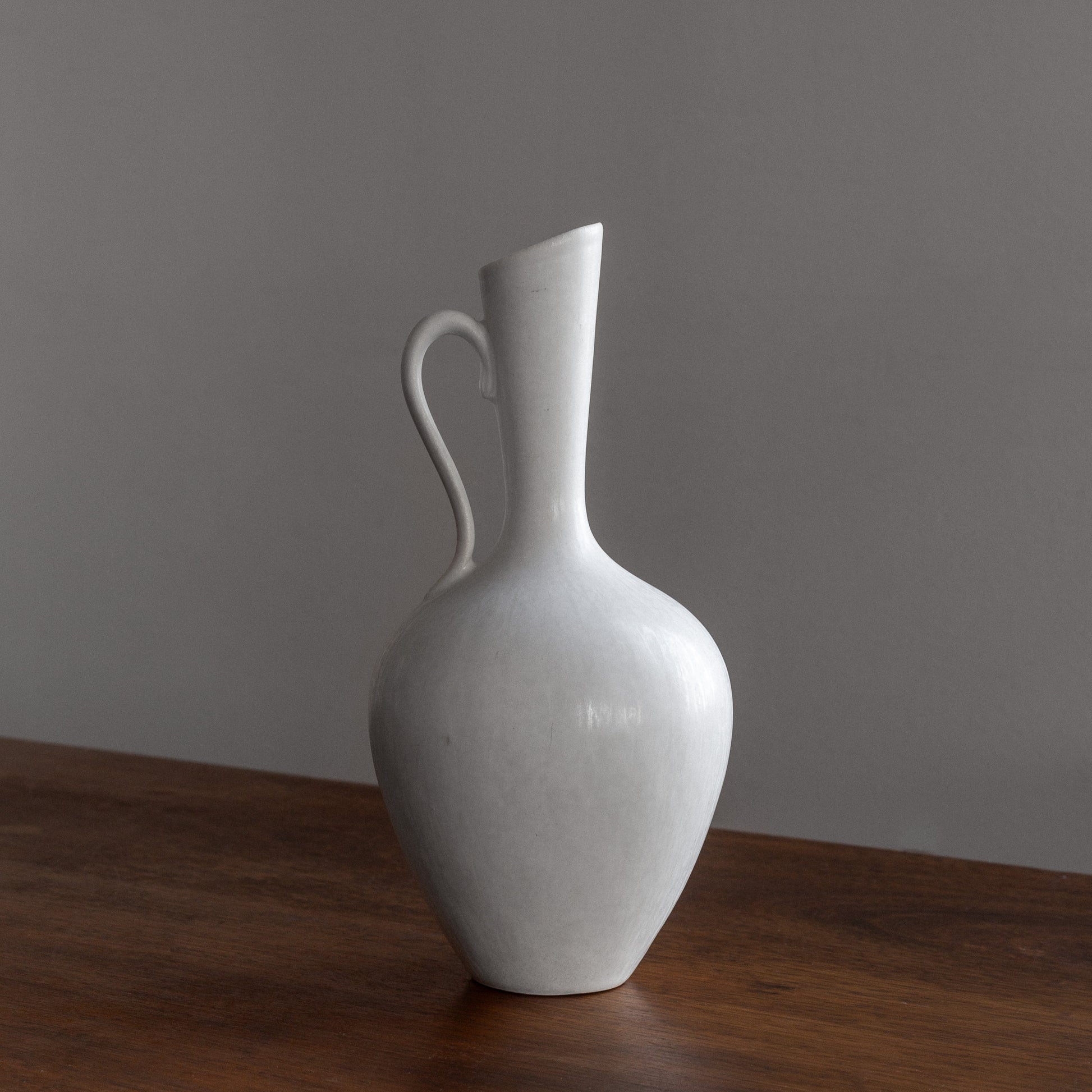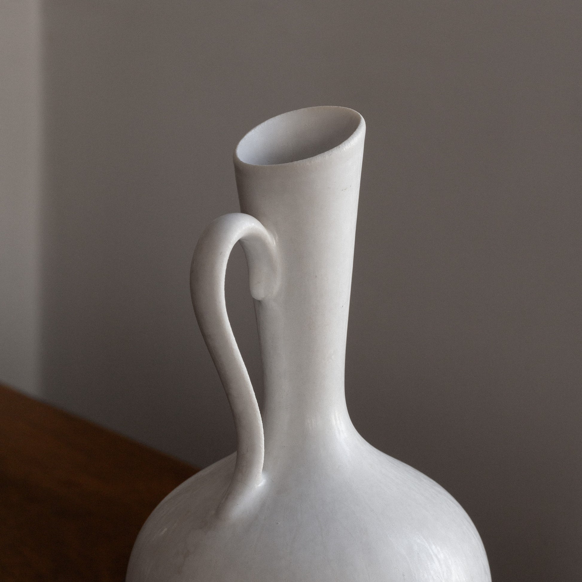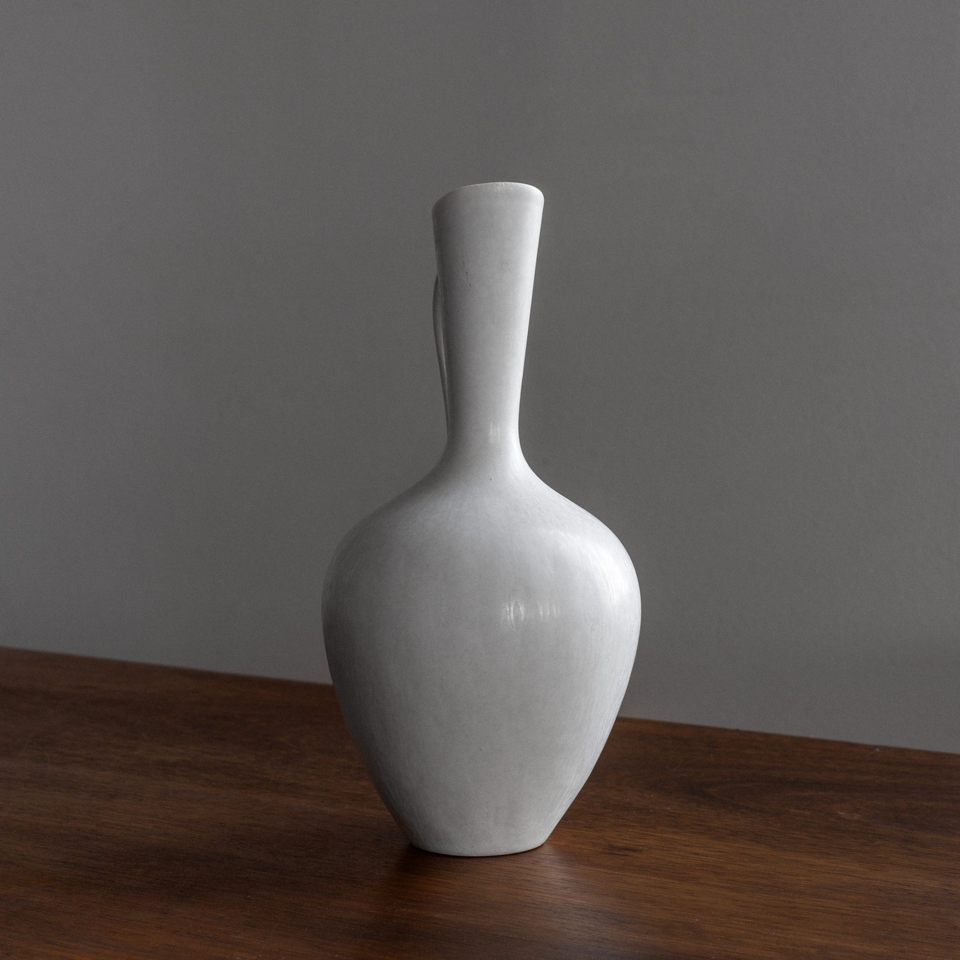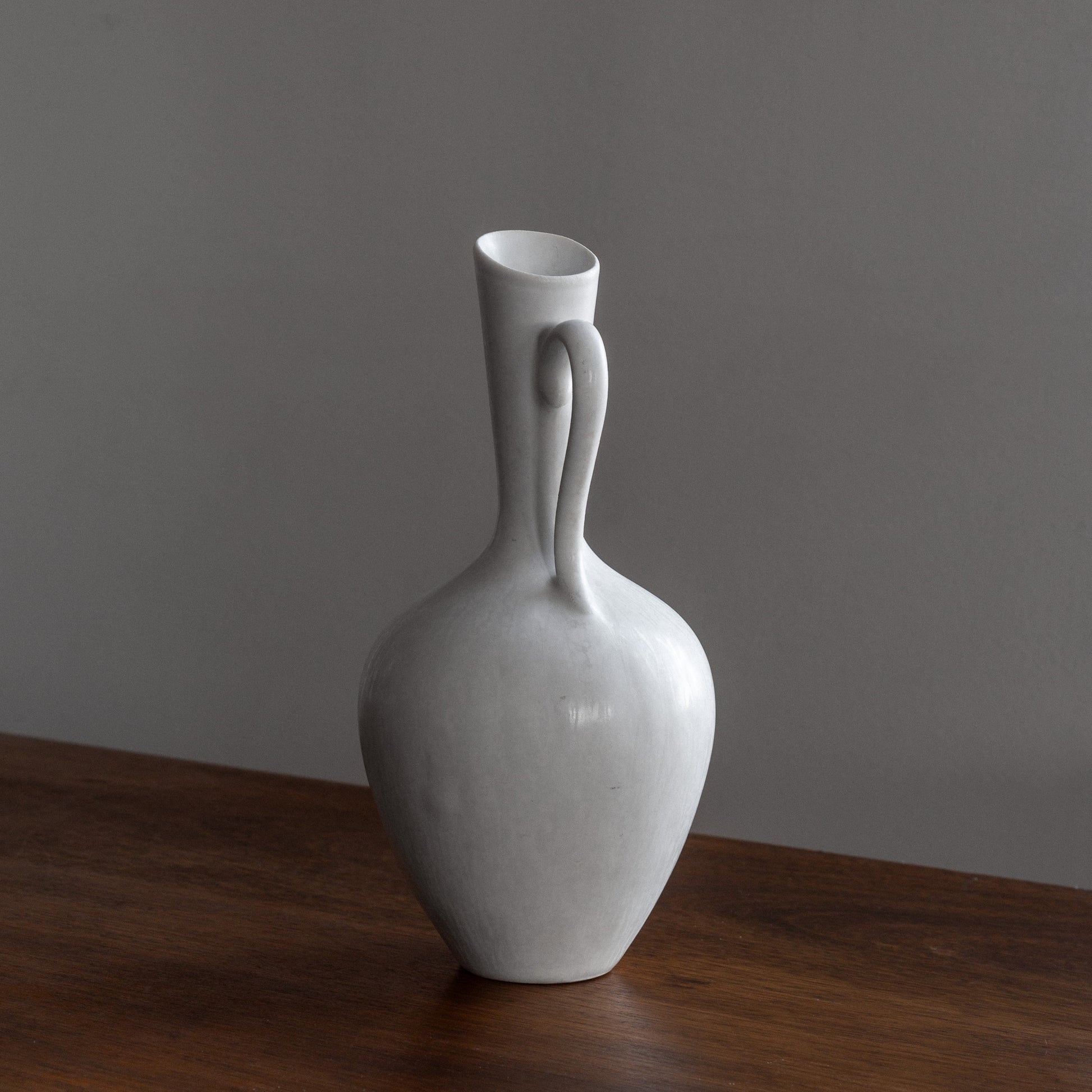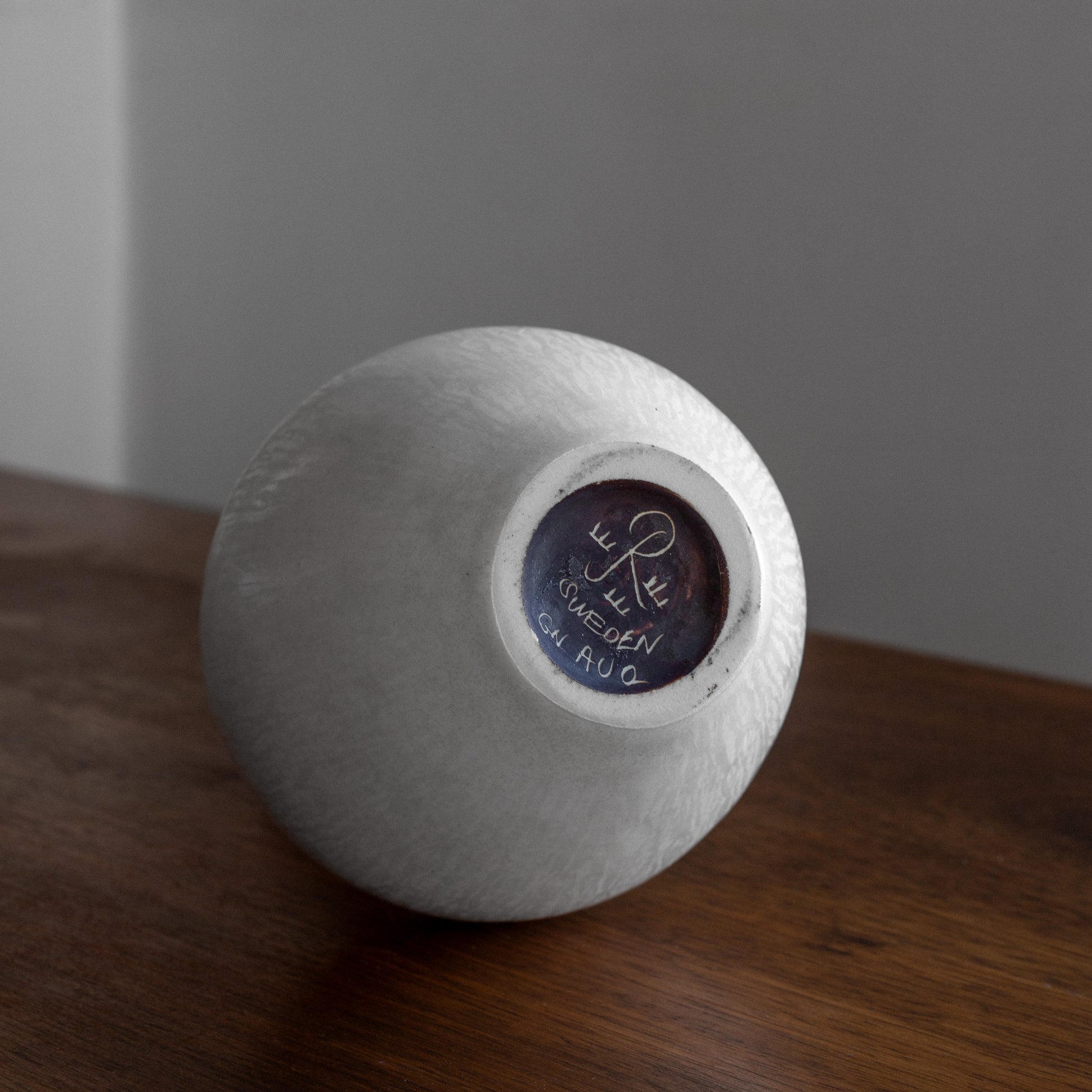 Stoneware vase, model "AUQ," featuring an elegant white haresfur glaze that creates a soft, tactile surface. Designed by Gunnar Nylund for Rörstrand in the 1950s, this piece exemplifies the refined aesthetics and craftsmanship of mid-century Scandinavian design. It remains in good condition, with very light surface wear consistent with age.