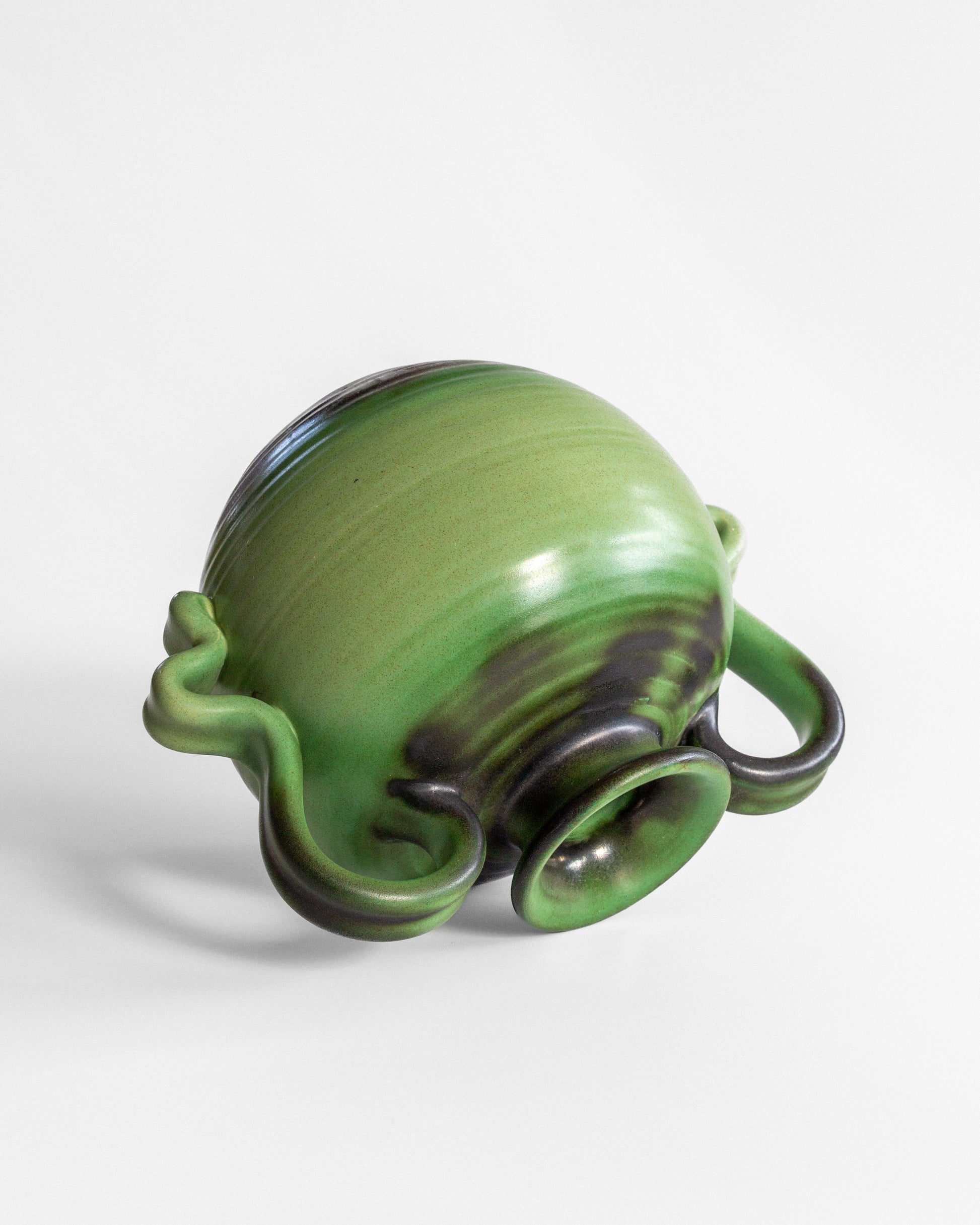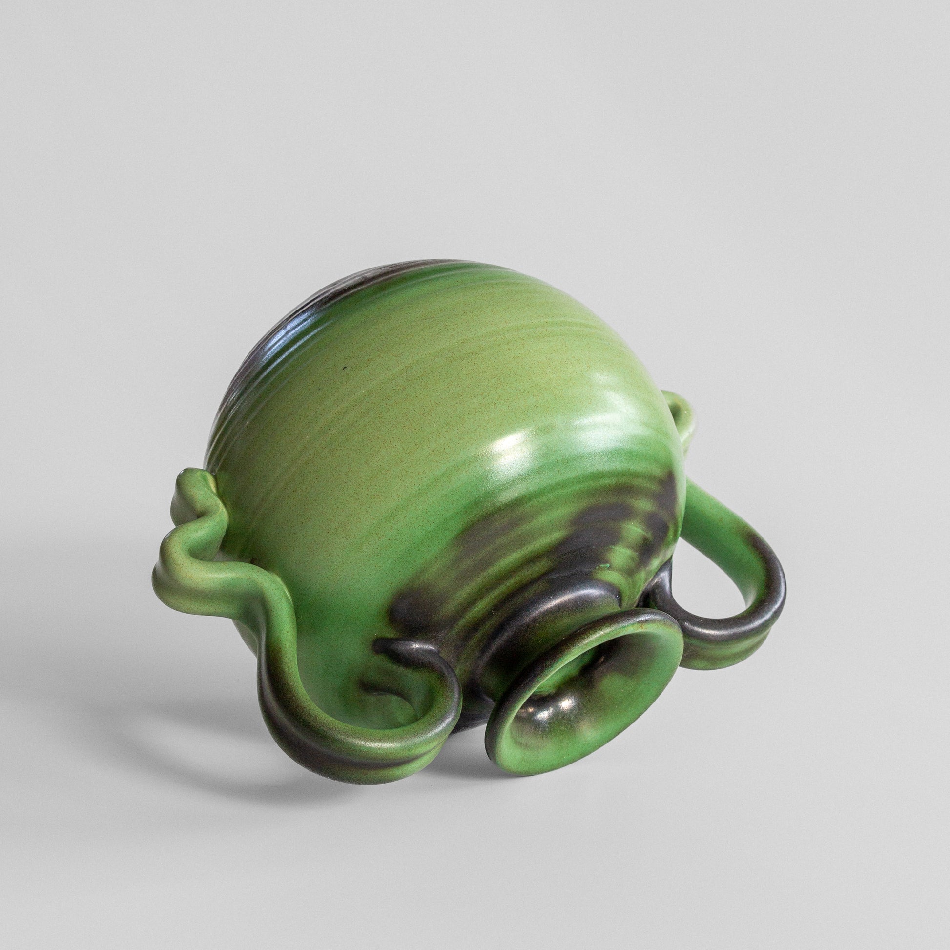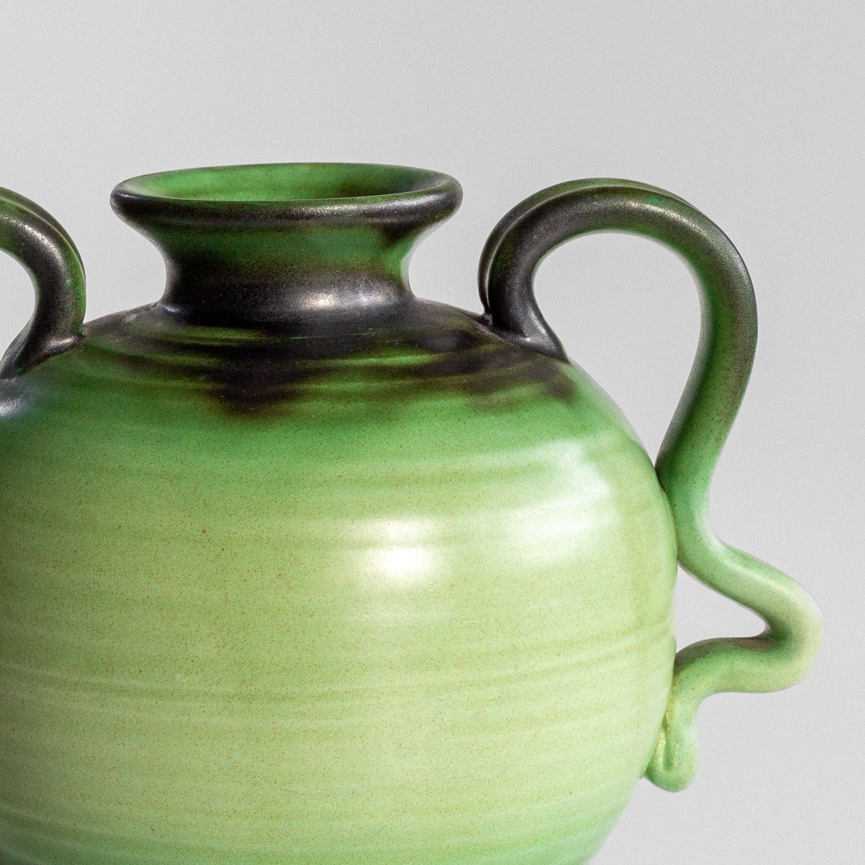 An earthenware vase with ornamental handles and a glaze titled 'Grafit,' featuring mingled shades of green and black, designed by Eva Jancke-Björk for Bo Fajans