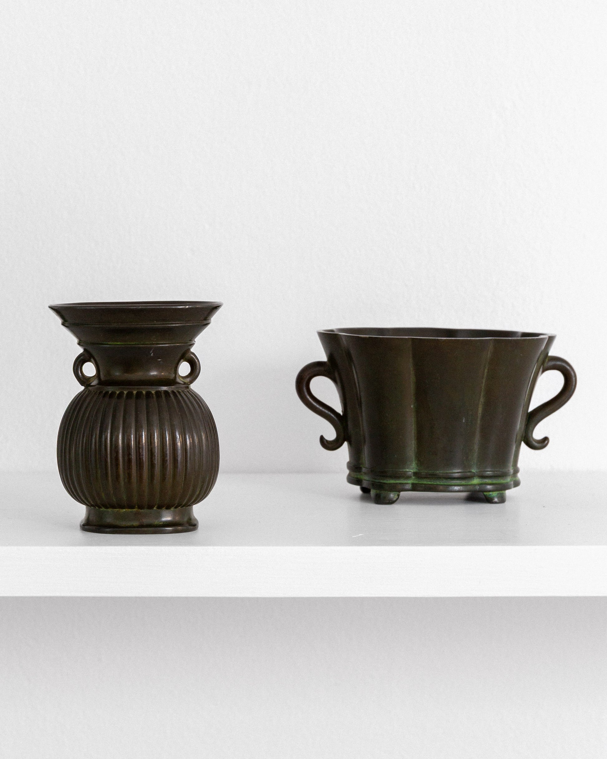 Miniature jardiniere by Danish silversmith and sculptor Just Andersen (1884-1943). Crafted in the 1930s from Disko metal—an alloy invented by Andersen that resembles bronze.