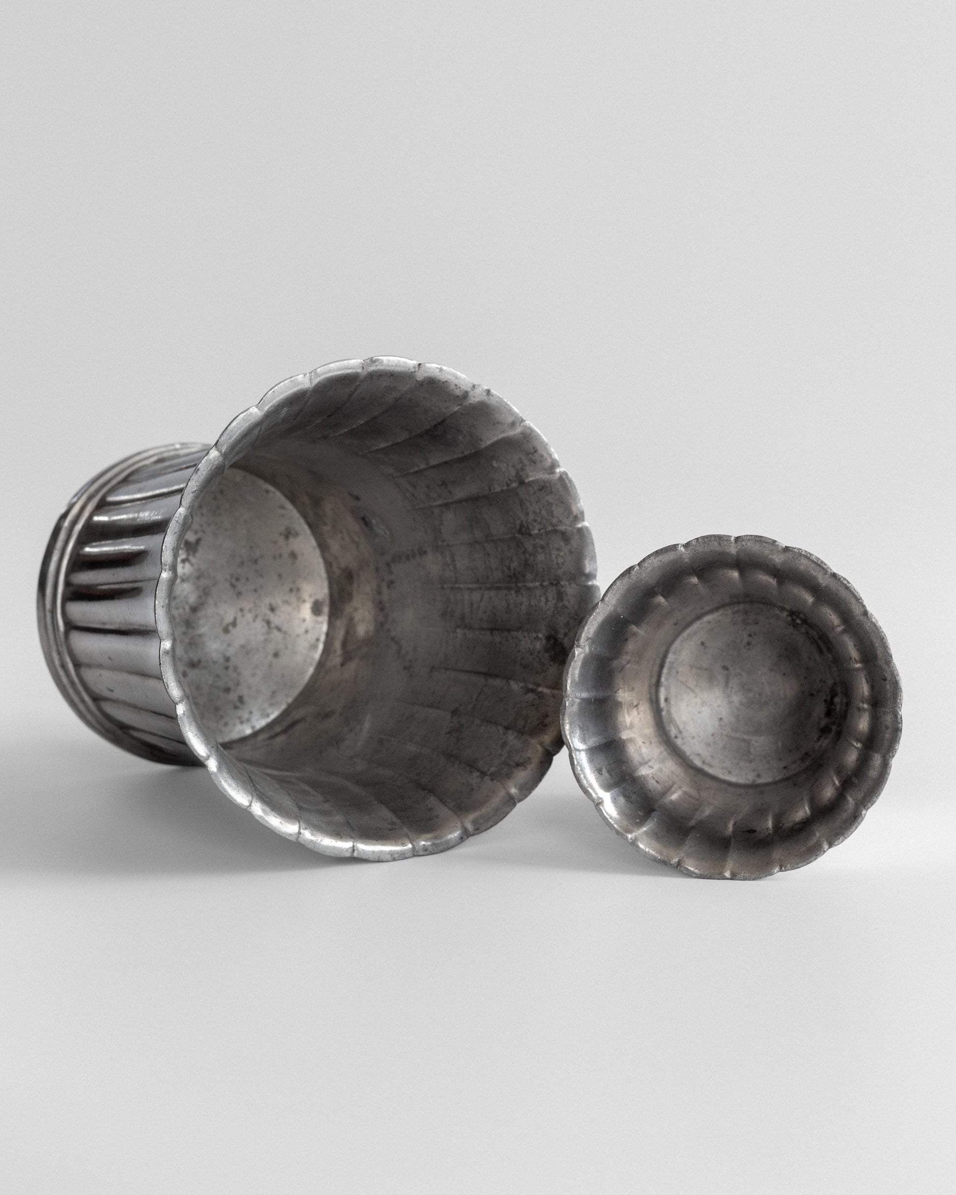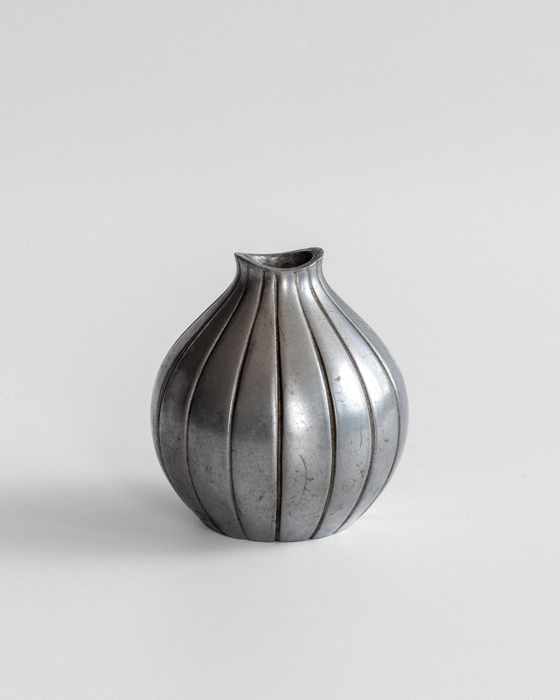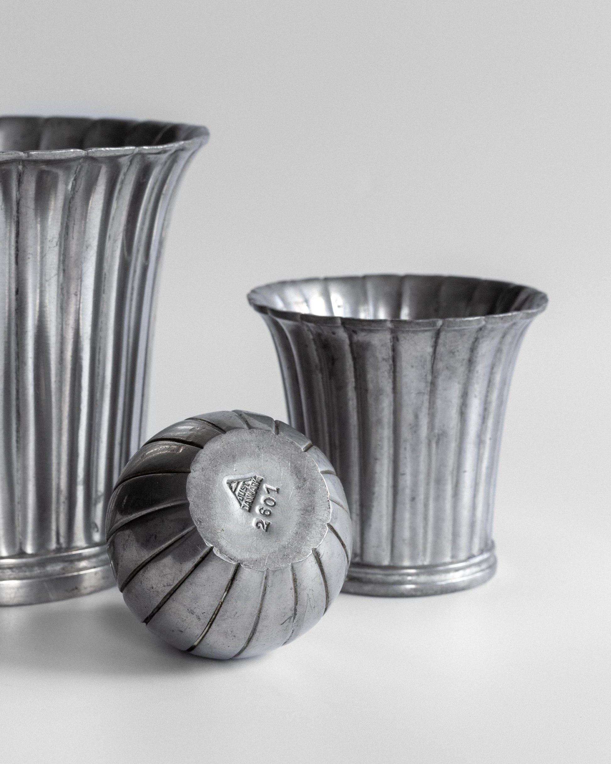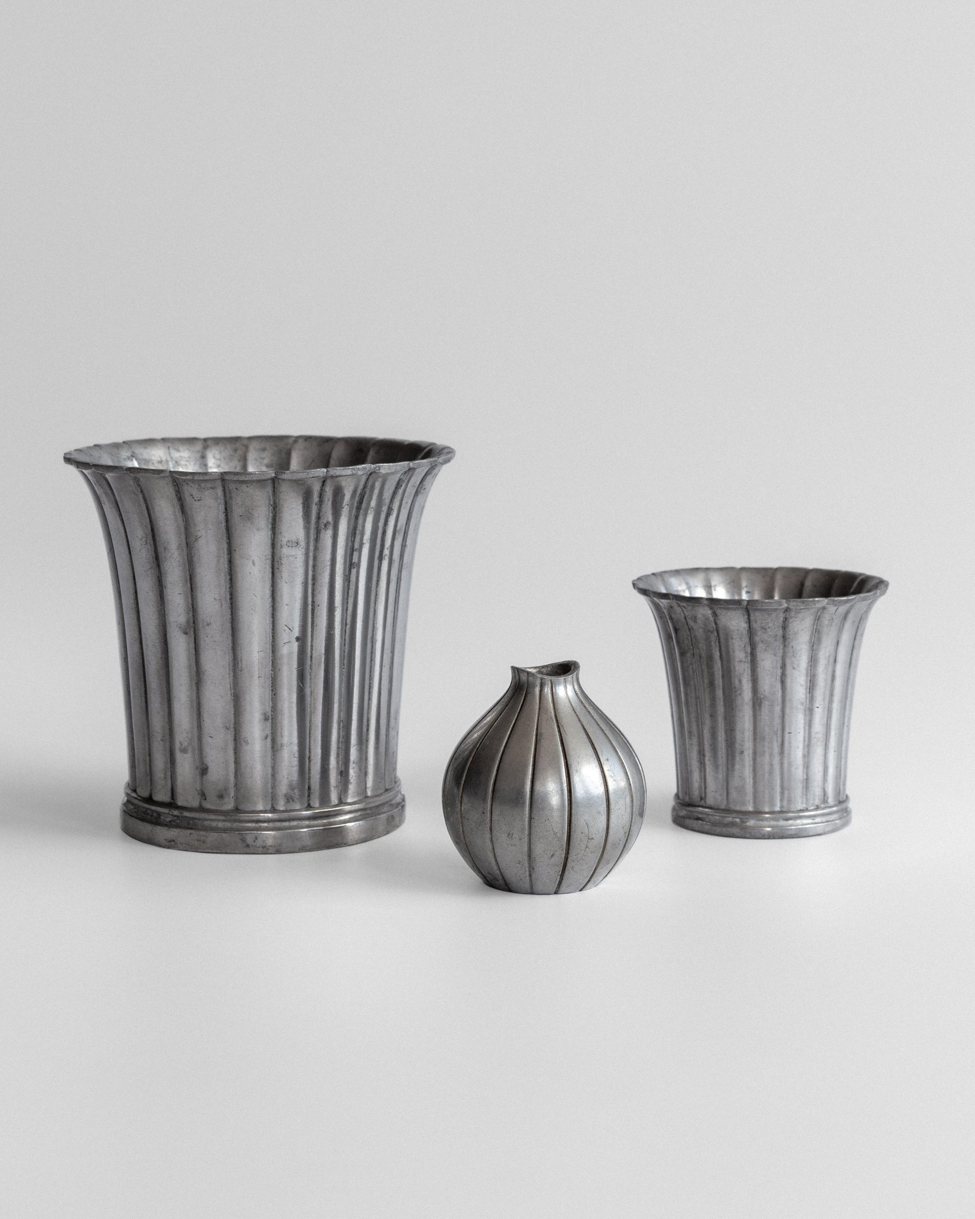 A set of three pewter pieces by Danish silversmith and sculptor Just Andersen (1884-1943). This set includes two fluted vases in different sizes and one distinctive miniature bulbous vase, all showcasing Andersen’s characteristic ribbed design and sculptural form. Crafted in the 1930s-40s, these pieces are perfect as decorative objects for the collector of Scandinavian design.