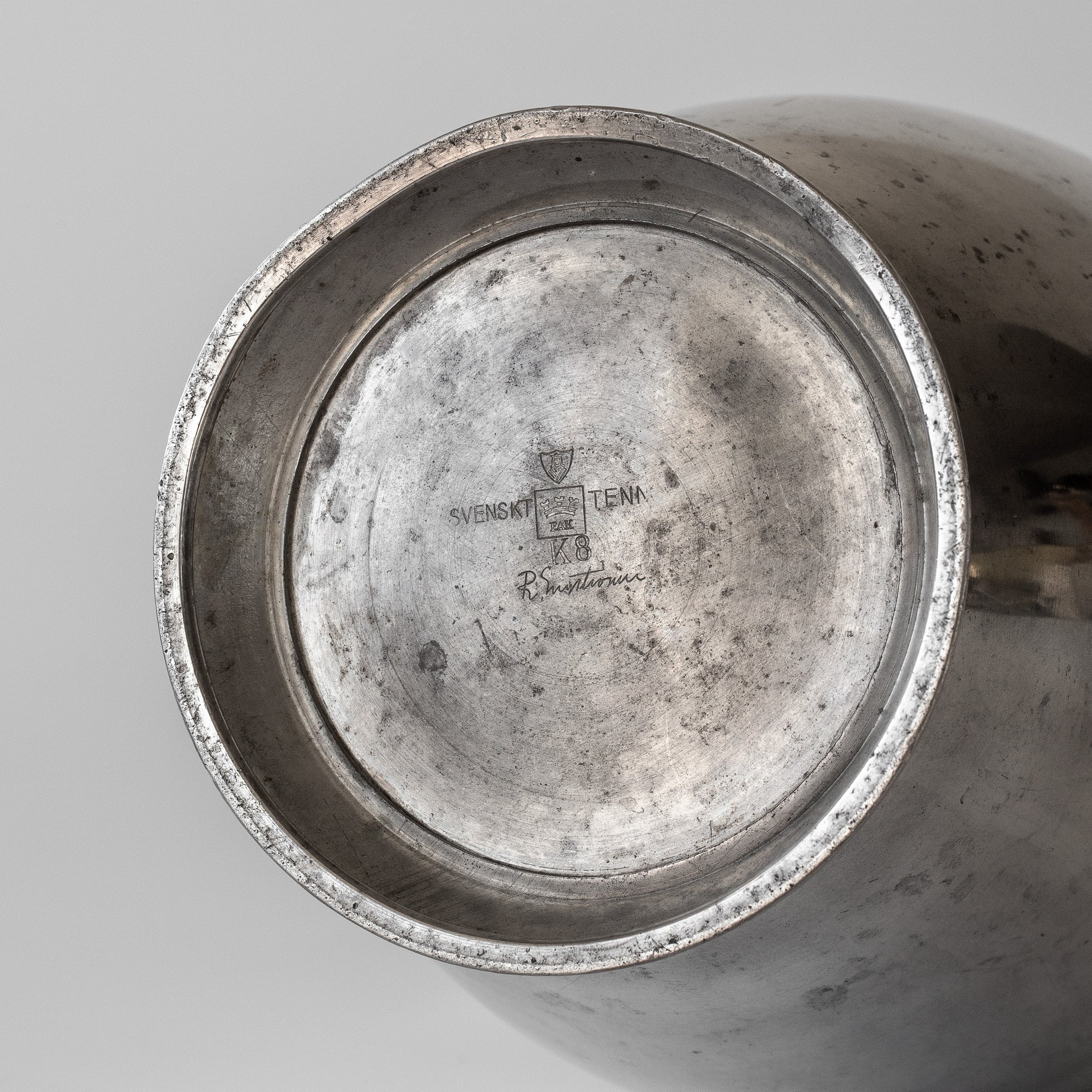 A large Modernist amphora in pewter, designed in the 1930s by Swedish architect Rolf Engströmer for FAK (Fabriksaktiebolaget Kronsilver). This piece exemplifies the functional elegance of early 20th-century Scandinavian metalwork.