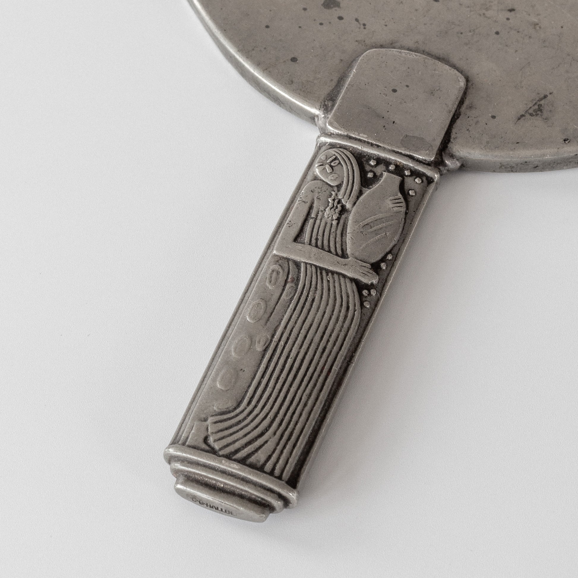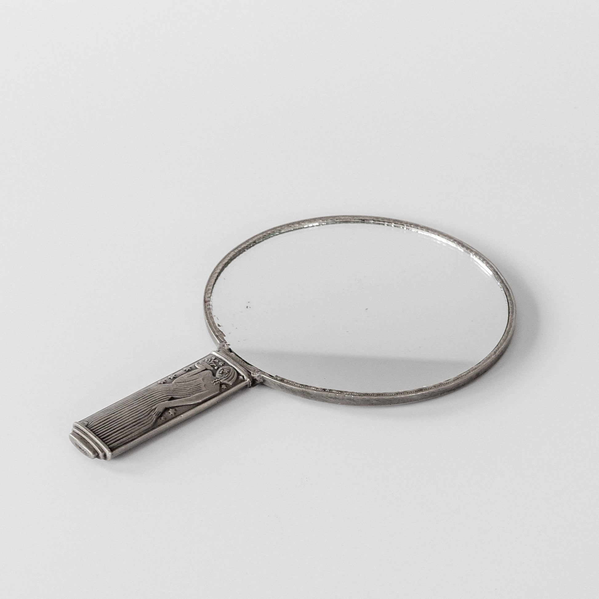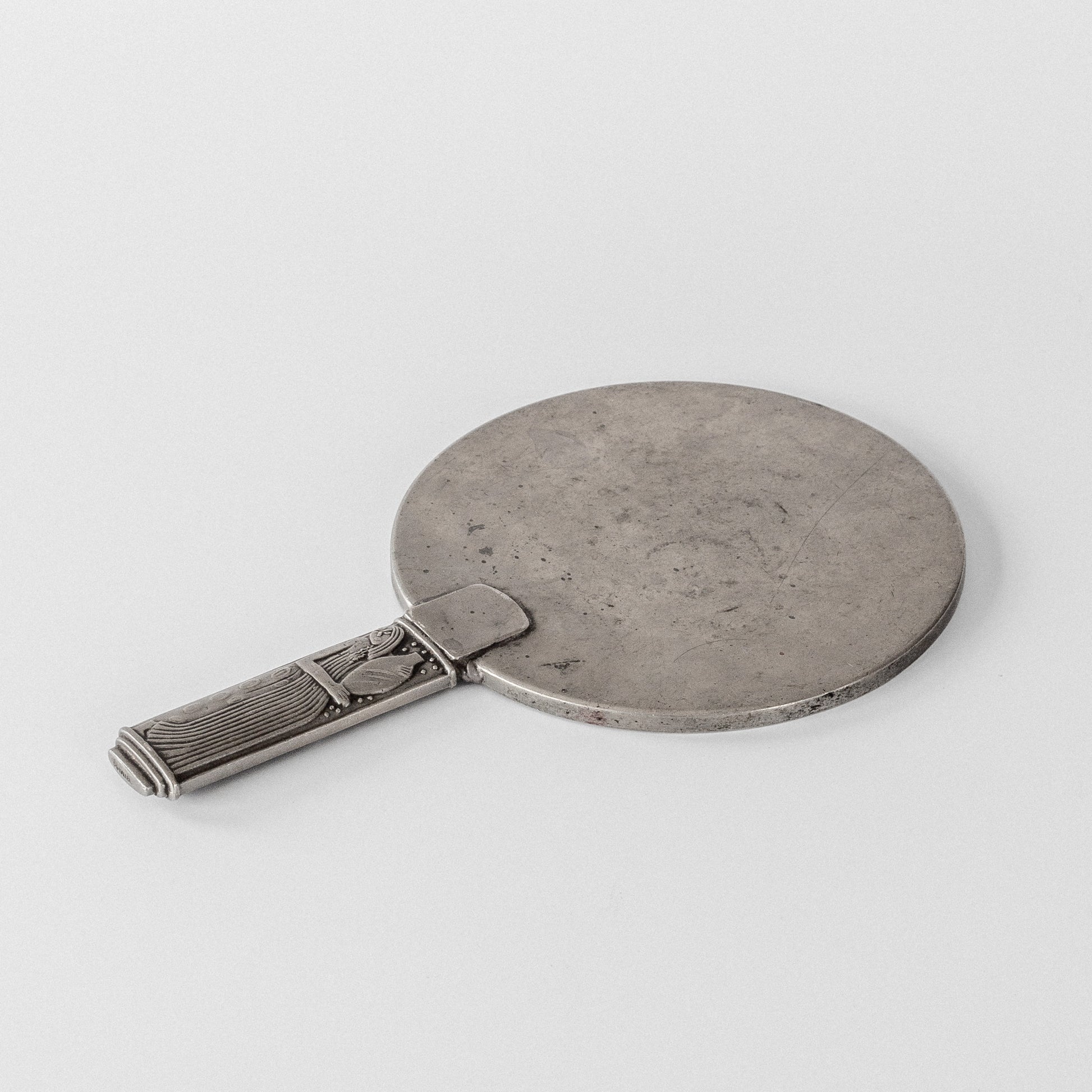 An elegant pewter hand mirror by celebrated Swedish silversmith Sylvia Stave, one of Sweden's most innovative modernist designers of the 1930s. Created for the company C.G. Hallberg, the handle's Art Deco reliefs with different stylized female figures on each side reflect the legacy of Swedish Grace while embracing modernist principles. The circular mirror is framed by a delicate pewter border that complements the sculptural handle, showcasing Stave's masterful ability to bridge decorative traditions with clean, modernist design.