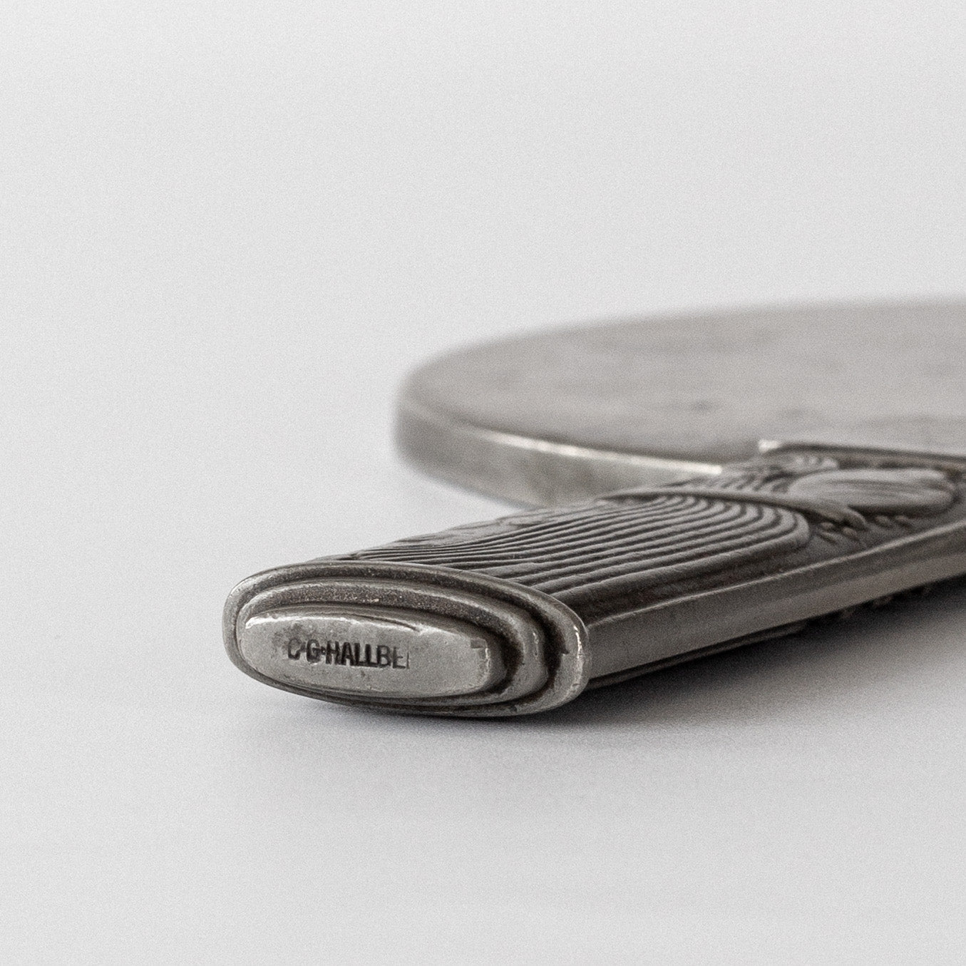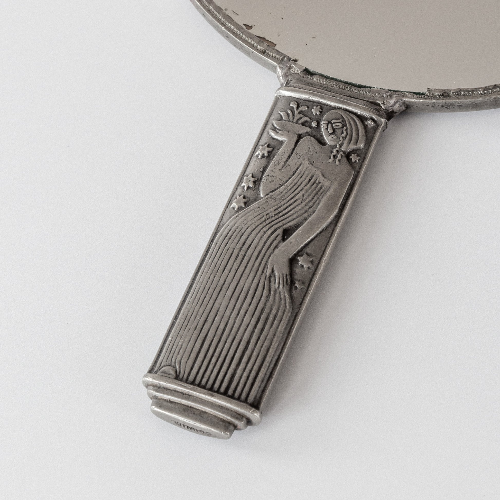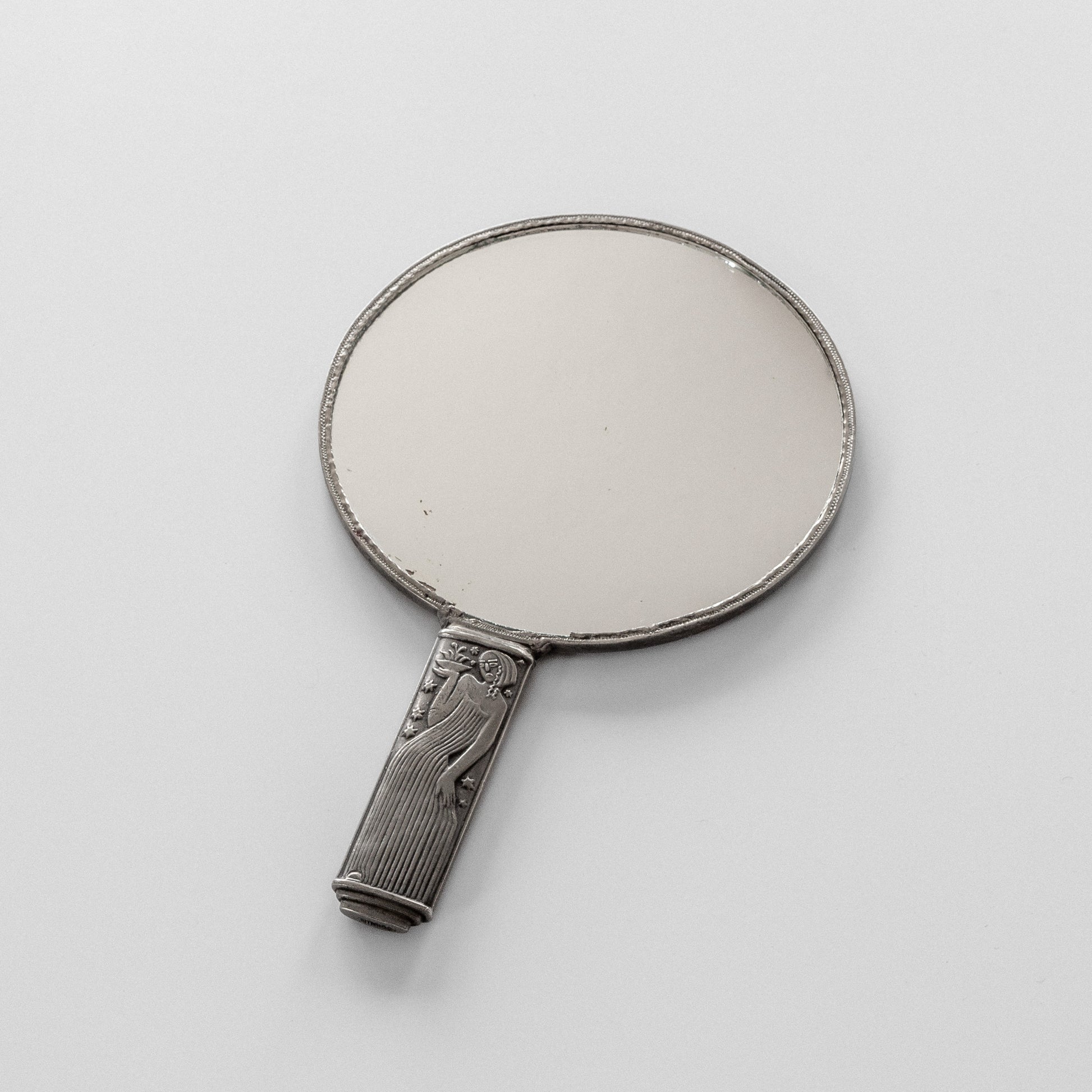 An elegant pewter hand mirror by celebrated Swedish silversmith Sylvia Stave, one of Sweden's most innovative modernist designers of the 1930s. Created for the company C.G. Hallberg, the handle's Art Deco reliefs with different stylized female figures on each side reflect the legacy of Swedish Grace while embracing modernist principles. The circular mirror is framed by a delicate pewter border that complements the sculptural handle, showcasing Stave's masterful ability to bridge decorative traditions with clean, modernist design.