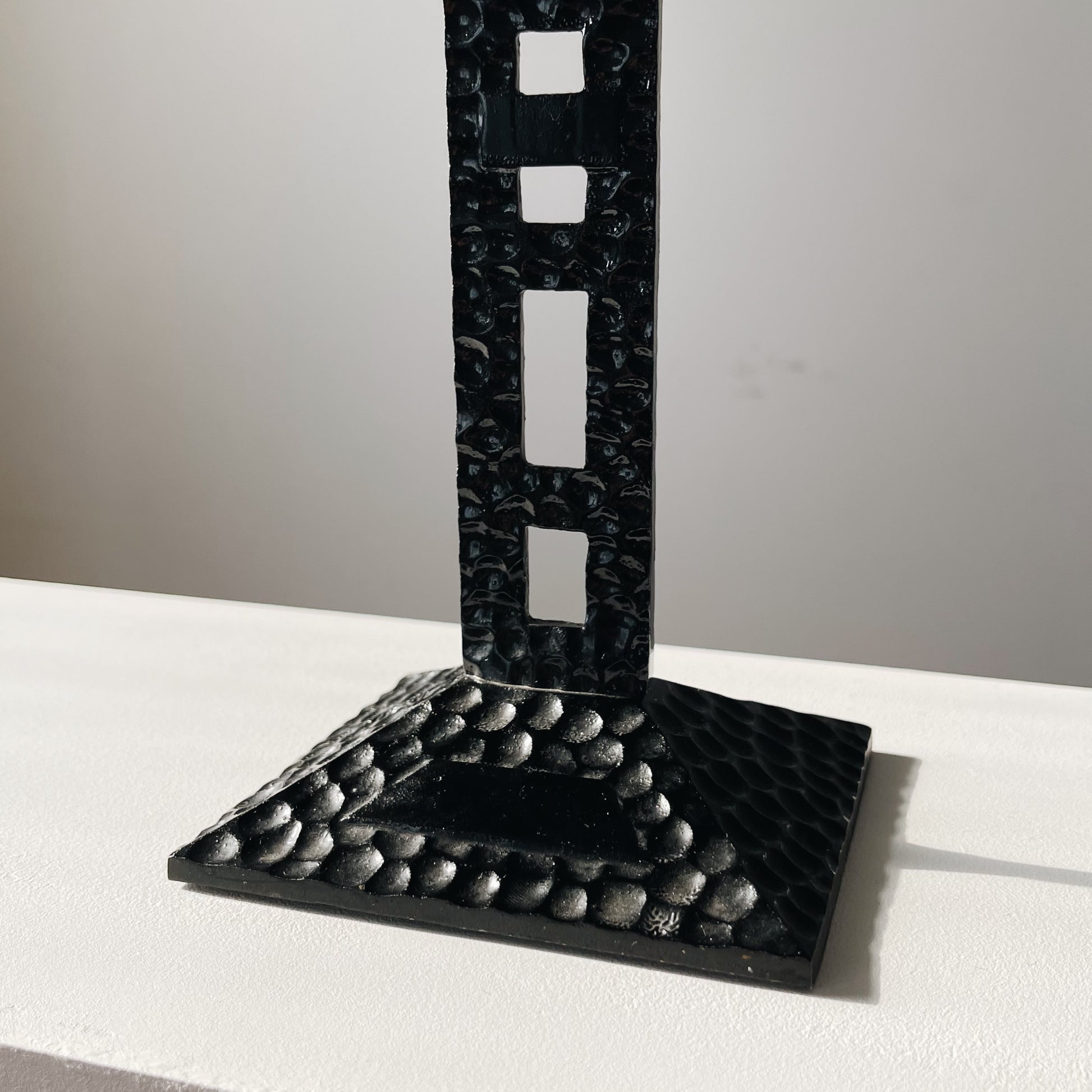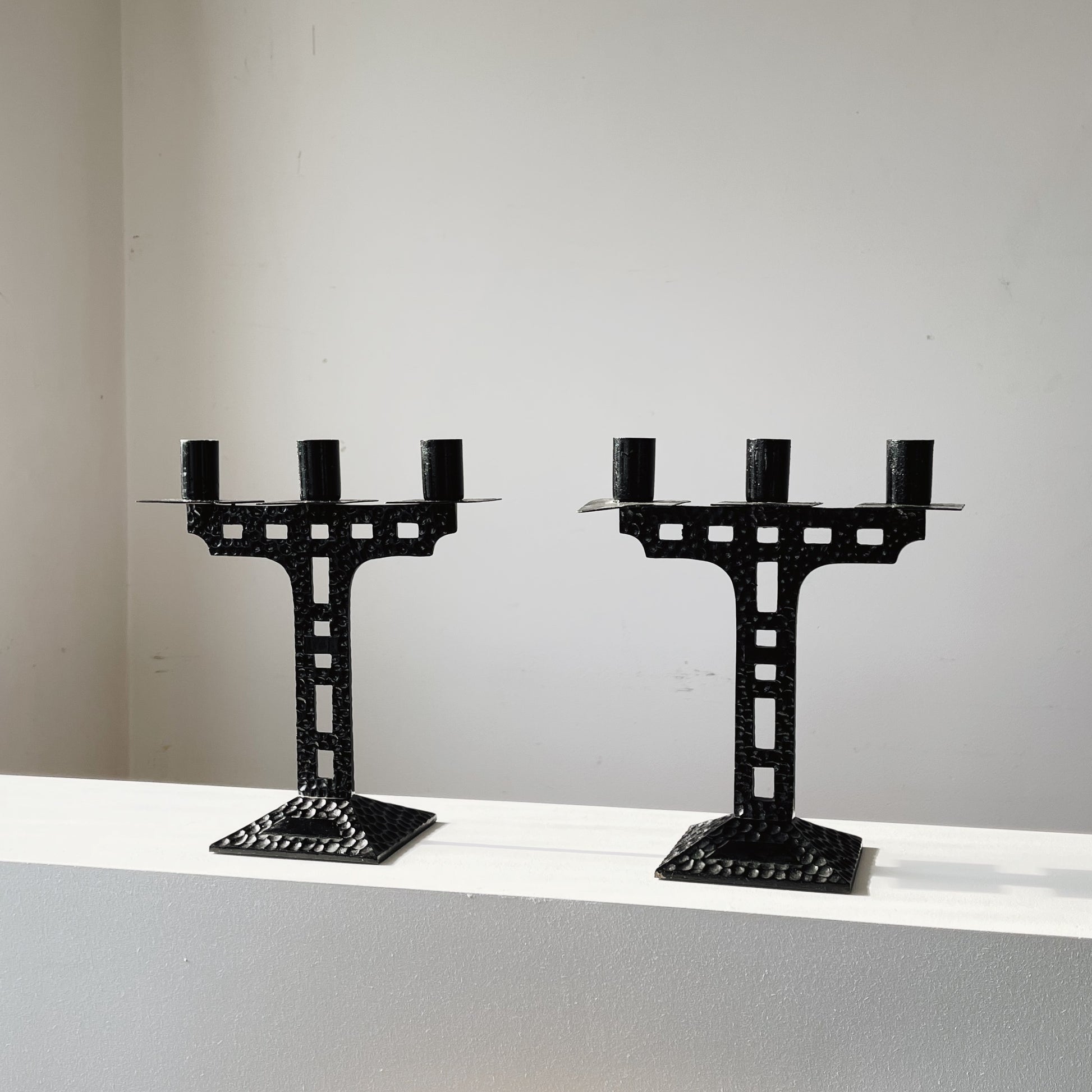 Dating from the early 20th Century, circa 1910, and of Swedish origin, this pair or wrought iron candelabras are hand-made and in the style of Jugend. Very well preserved pieces with elegant yet rustic design.