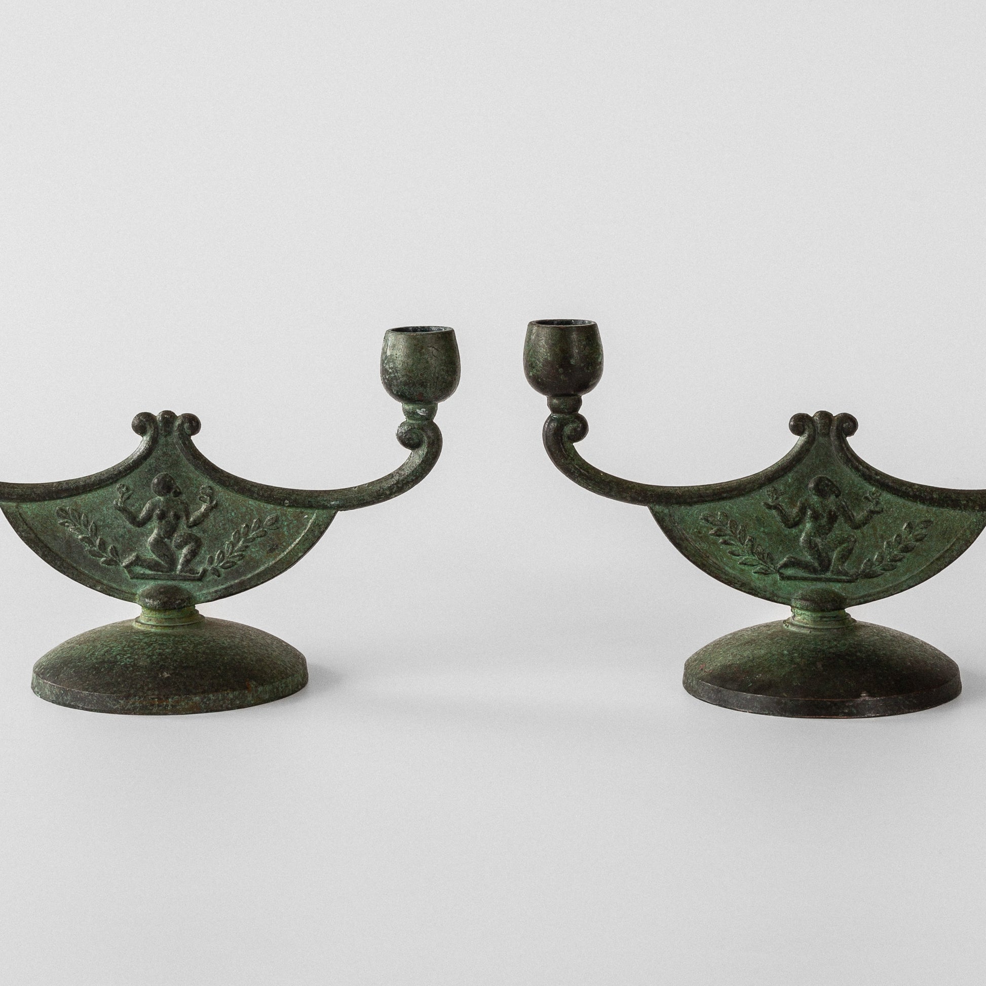 A graceful pair of double-arm candelabra by Swedish manufacturer Zicu Metal, featuring an elegant Art Deco design with decorative leaf motifs and stylized figures adorning the center. Each piece displays a rich, patinated bronze finish with varying green hues. The classical form showcases the refined craftsmanship of 1930s Swedish metalwork. Use as a sophisticated centerpiece for a dining table, mantelpiece, or sideboard to add both ambiance and sophistication to any room.