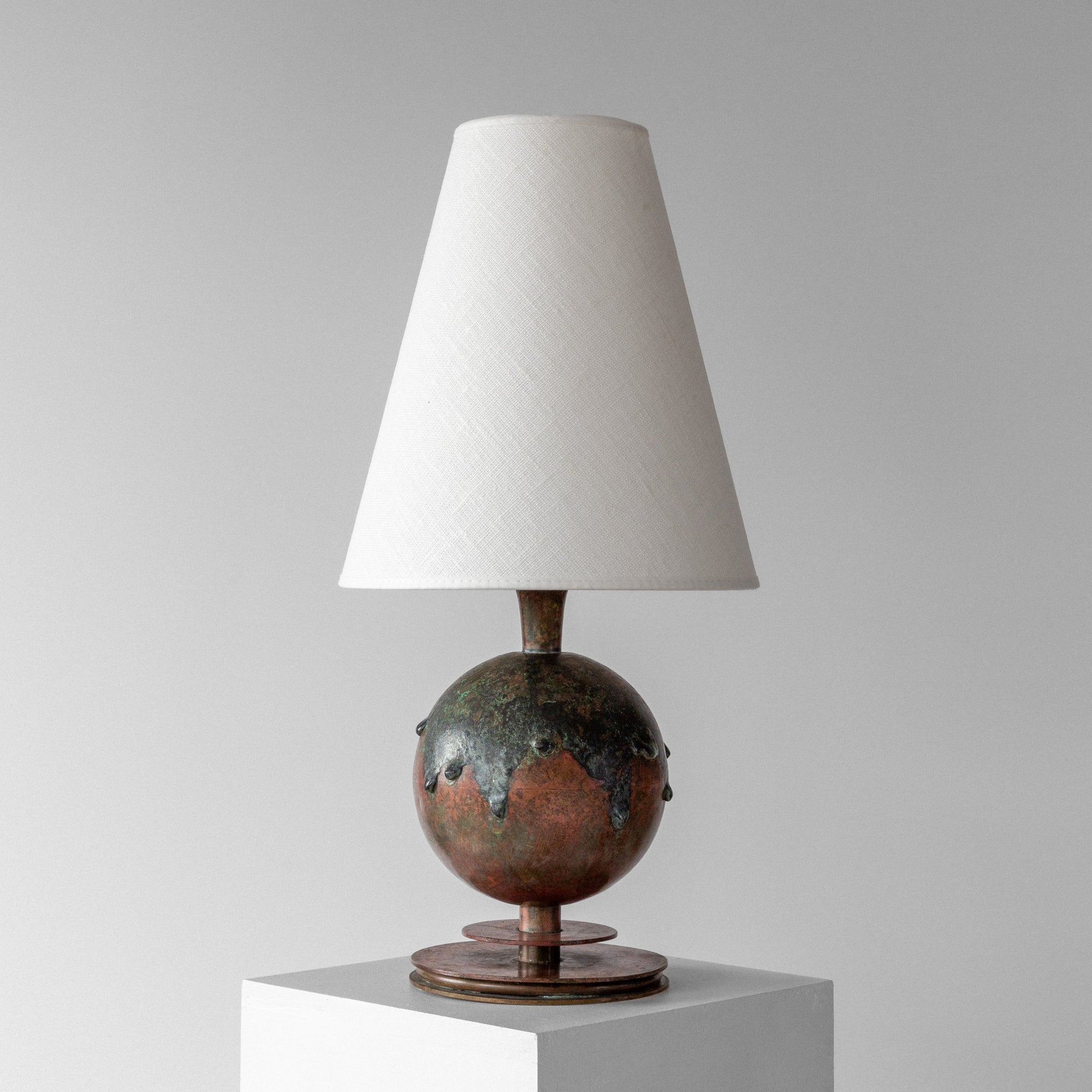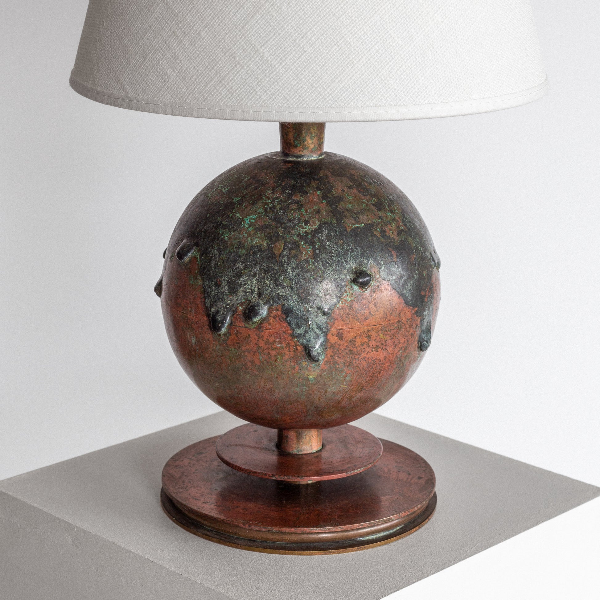 The design features a spherical copper base with dramatic, patinated bronze drip elements. The oxidized bronze overlay showcases a natural patina that has developed beautifully over time, with subtle verdigris accents. These bronze drips and its organic aesthetic stands as a bold artistic choice during an era when restraint and clean geometric elegance dominated Swedish design sensibilities.