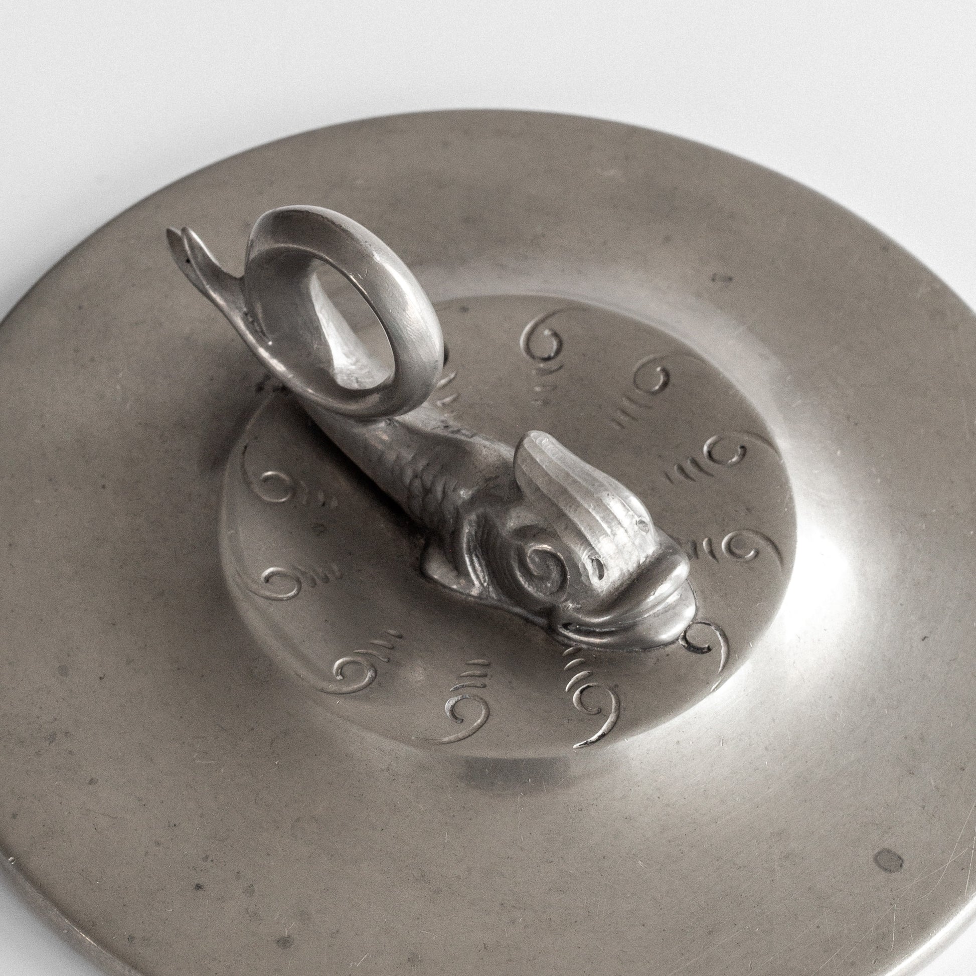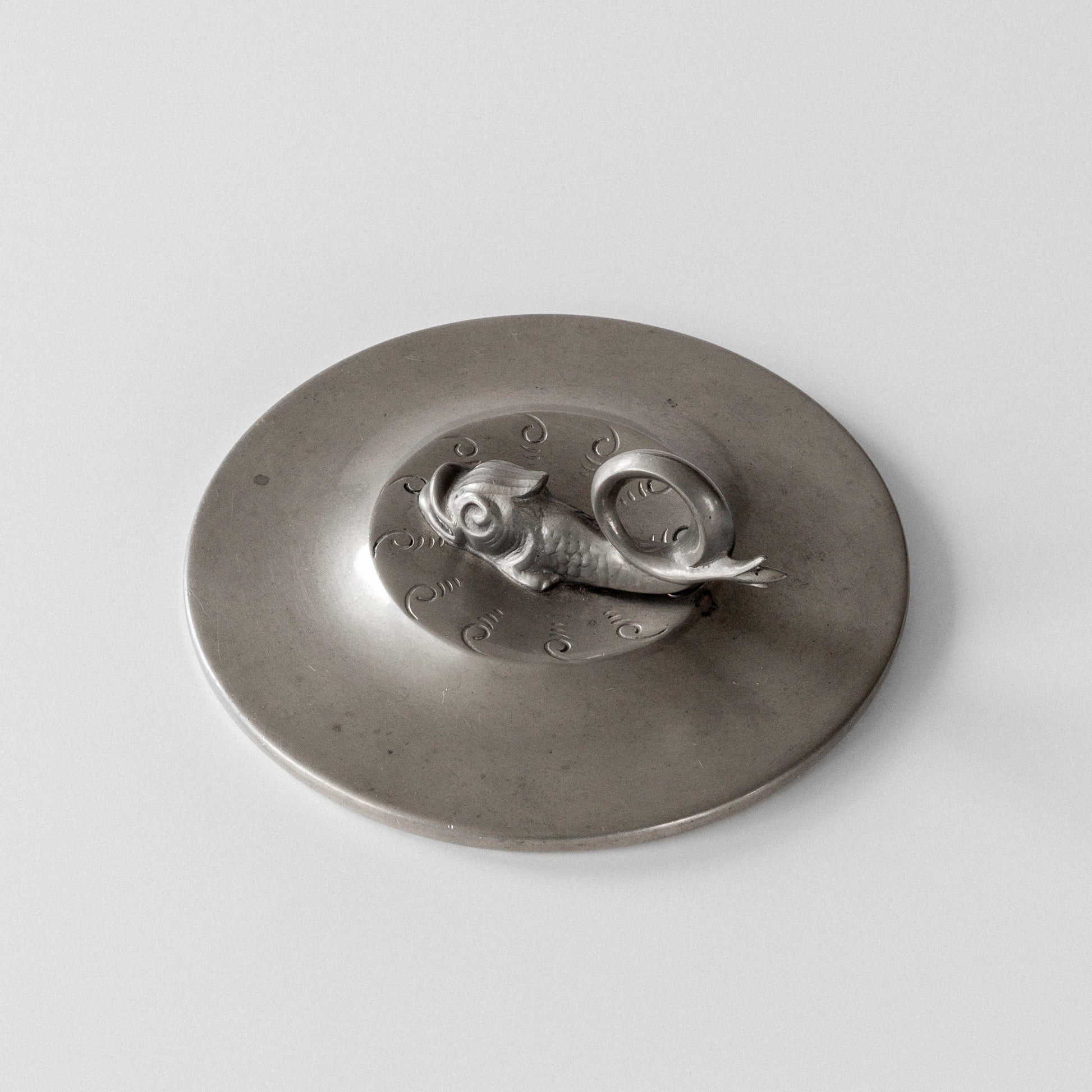 The design features a beautifully sculpted koi fish in relief, swimming amidst stylized waves and scrolls, drawing inspiration from Japanese motifs. The fish's scales and flowing fins are rendered with remarkable detail, while the surrounding pattern maintains the overall elegant simplicity. The piece demonstrates the height of Swedish craftsmanship during a golden age