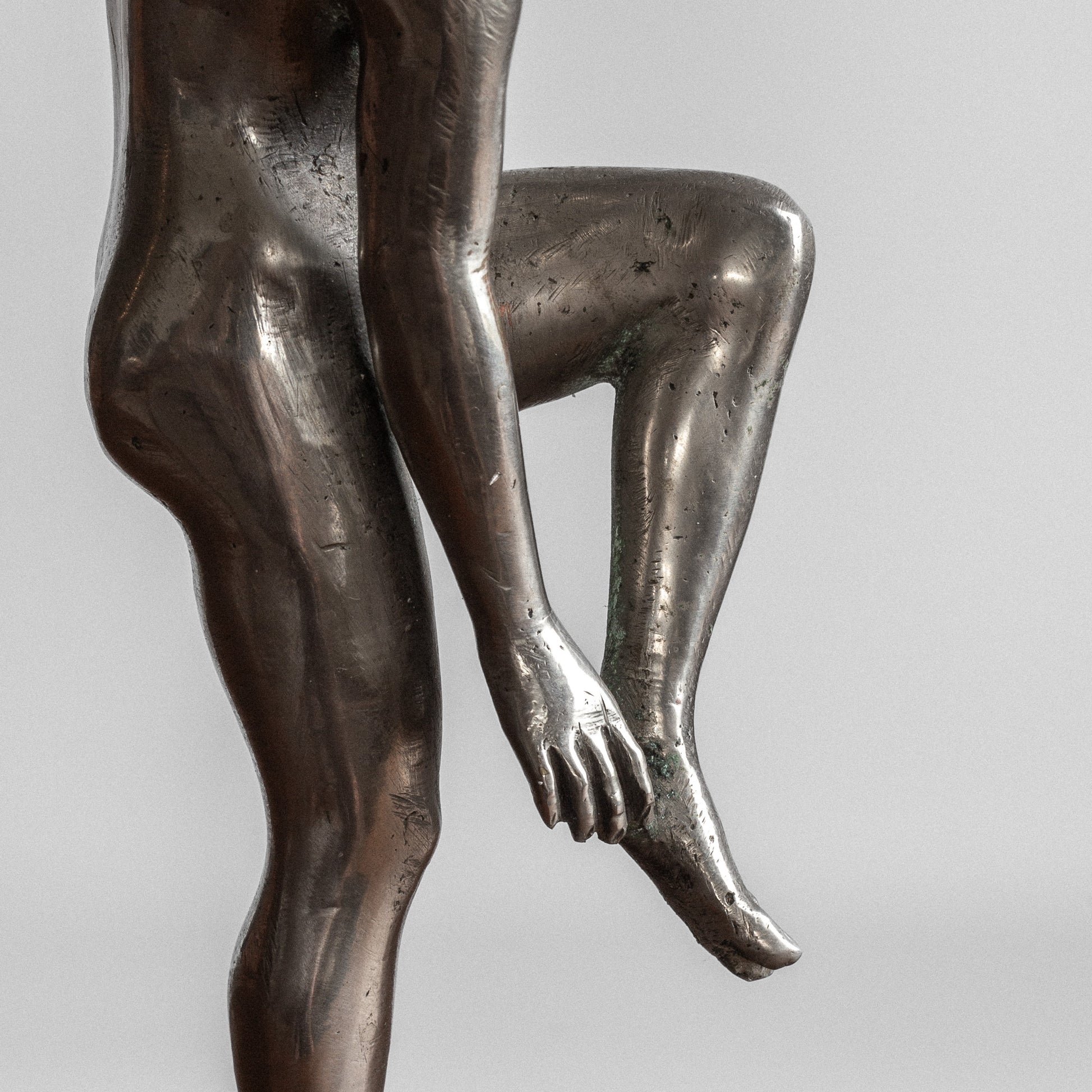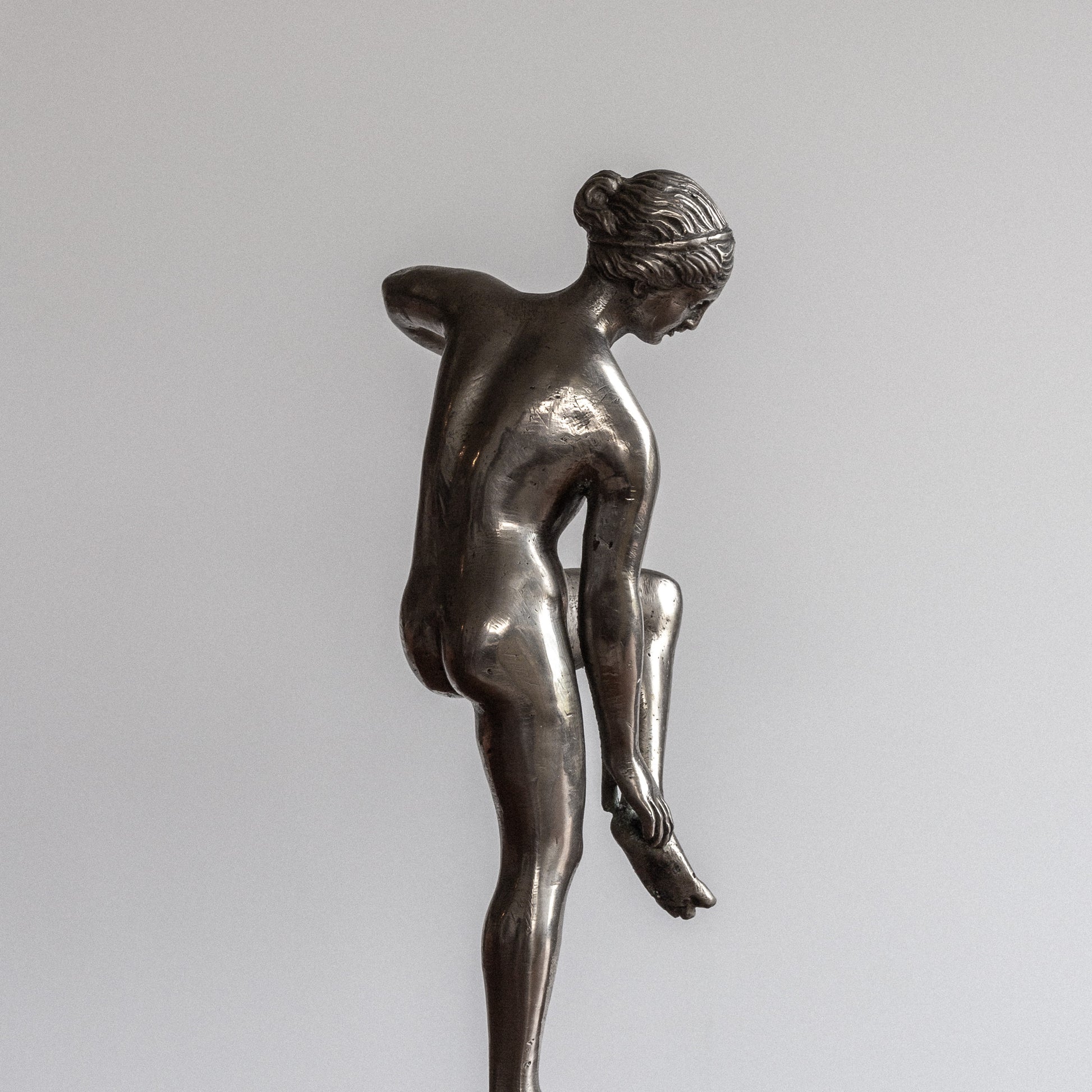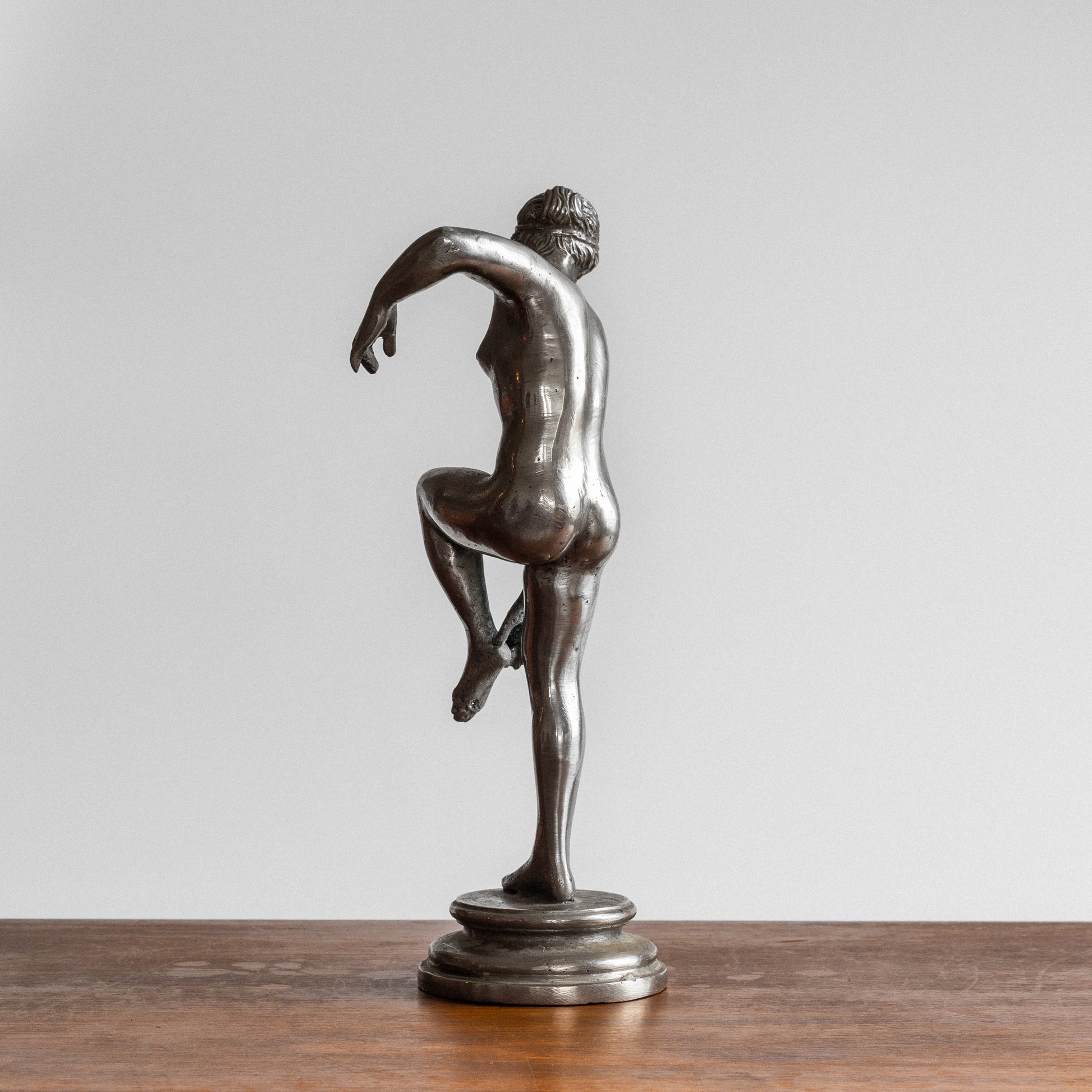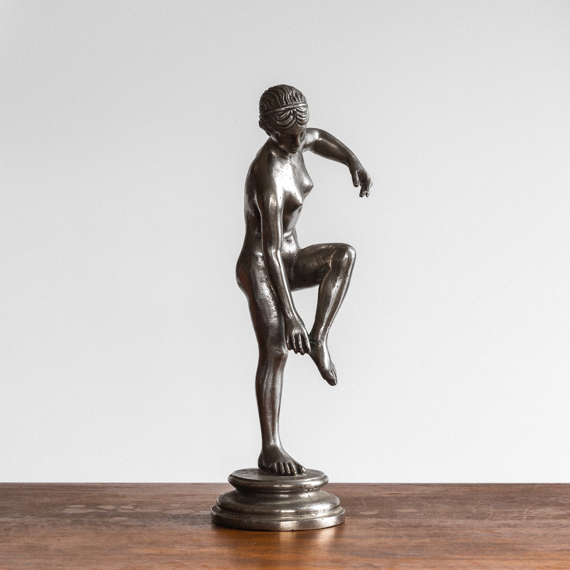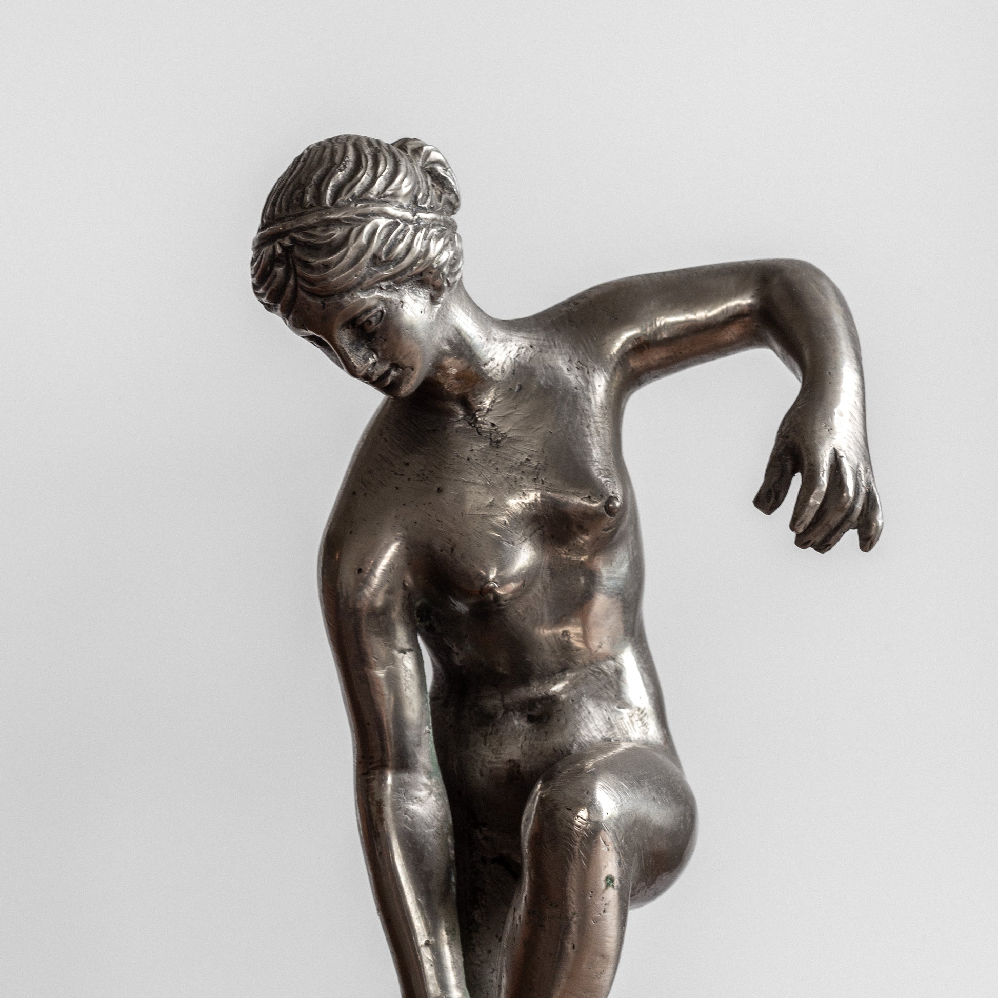 This elegant Swedish sculpture from the 1930s is crafted from polished pewter, giving it a beautiful silvery metallic glow. Its intricate details and high-end craftsmanship reflect the influences of classical art, particularly ancient Greco-Roman sculptures that often depict goddesses and athletes in similar poses.