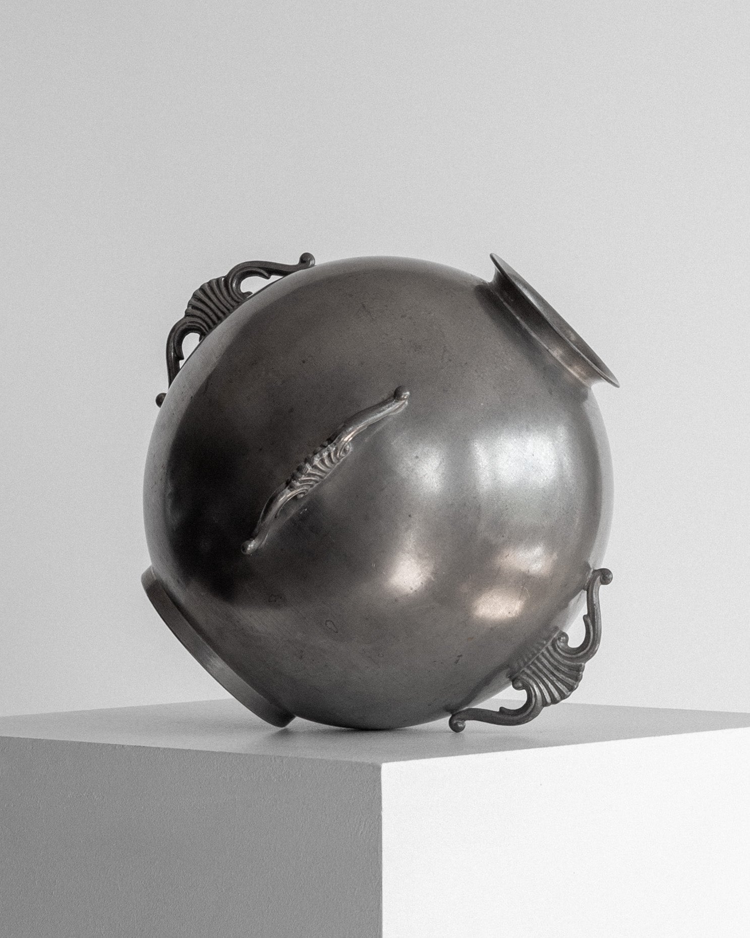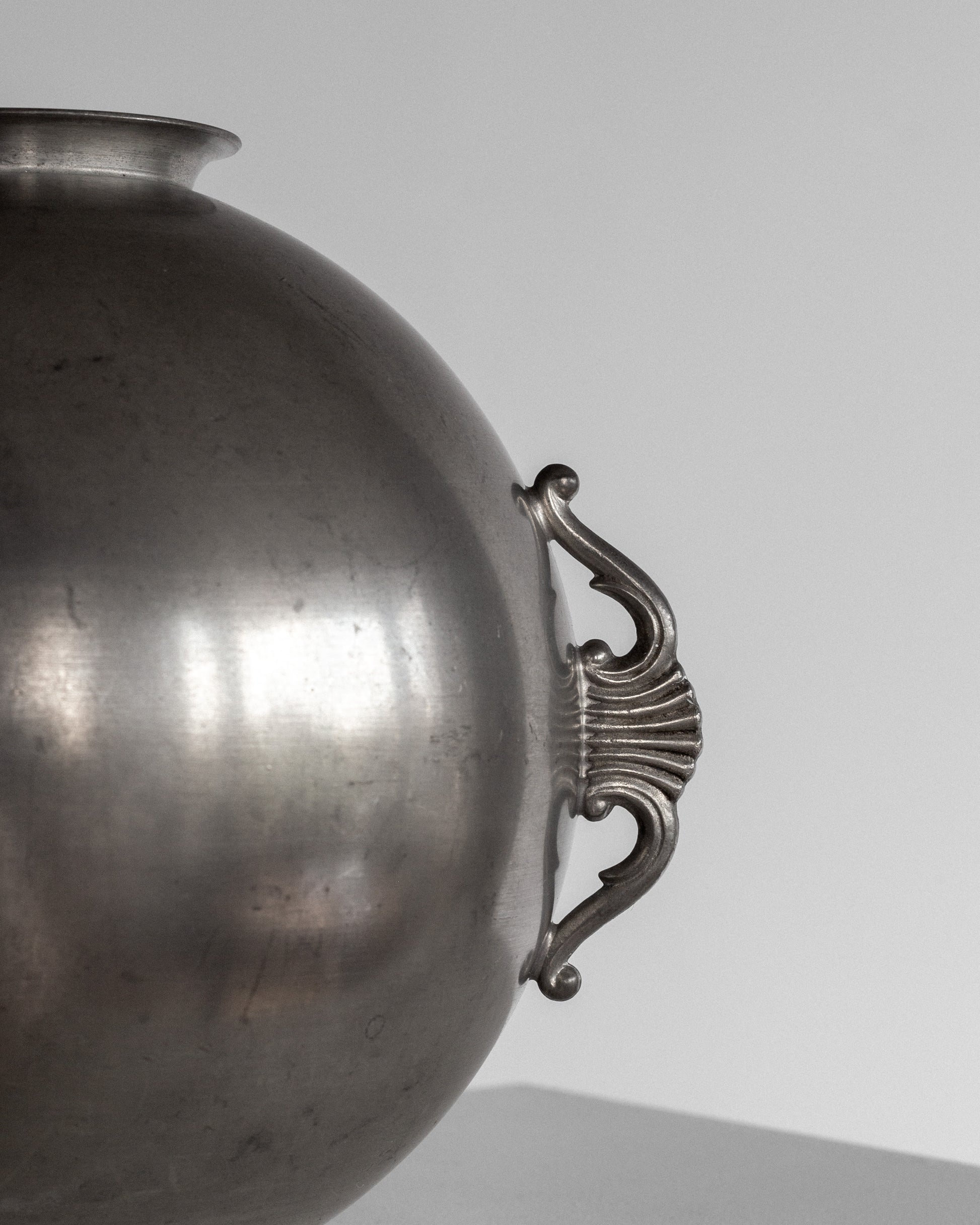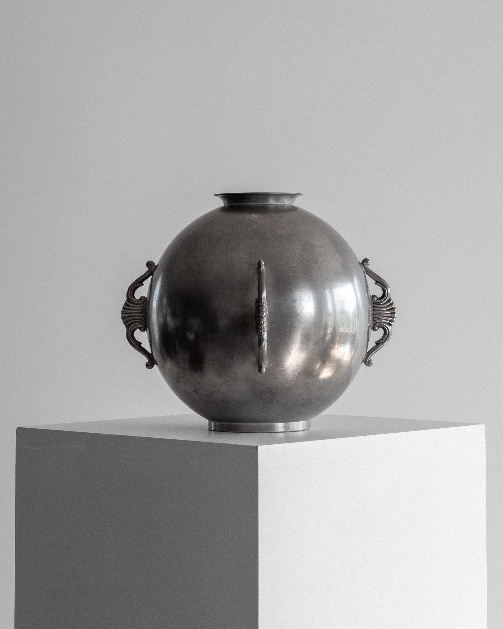 Elegant pewter vase by the Stockholm firm C.G. Hallberg, crafted in 1929 as confirmed by base markings. This sophisticated spherical form features ornate decorative handles characteristic of the Swedish Grace period. Very likely designed by Sylvia Stave, who began creating pieces for Hallberg while still a student at Konstfack and later on served as the company's artistic director from 1931 to 1939.