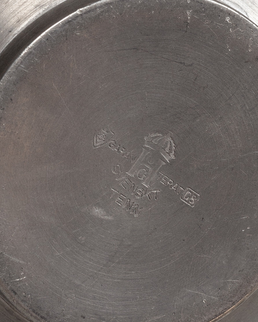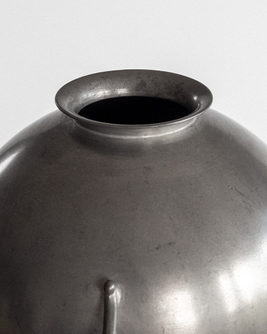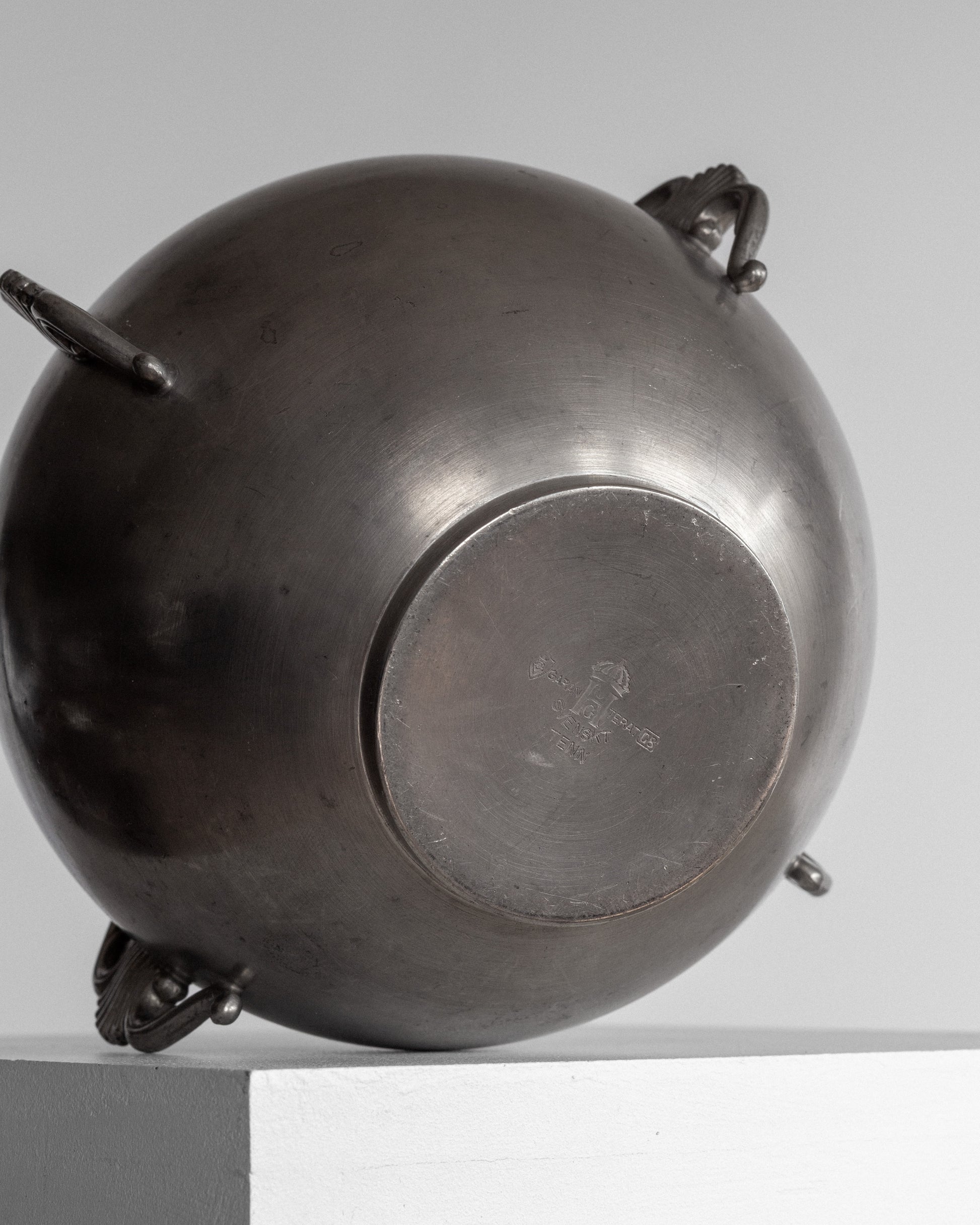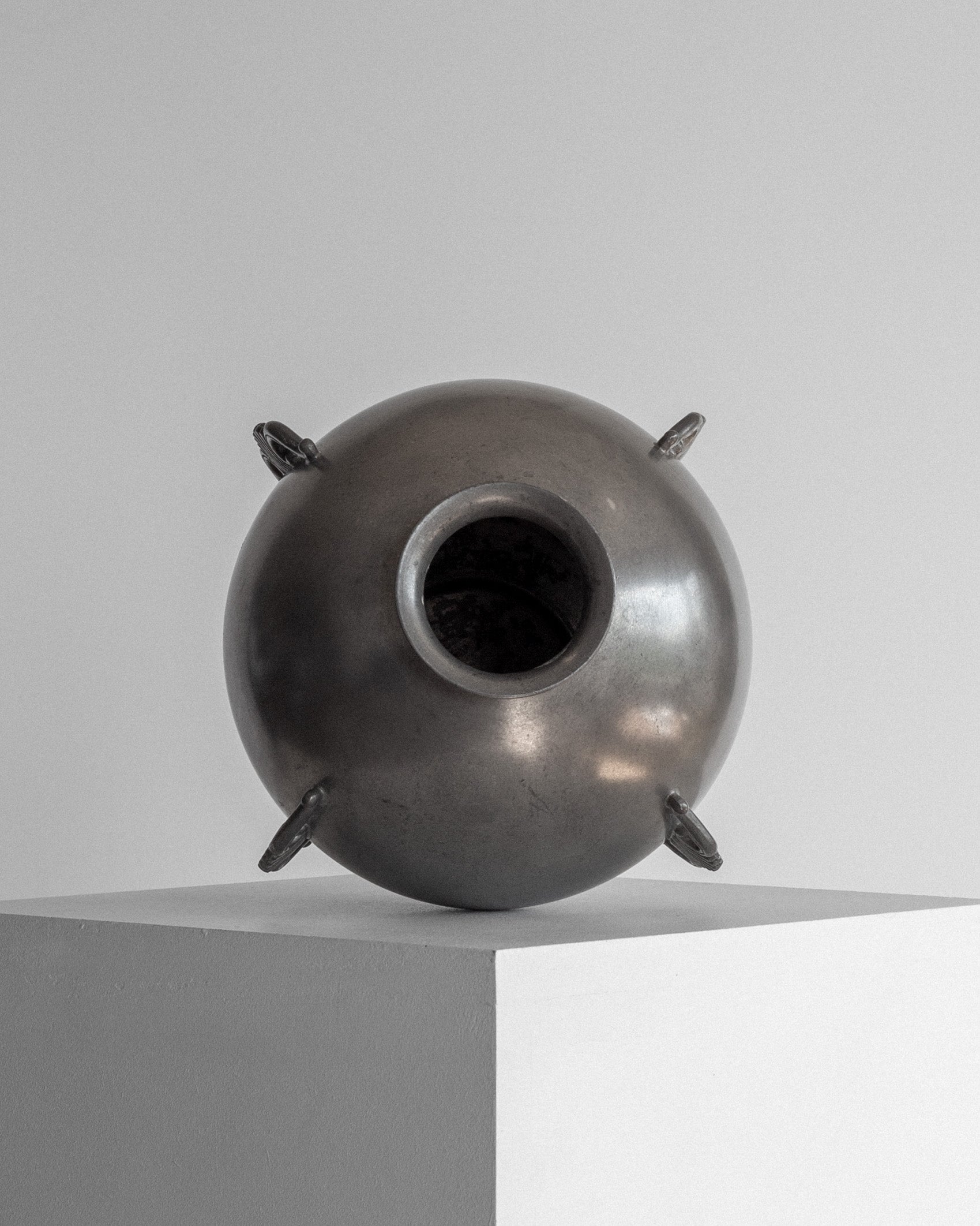 Elegant pewter vase by the Stockholm firm C.G. Hallberg, crafted in 1929 as confirmed by base markings. This sophisticated spherical form features ornate decorative handles characteristic of the Swedish Grace period. Very likely designed by Sylvia Stave, who began creating pieces for Hallberg while still a student at Konstfack and later on served as the company's artistic director from 1931 to 1939.
