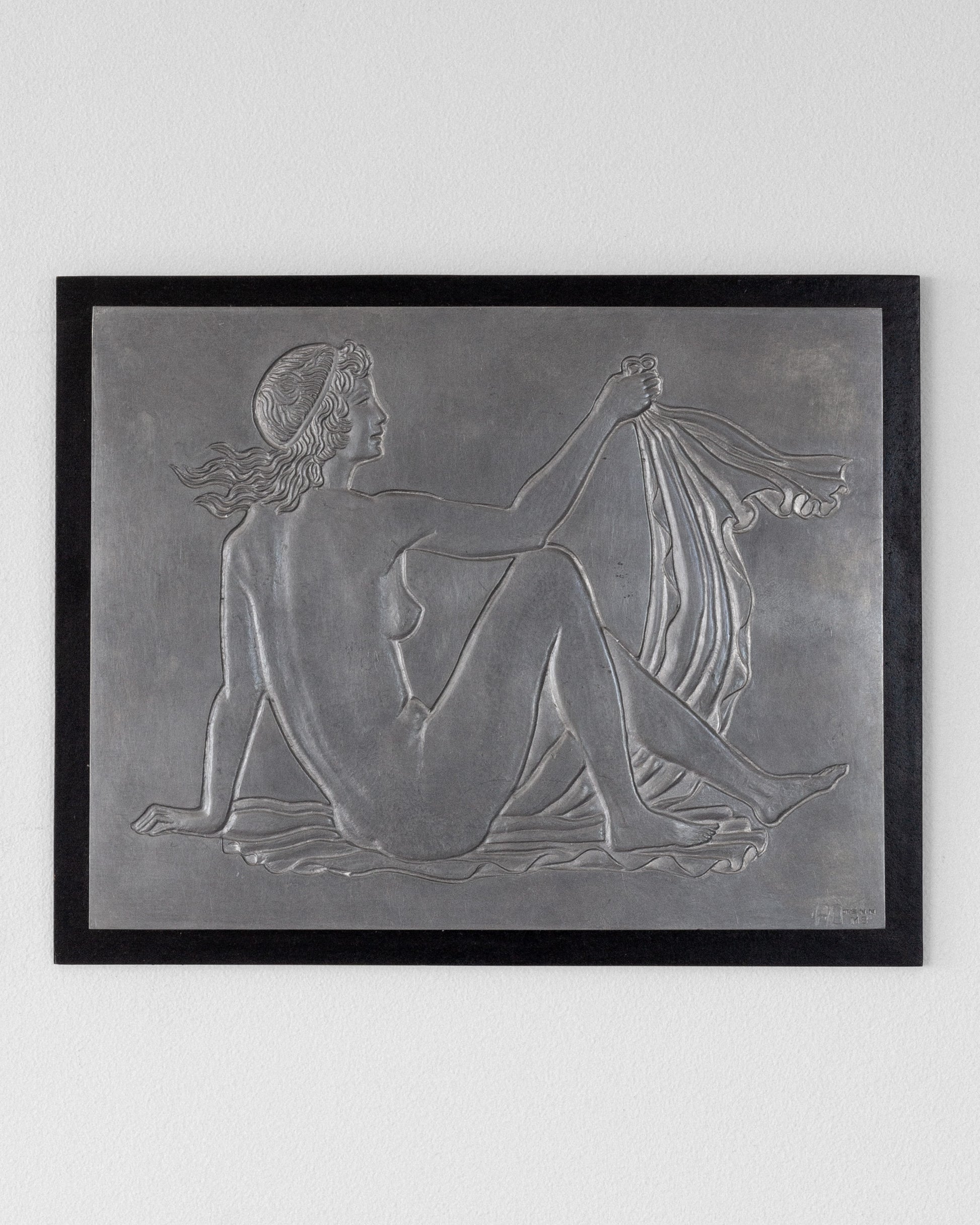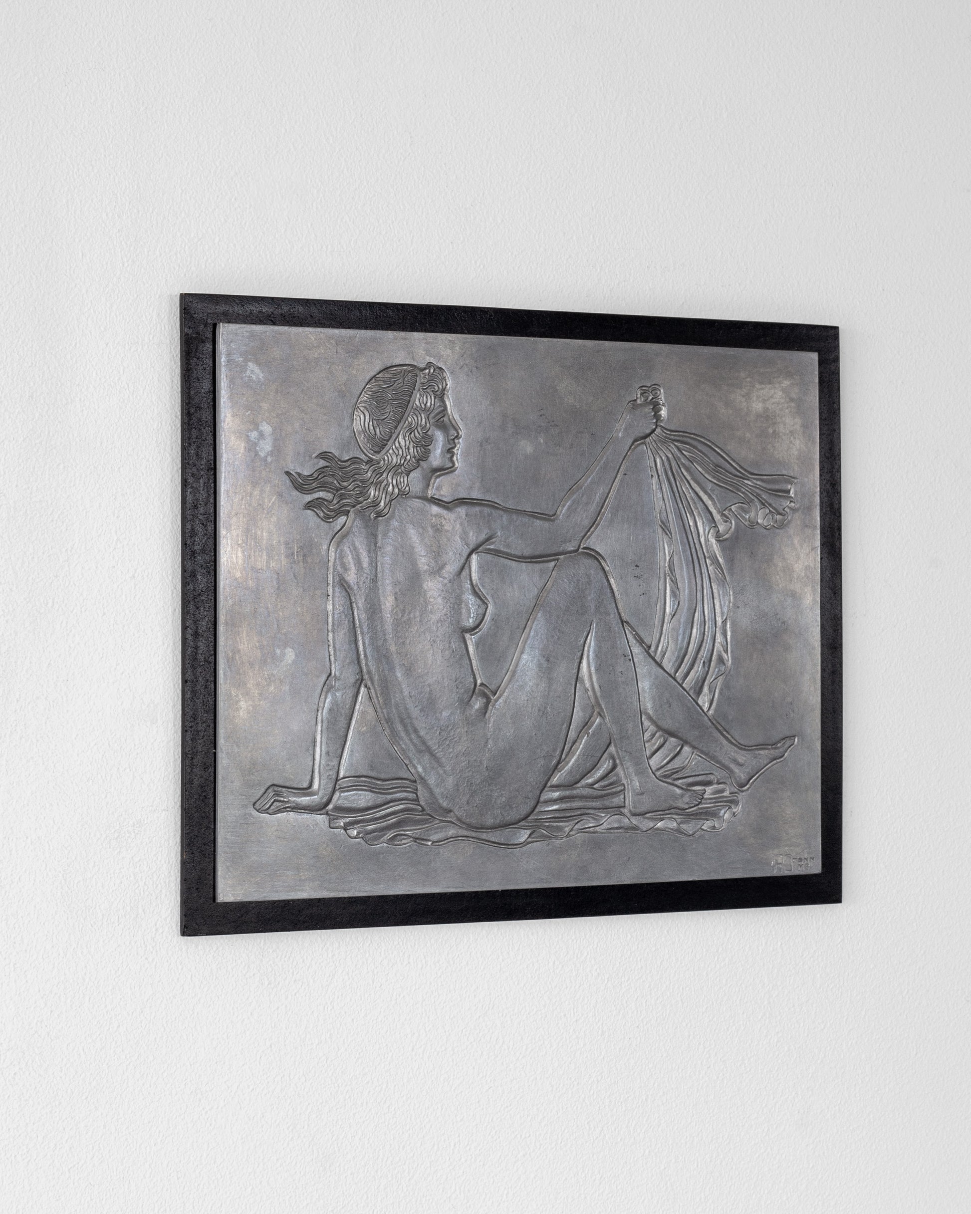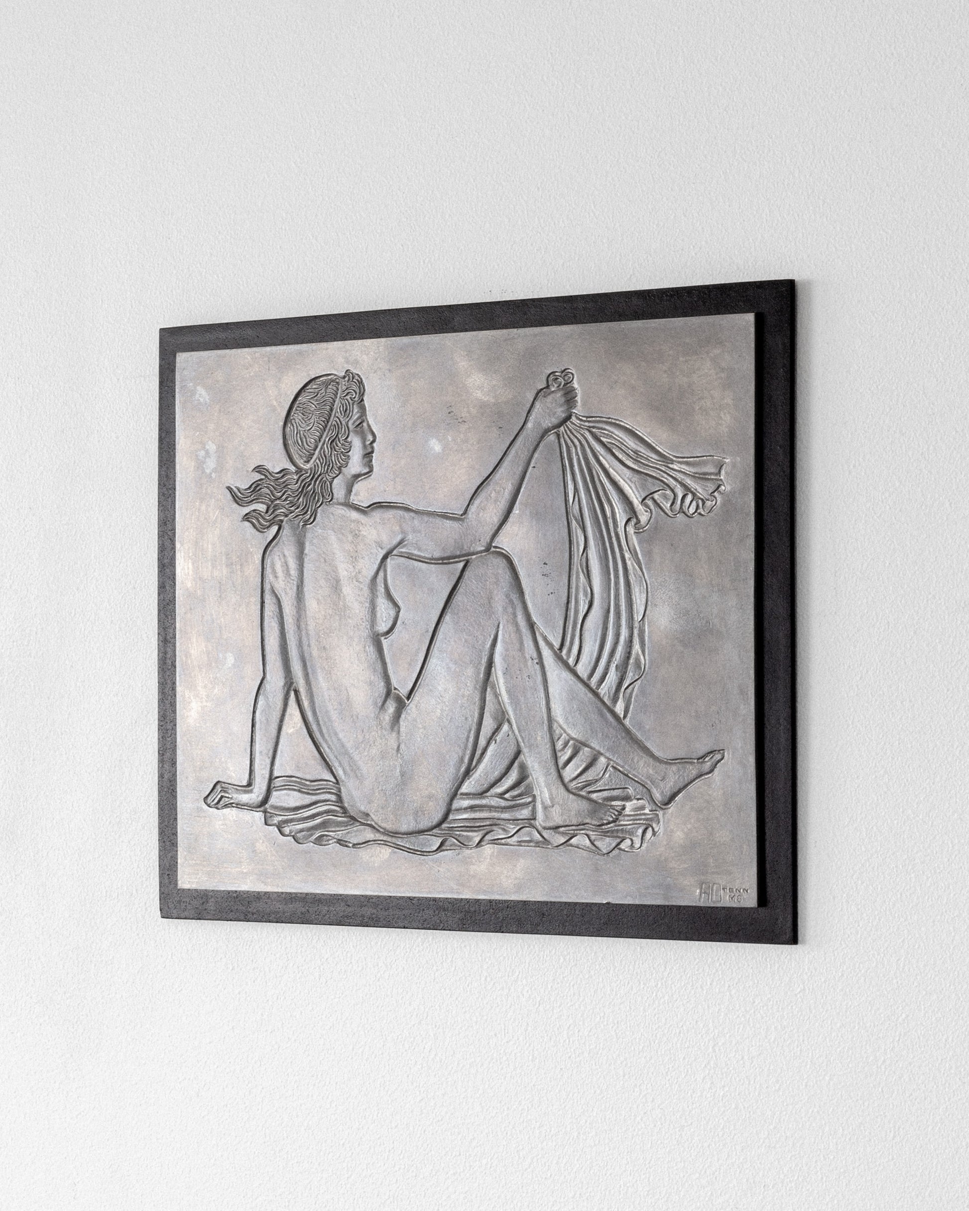 Beautifully detailed pewter relief depicting a classical female figure holding flowing drapery, created by Swedish artist and art historian Oscar Antonsson (1898-1960). This elegant piece showcases the neoclassical aesthetic characteristic of Swedish decorative arts from the late 1930s.