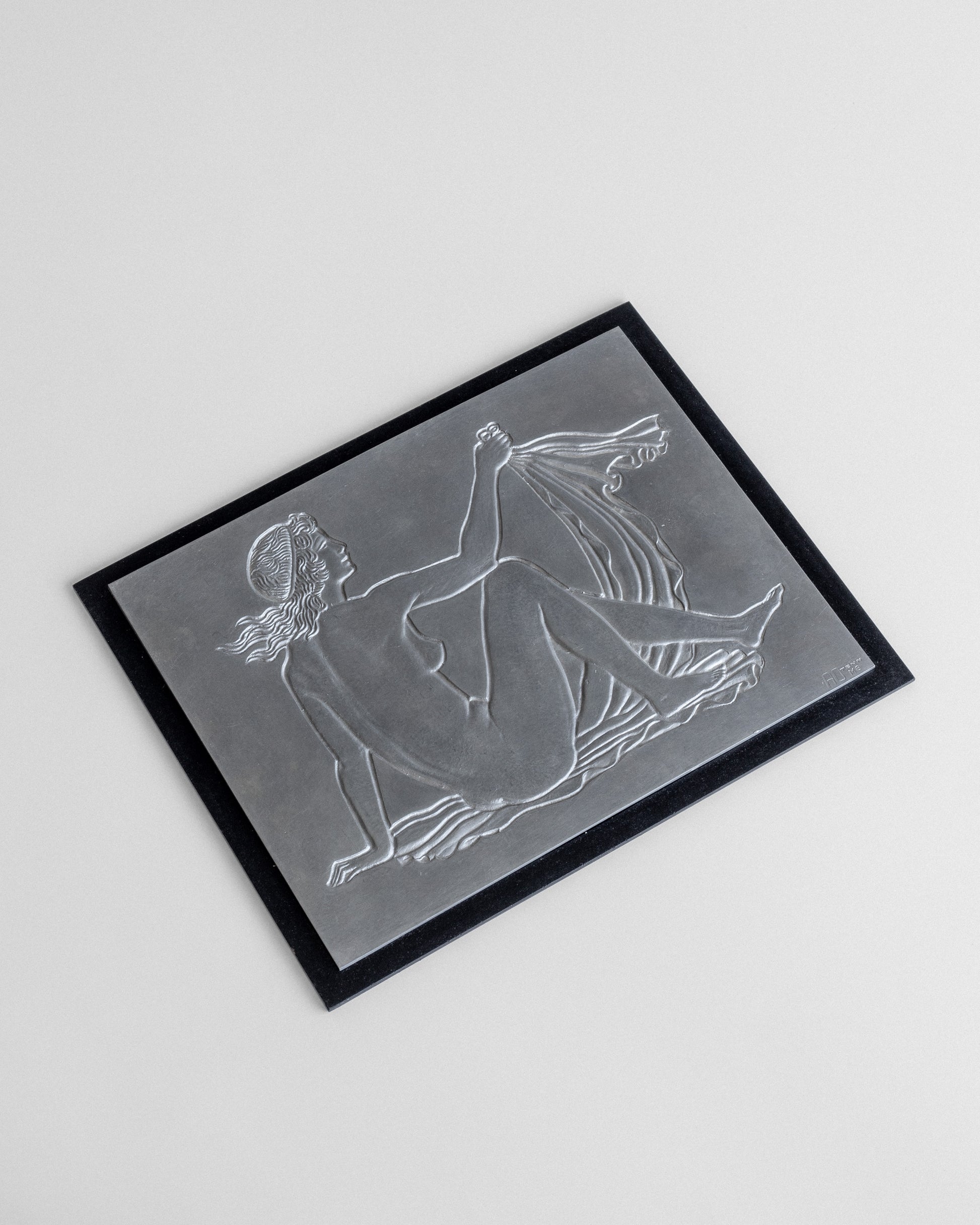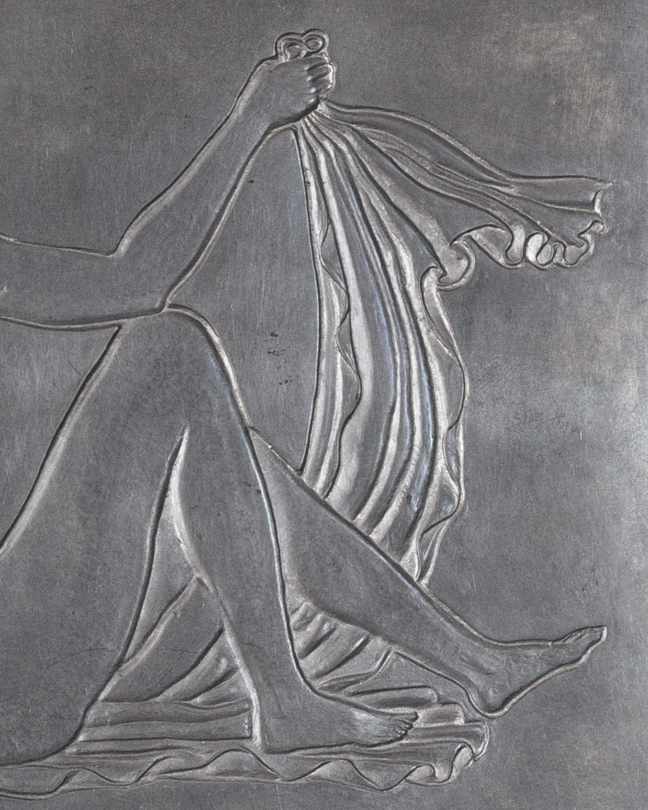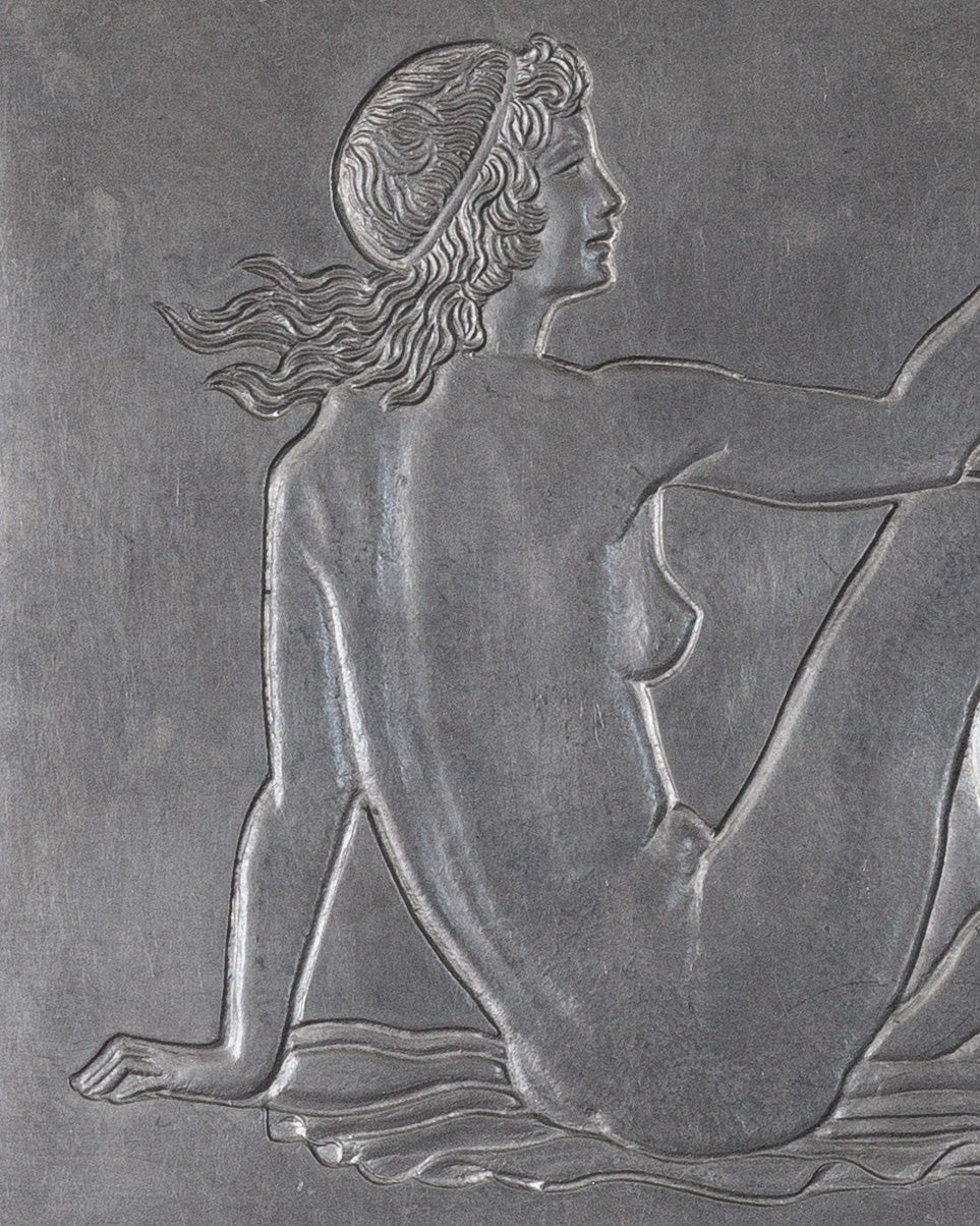 Beautifully detailed pewter relief depicting a classical female figure holding flowing drapery, created by Swedish artist and art historian Oscar Antonsson (1898-1960). This elegant piece showcases the neoclassical aesthetic characteristic of Swedish decorative arts from the late 1930s.