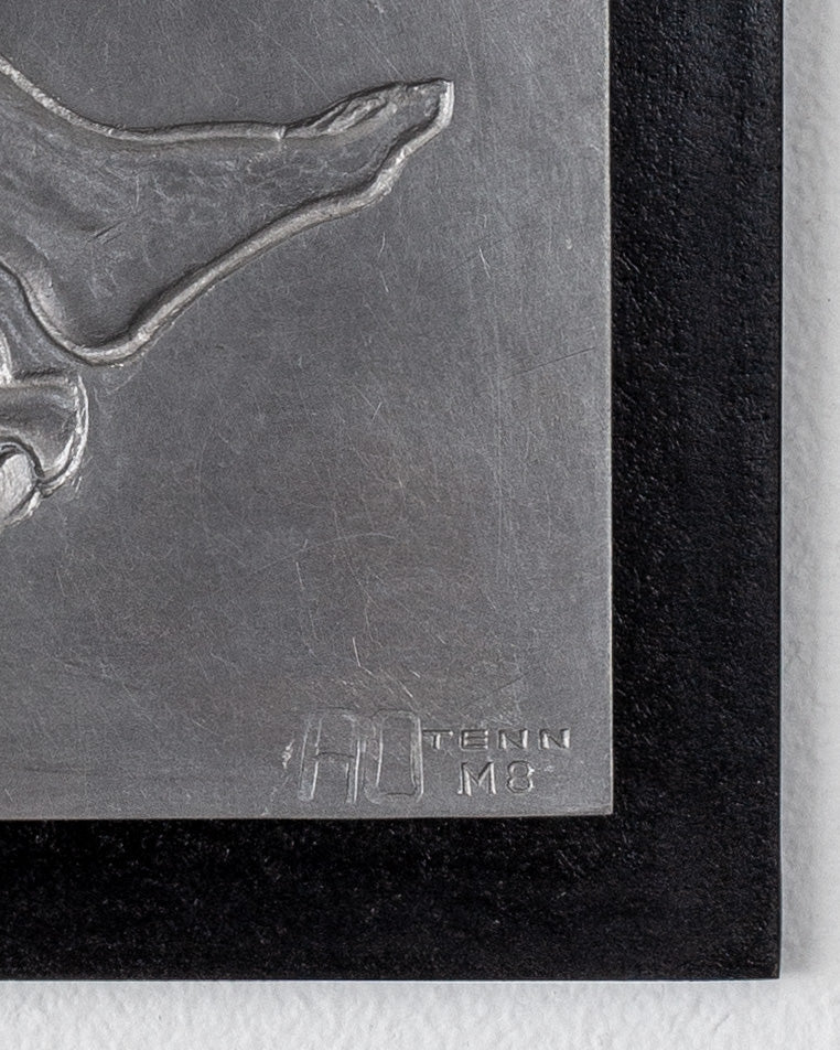 The relief bears artist's monogram "OA" and pewter hallmark "M8" indicating 1938. Mounted on black backing board with hanging wire.