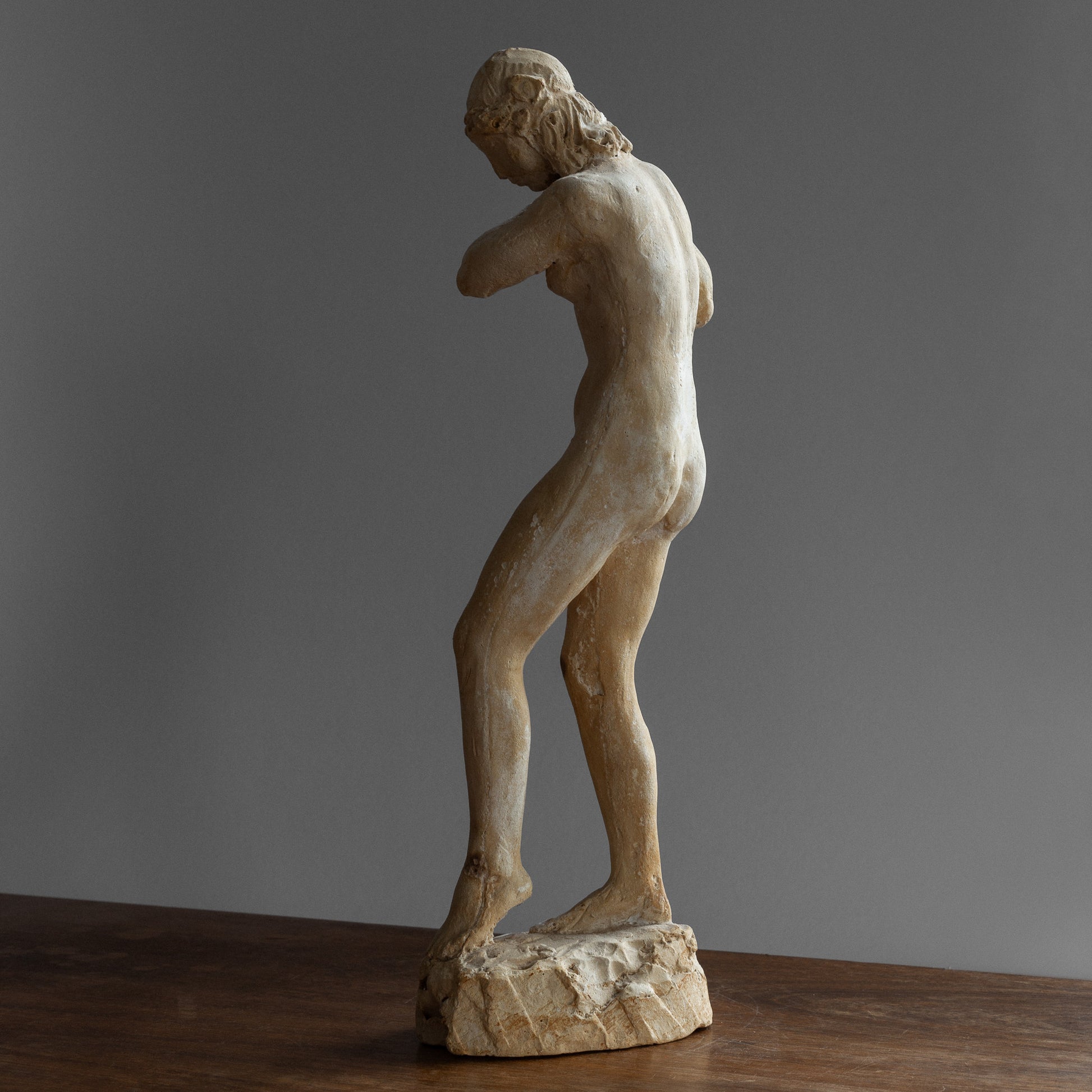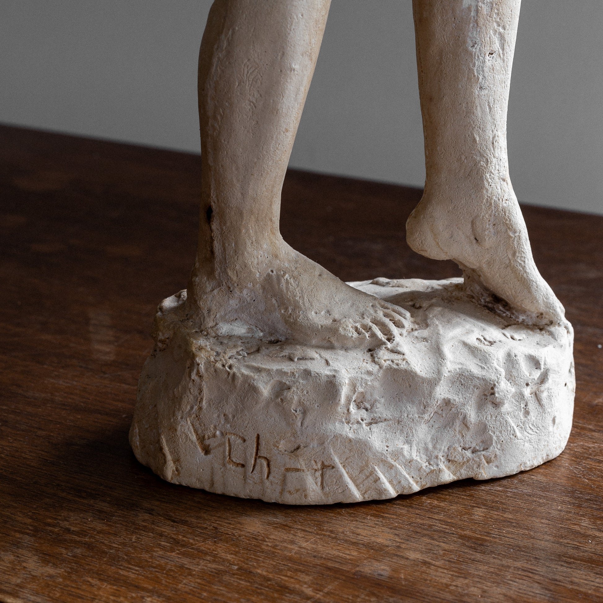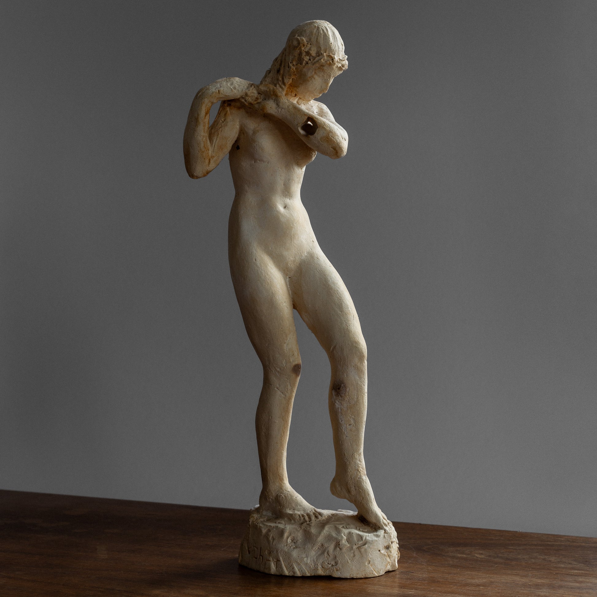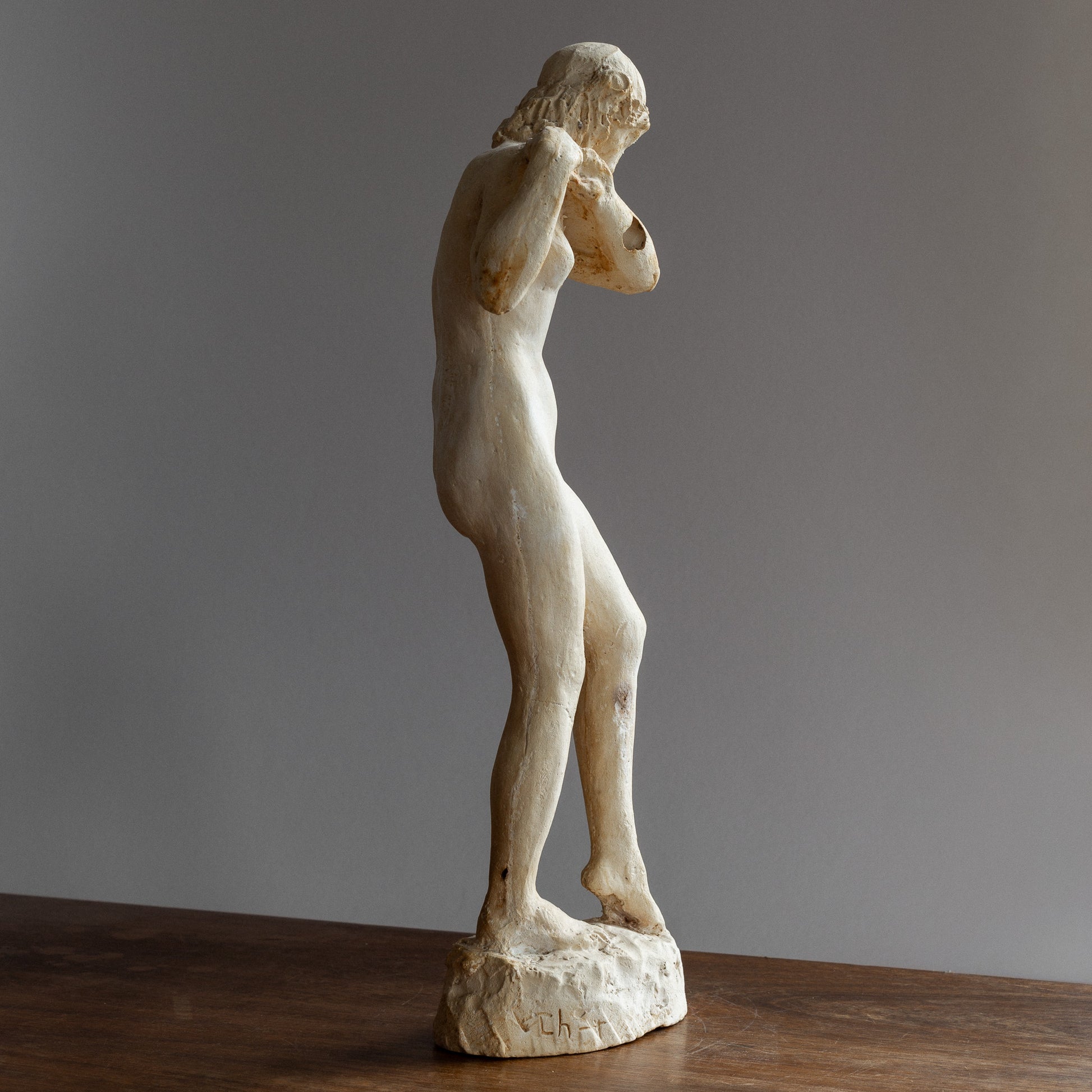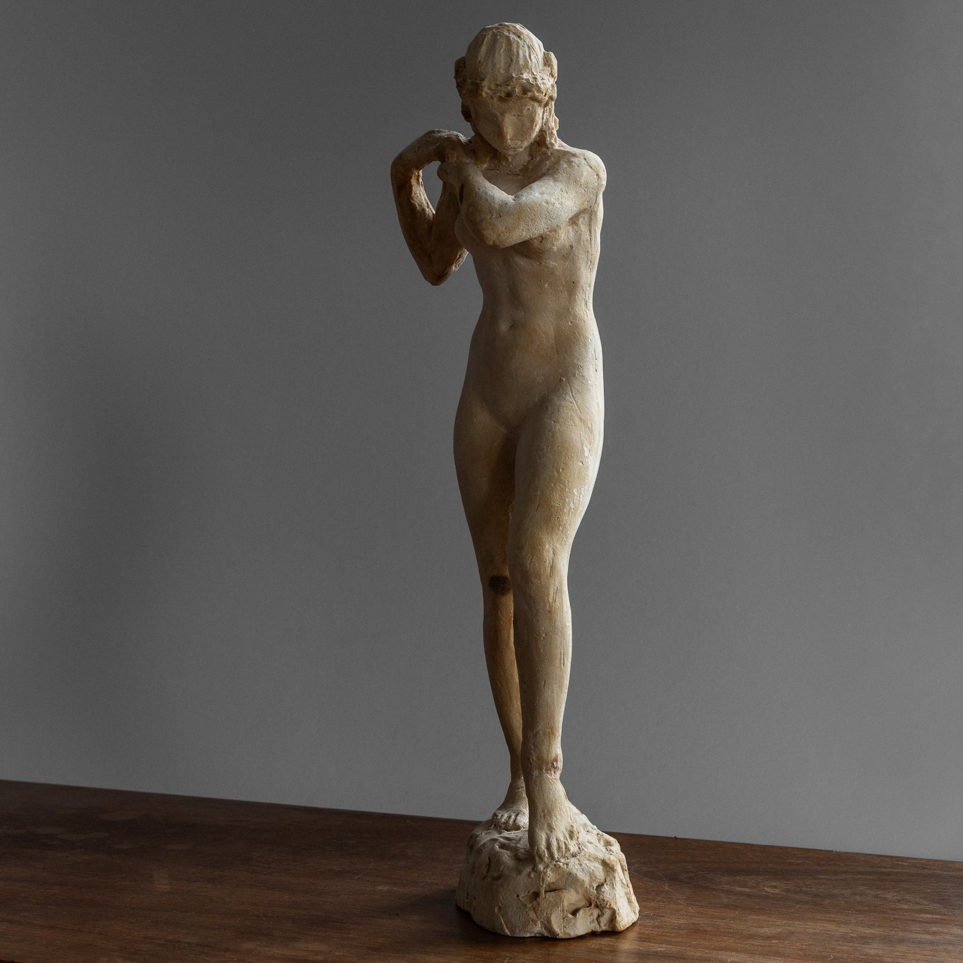 This captivating plaster sculpture, depicting a standing woman, was crafted in the 1920s-30s and is likely of Swedish origin. Although the work is signed, the artist remains unidentified.