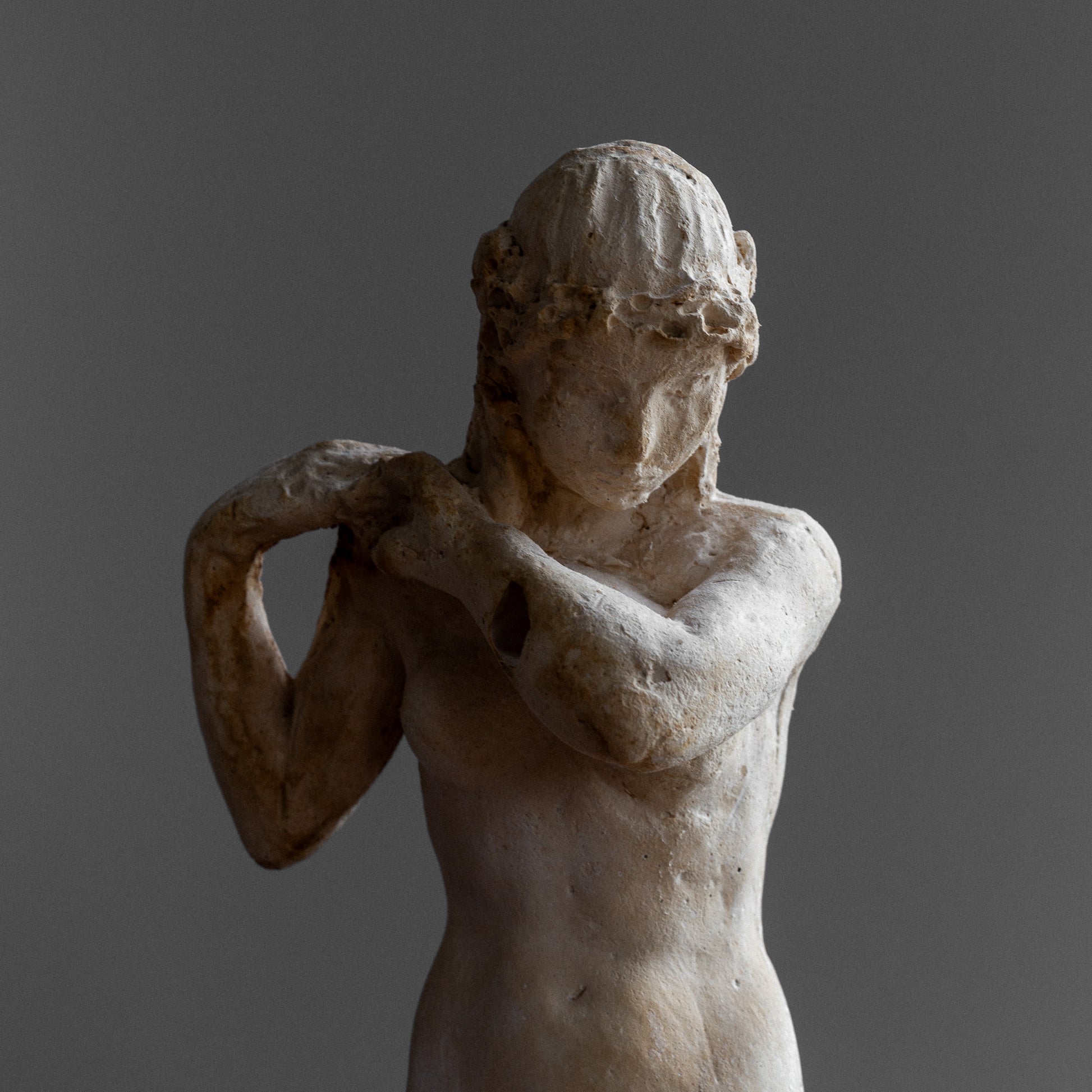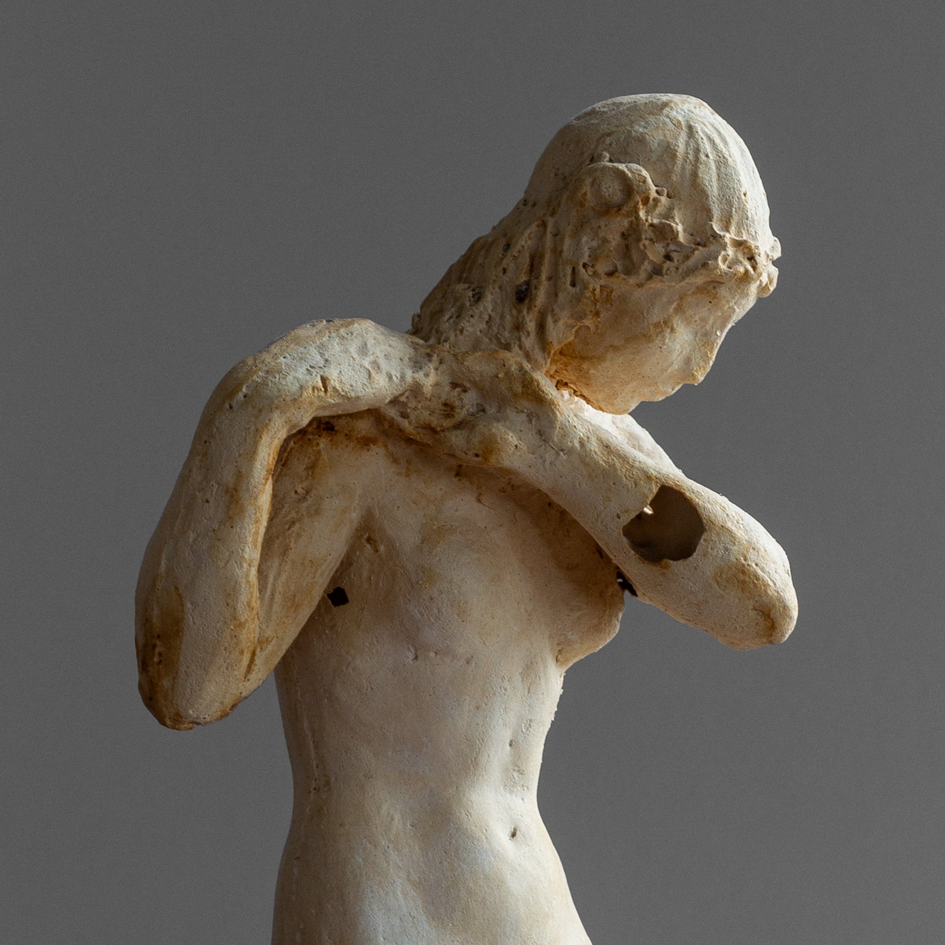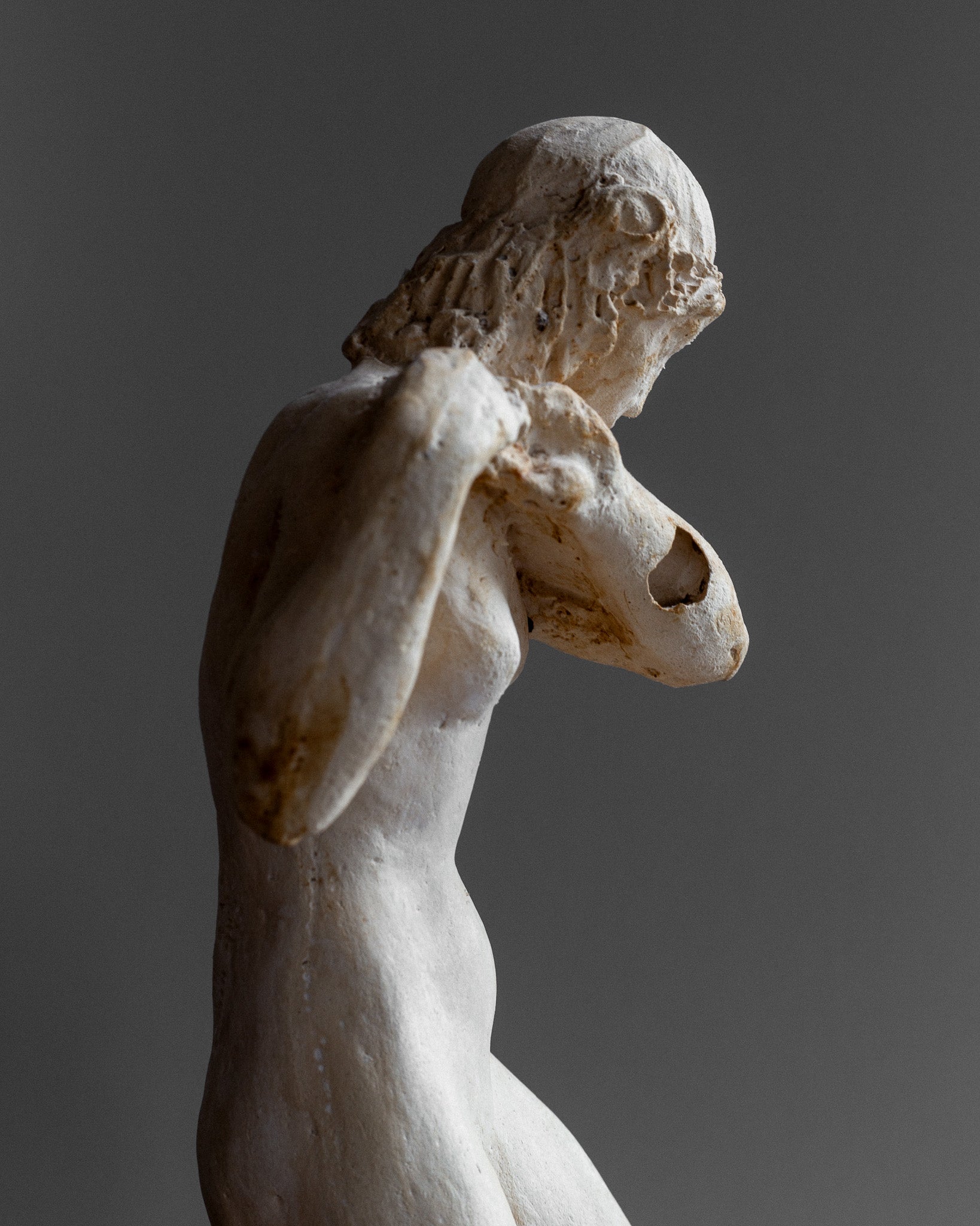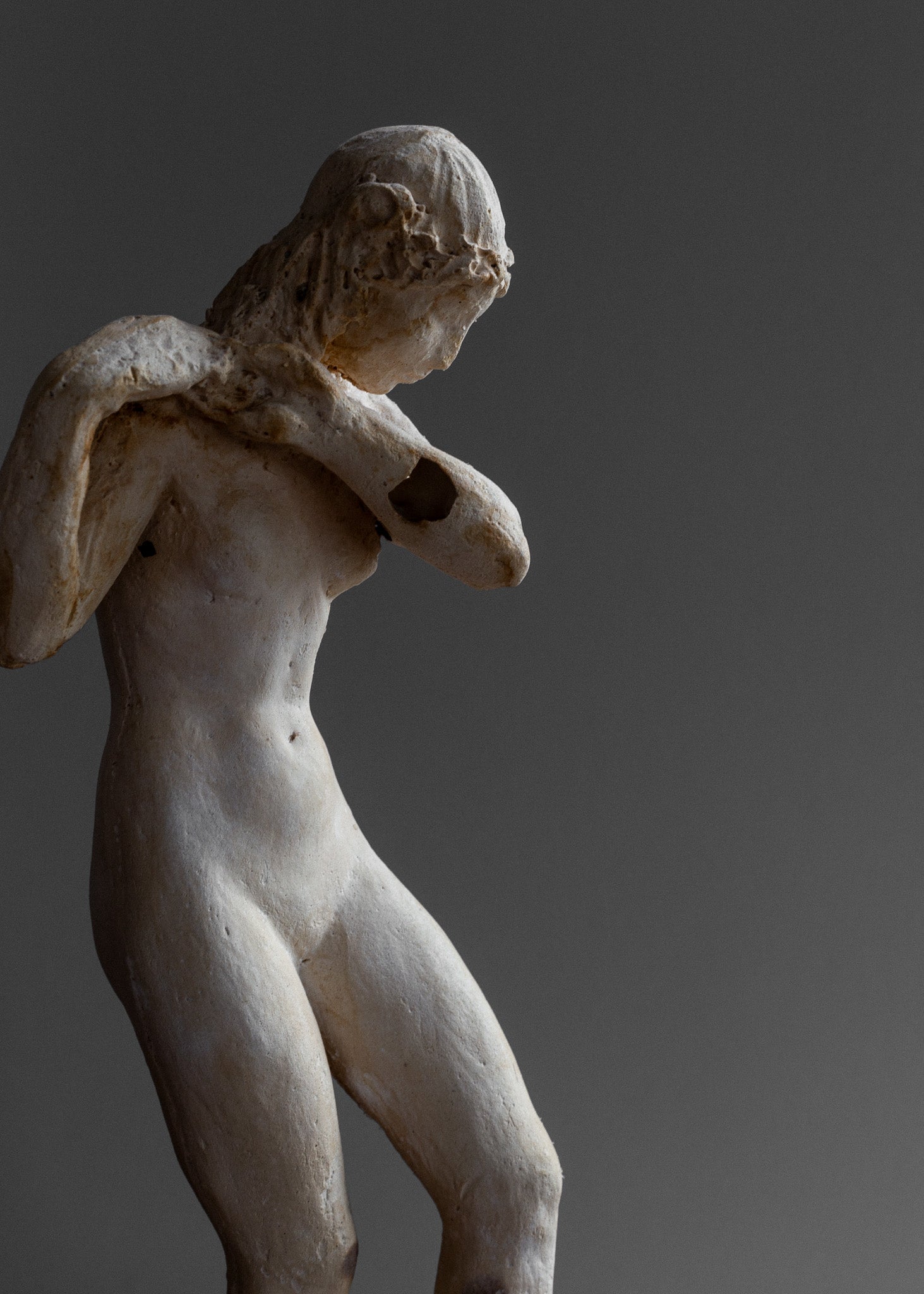 The sculpture is highly decorative, showing signs of wear that add to its character. The matte white plaster has developed somewhat yellow patina over time. No restorations have been made.
