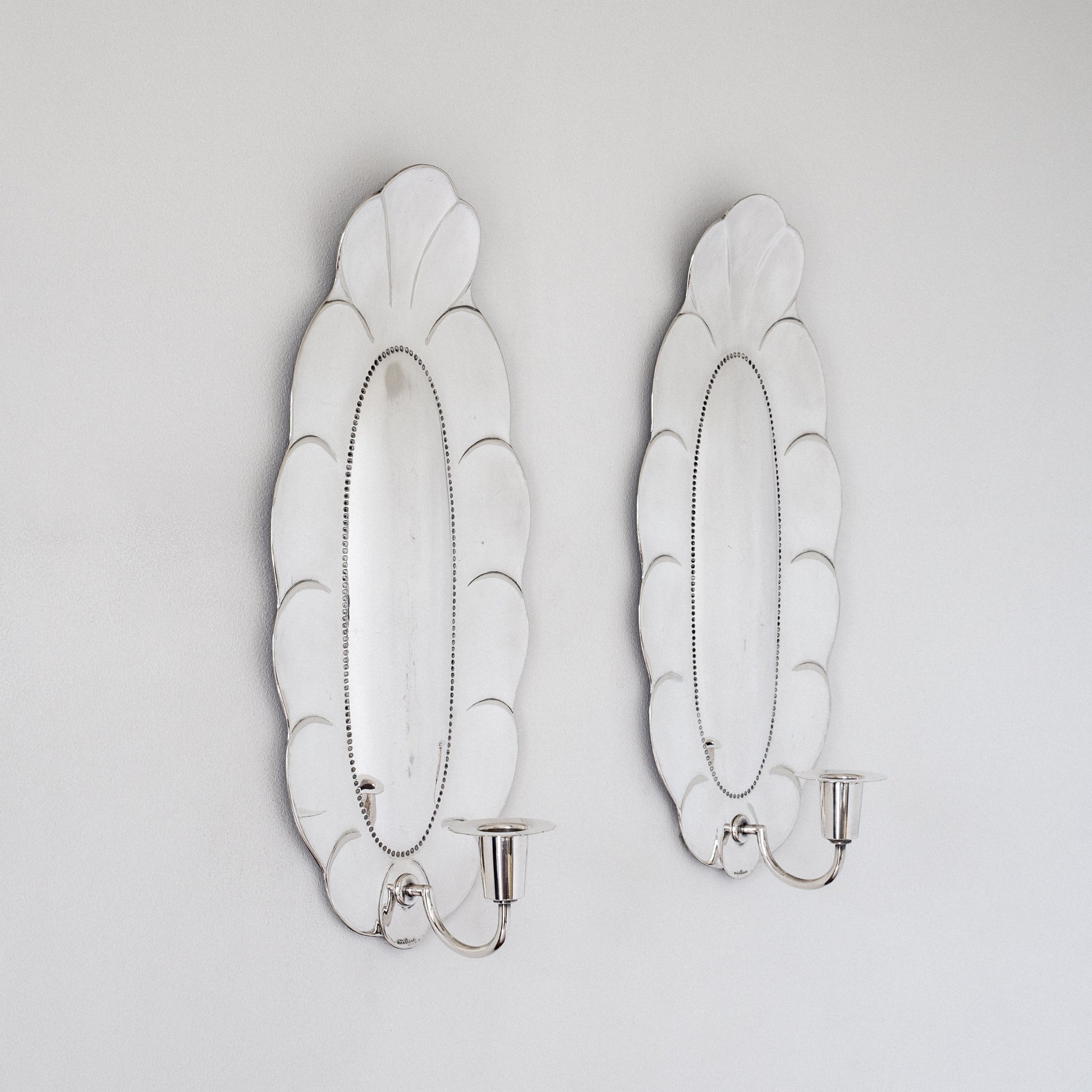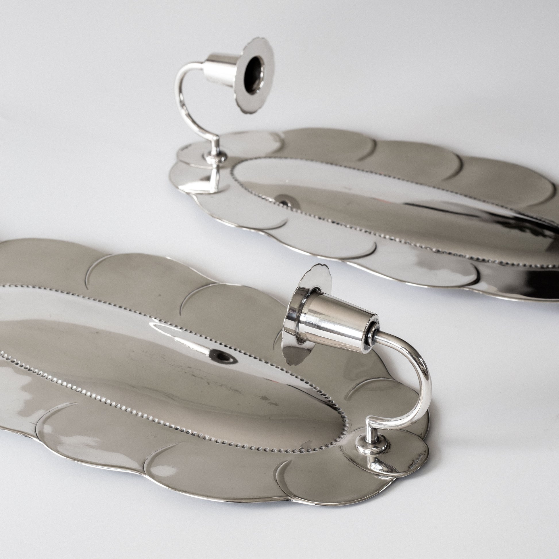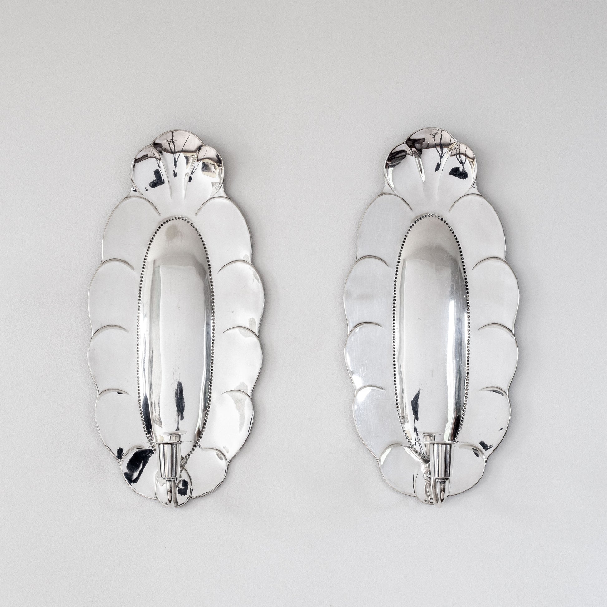 Elegant pair of scalloped wall sconces from the 1920s by Guldsmedsaktiebolaget (GAB). Crafted in electro-plated nickel silver, these sophisticated pieces feature a classical Art Deco shell motif design with beaded mirror details and curved candle arms.