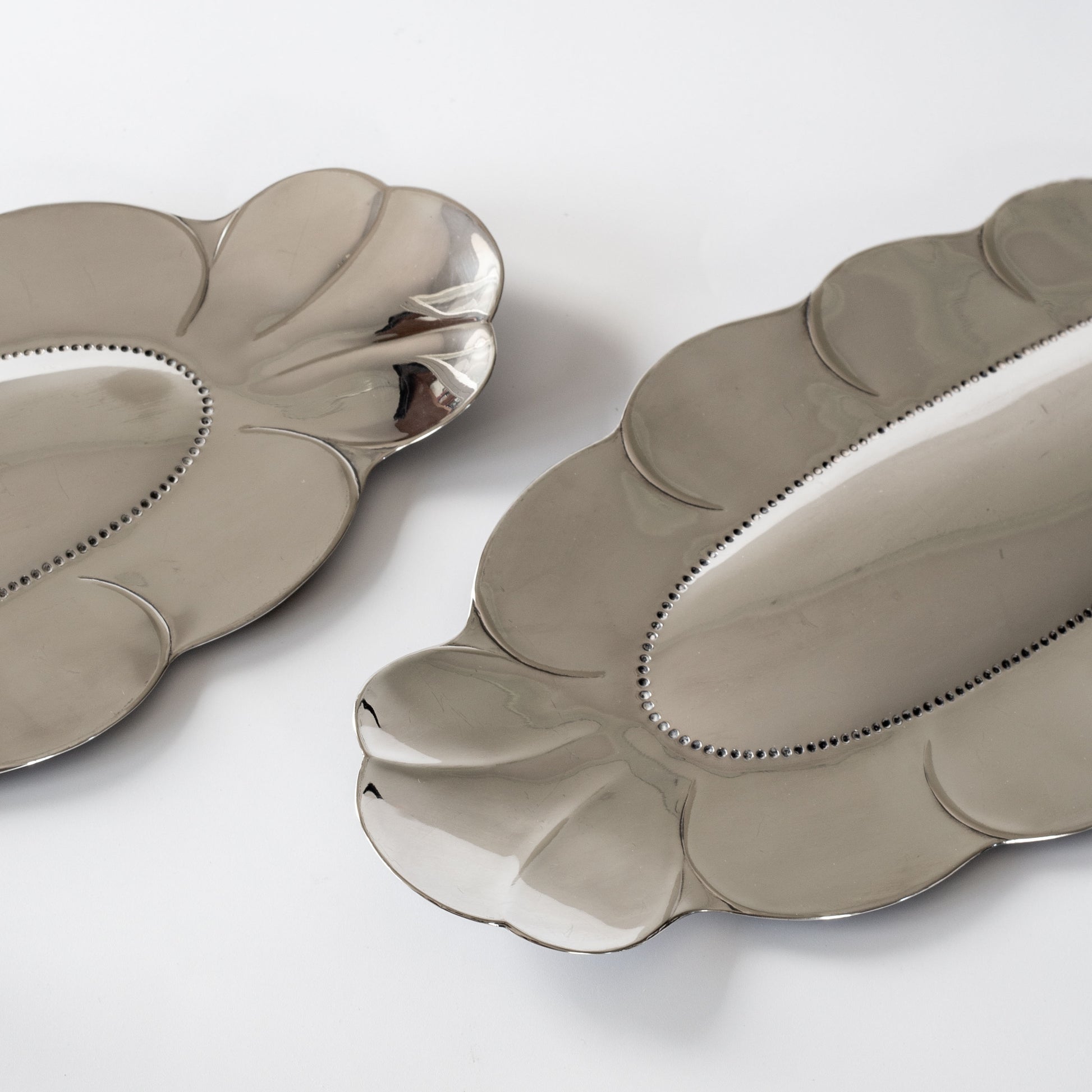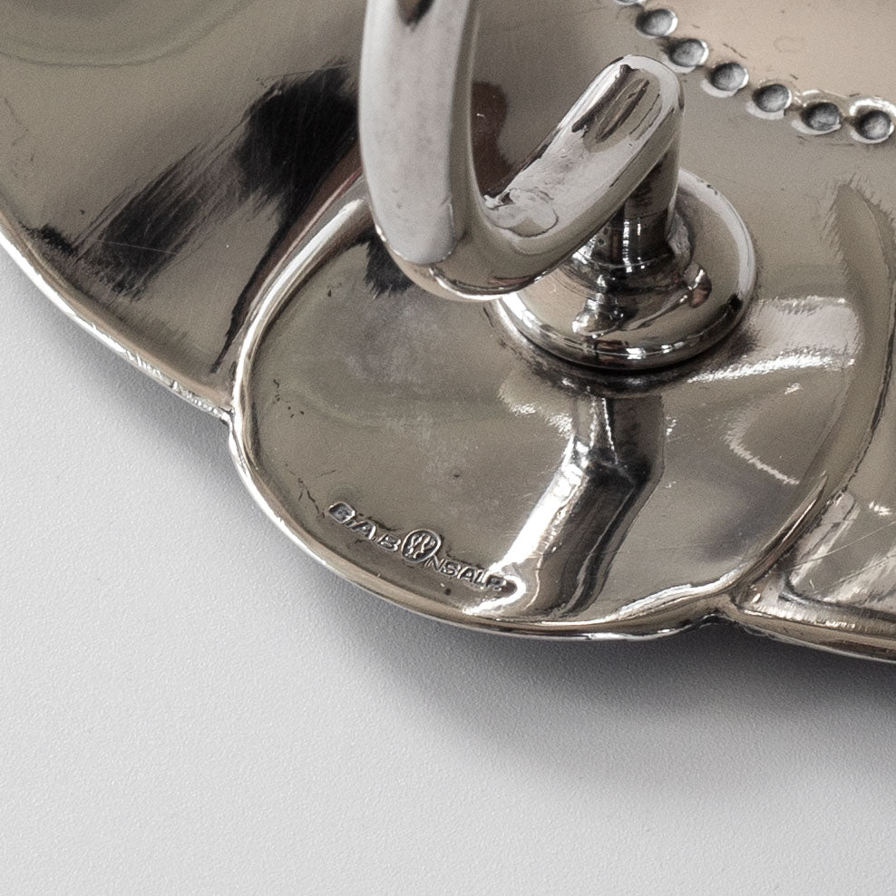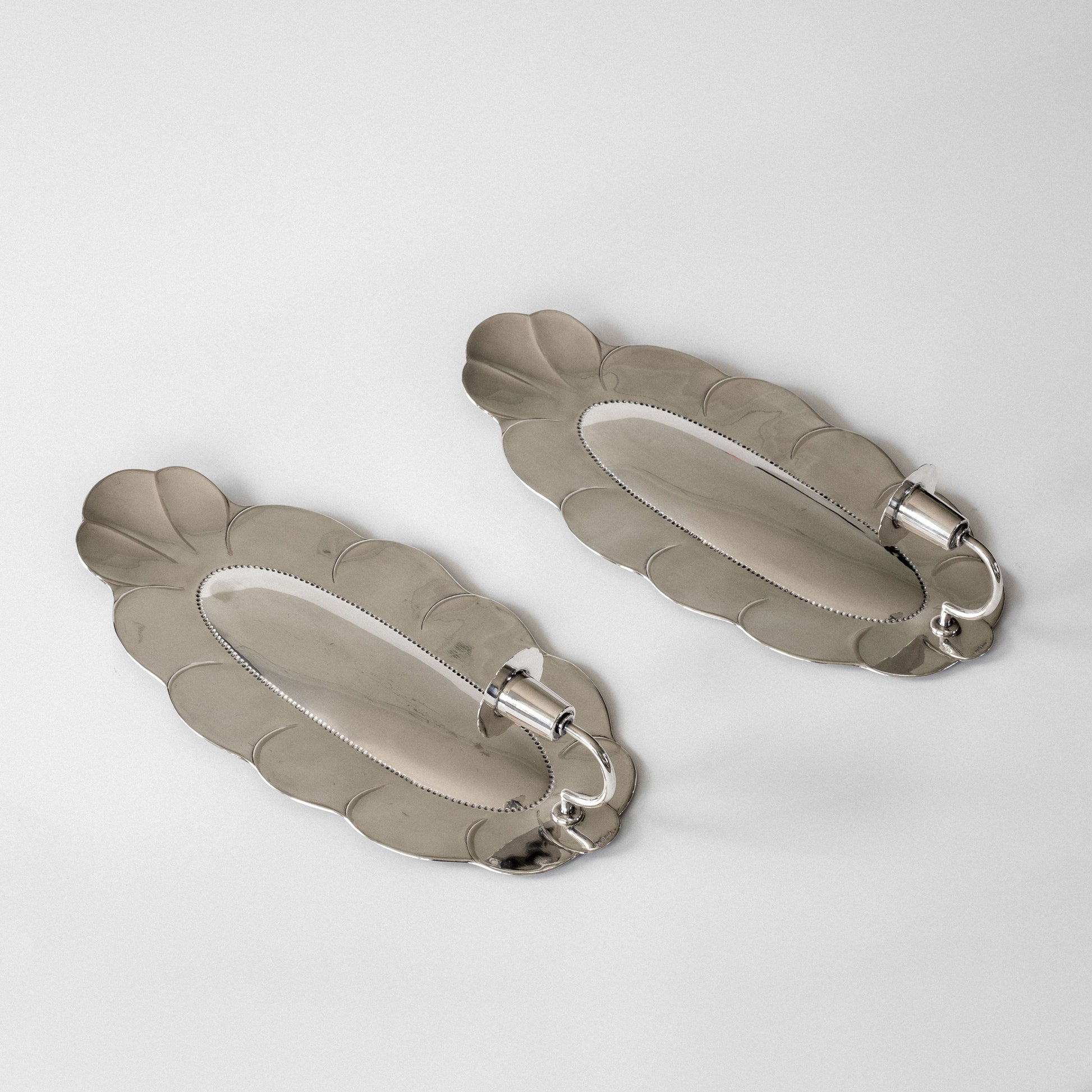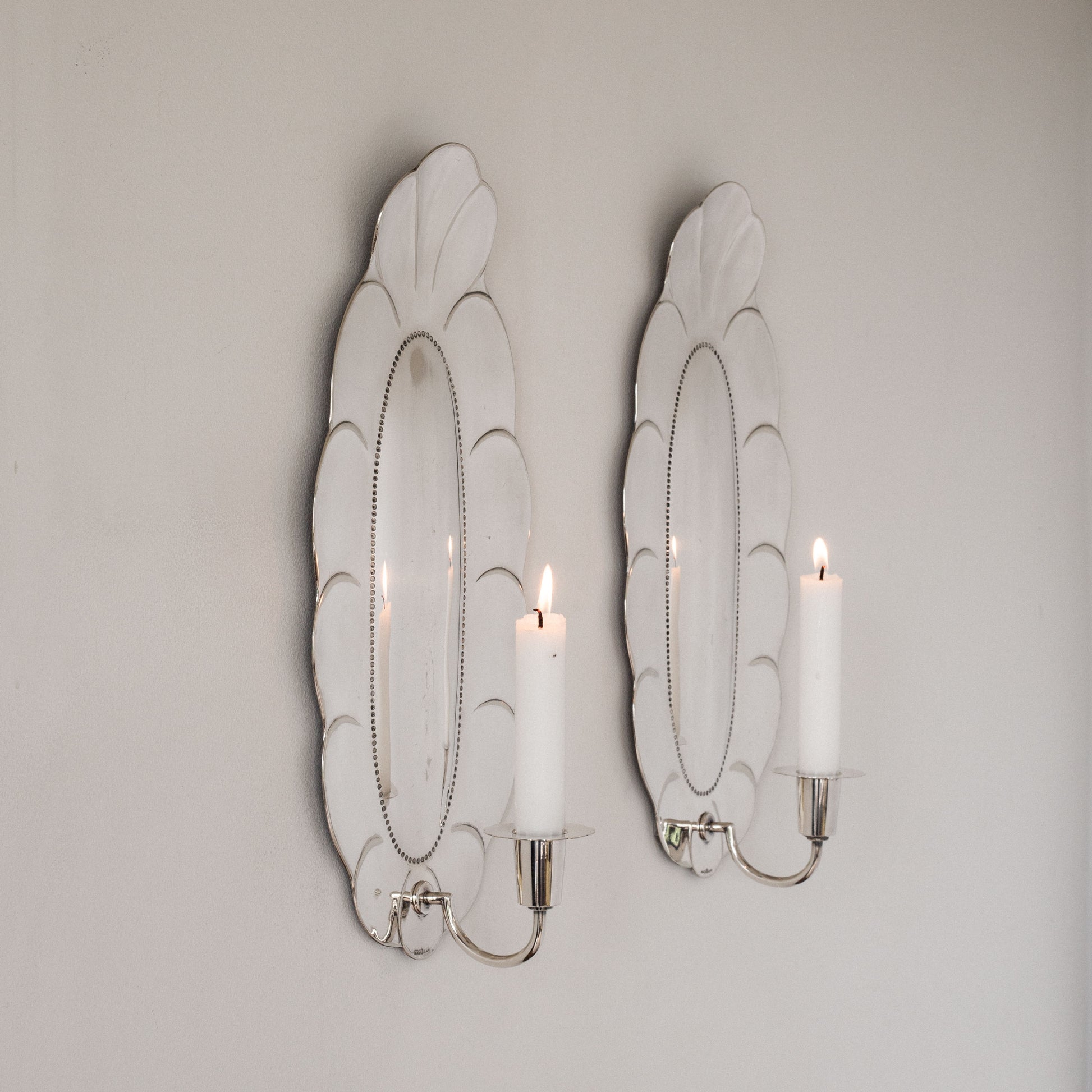Elegant pair of scalloped wall sconces from the 1920s by Guldsmedsaktiebolaget (GAB). Crafted in electro-plated nickel silver, these sophisticated pieces feature a classical Art Deco shell motif design with beaded mirror details and curved candle arms.