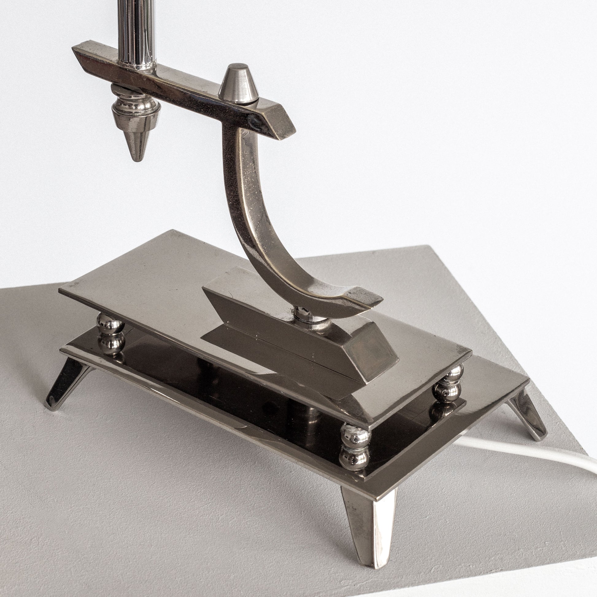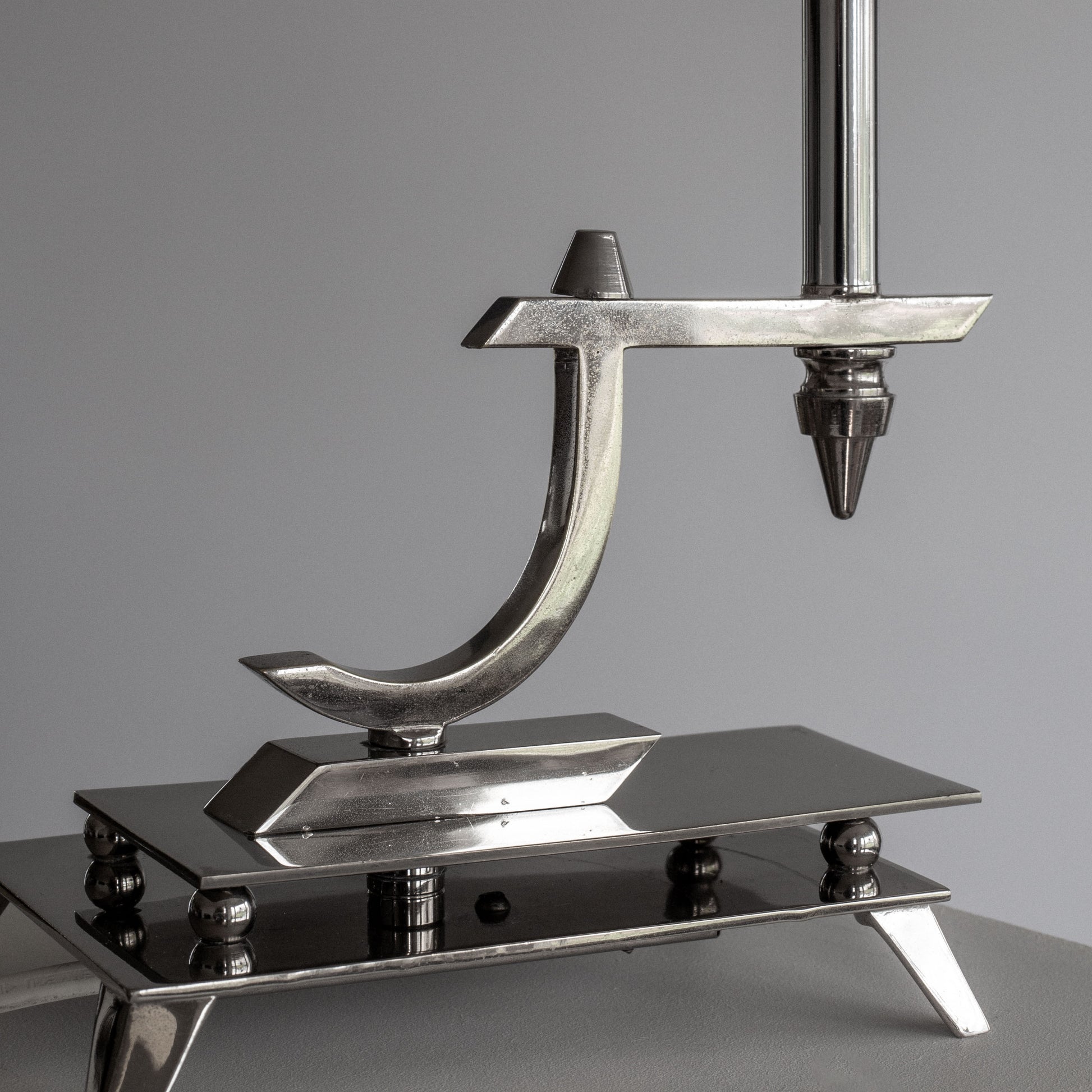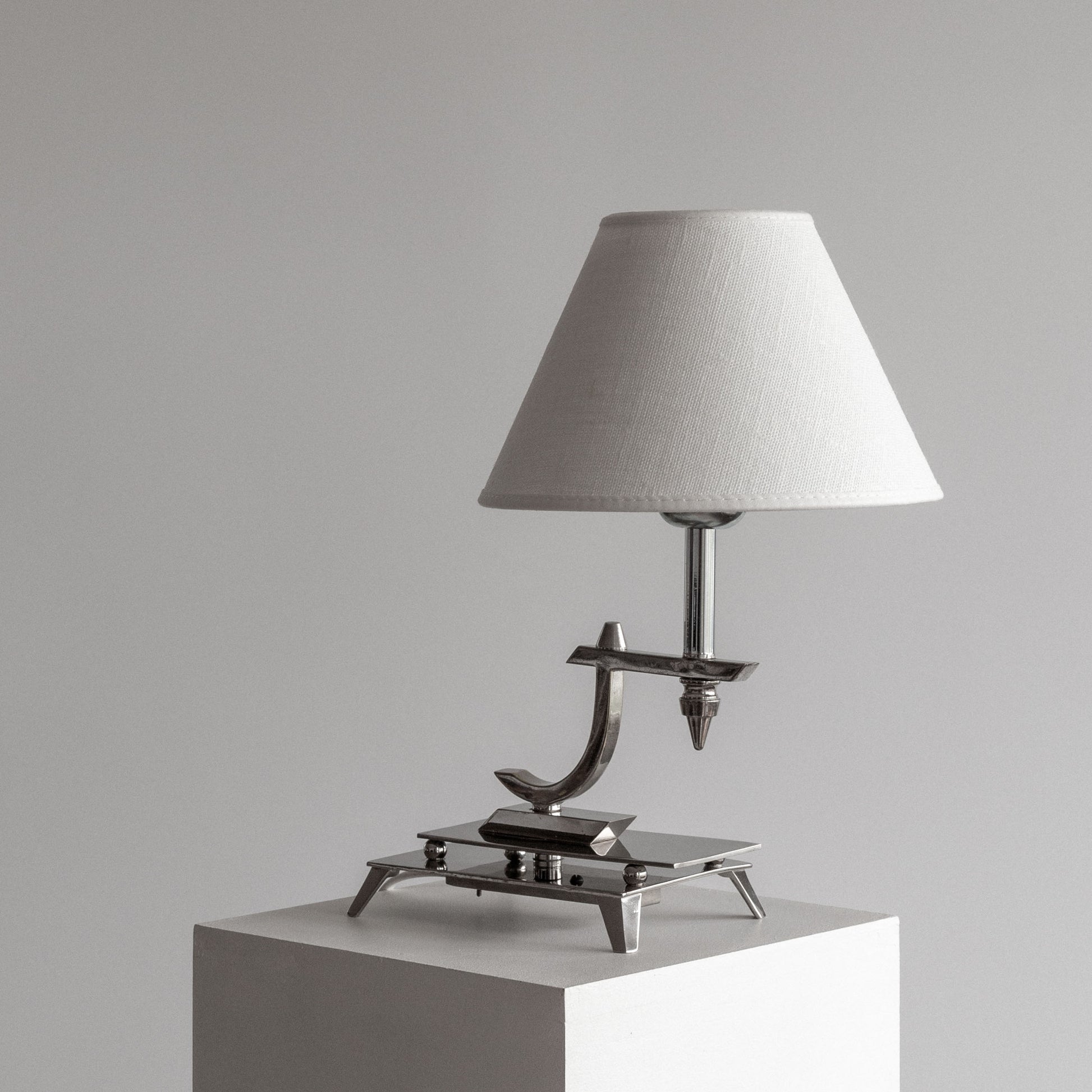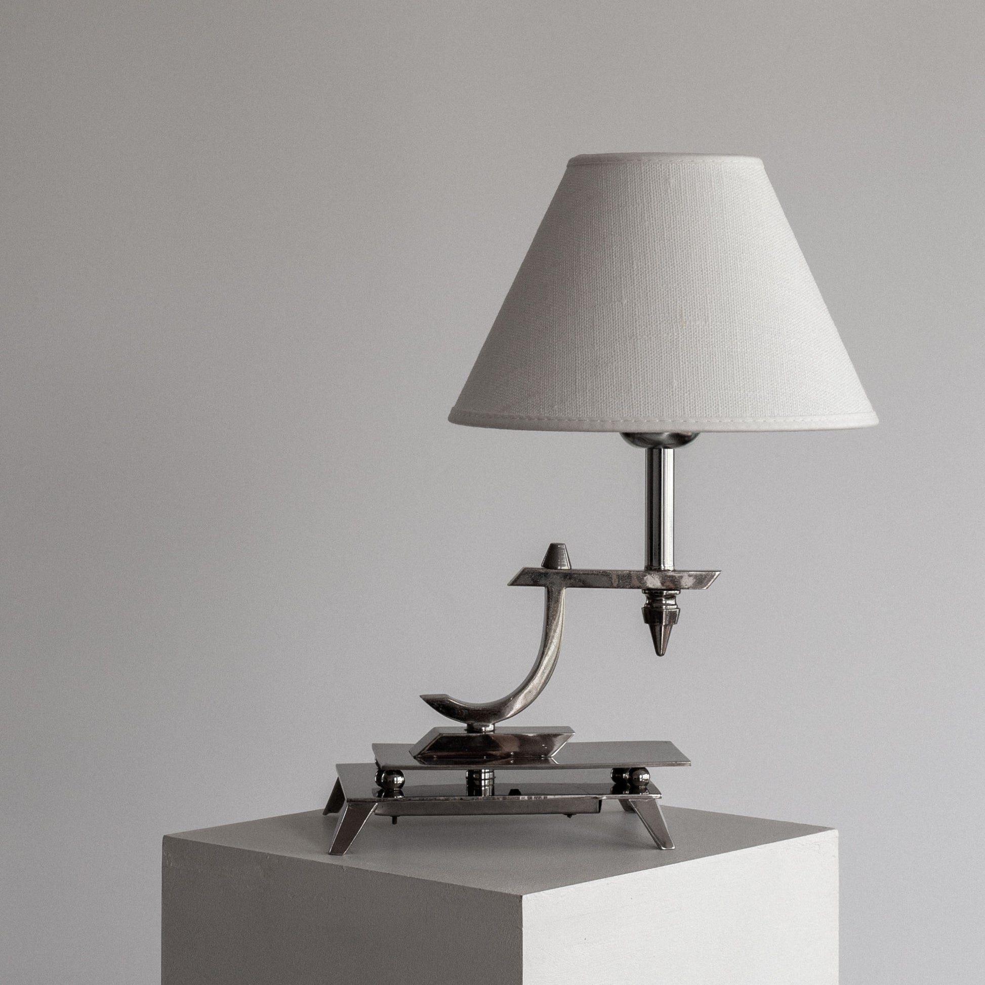 Art Deco table lamp from the 1930s, likely of Austrian or German origin. Crafted from nickel-plated metal and built with remarkable attention to detail, the lamp features a sculptural form that's captivating from all angles. The interplay of sharp and curved elements creates a dramatic silhouette that perfectly illustrates Art Deco's forward-thinking aesthetic. This lamp represents a rare example of interwar European lighting design.